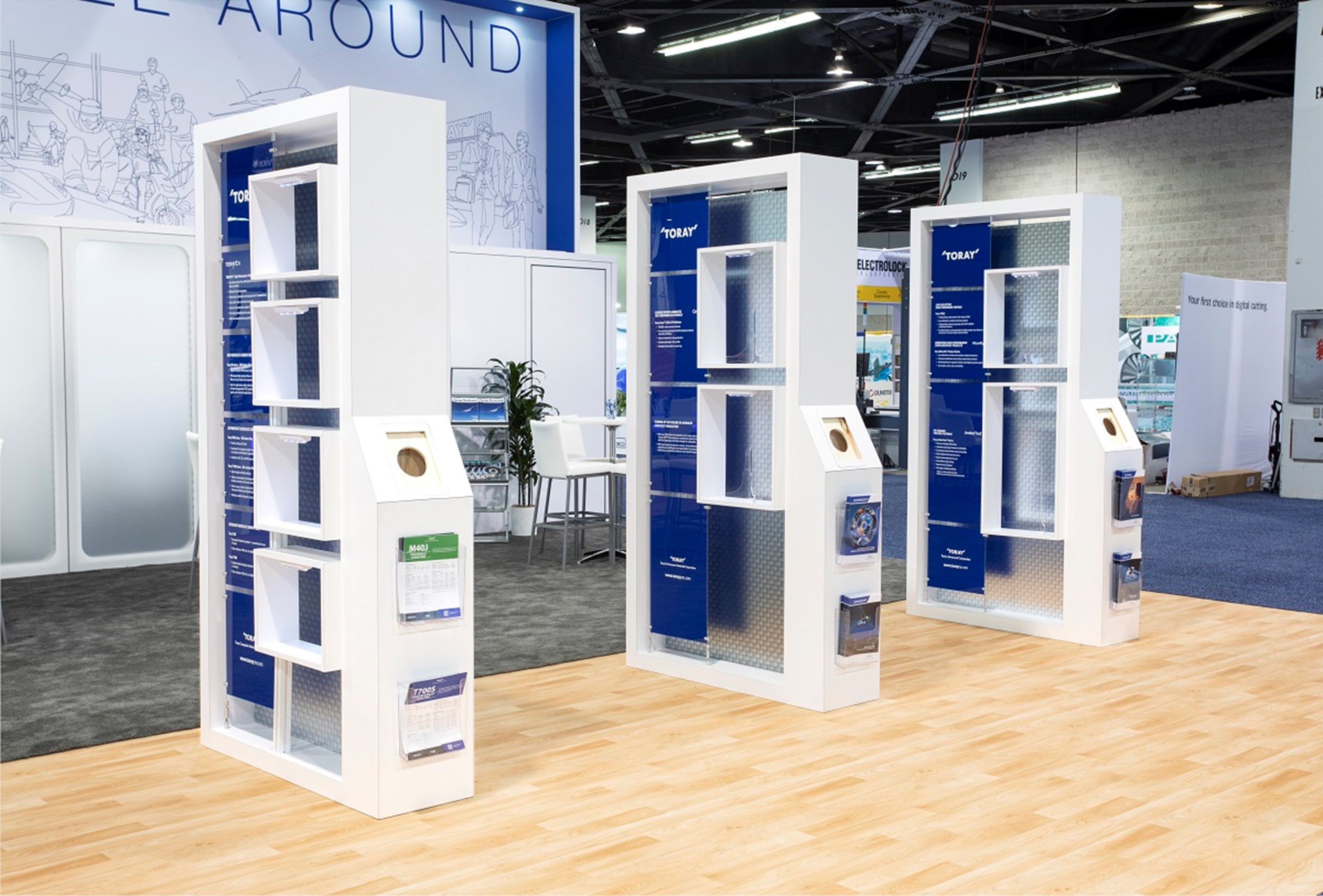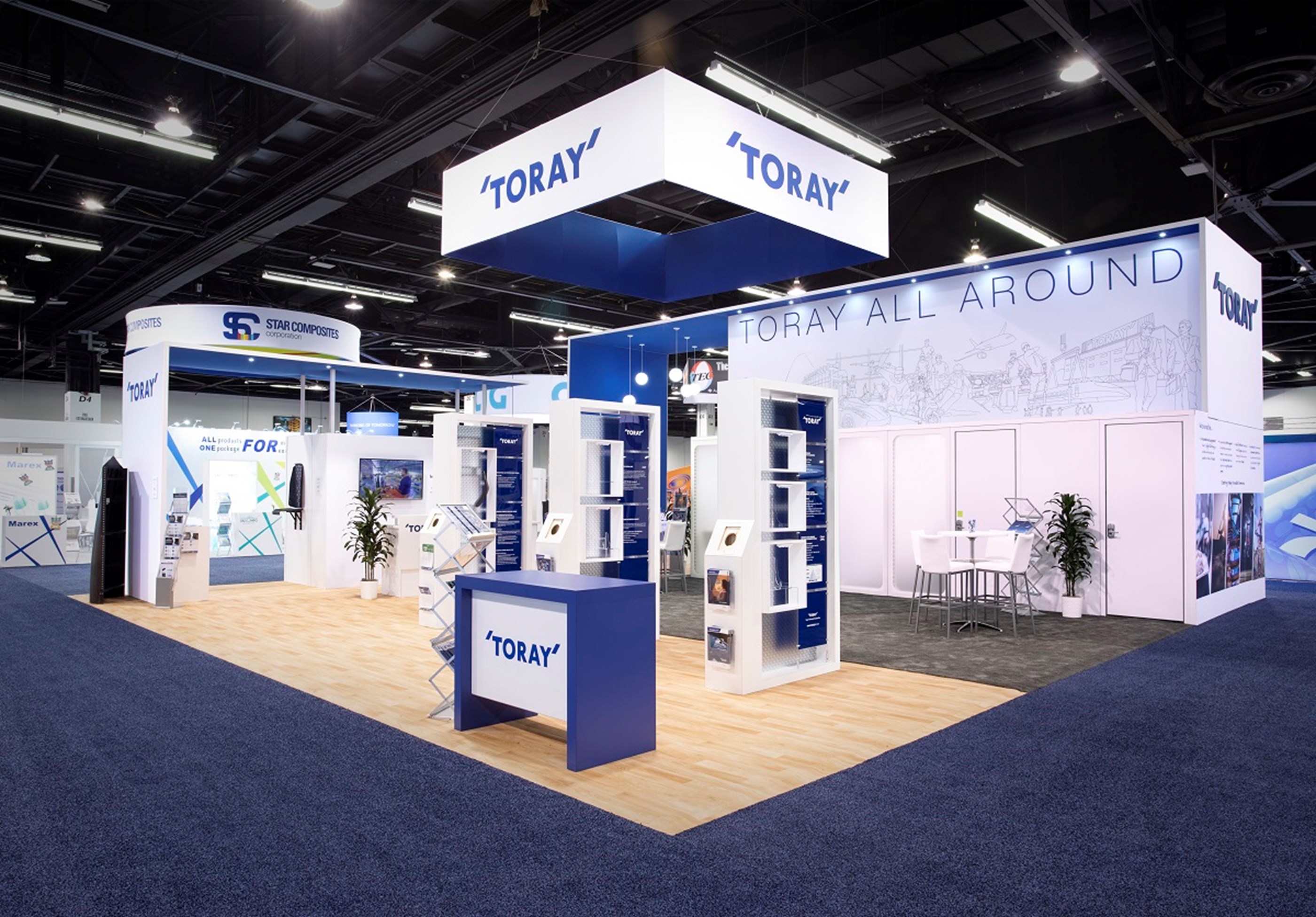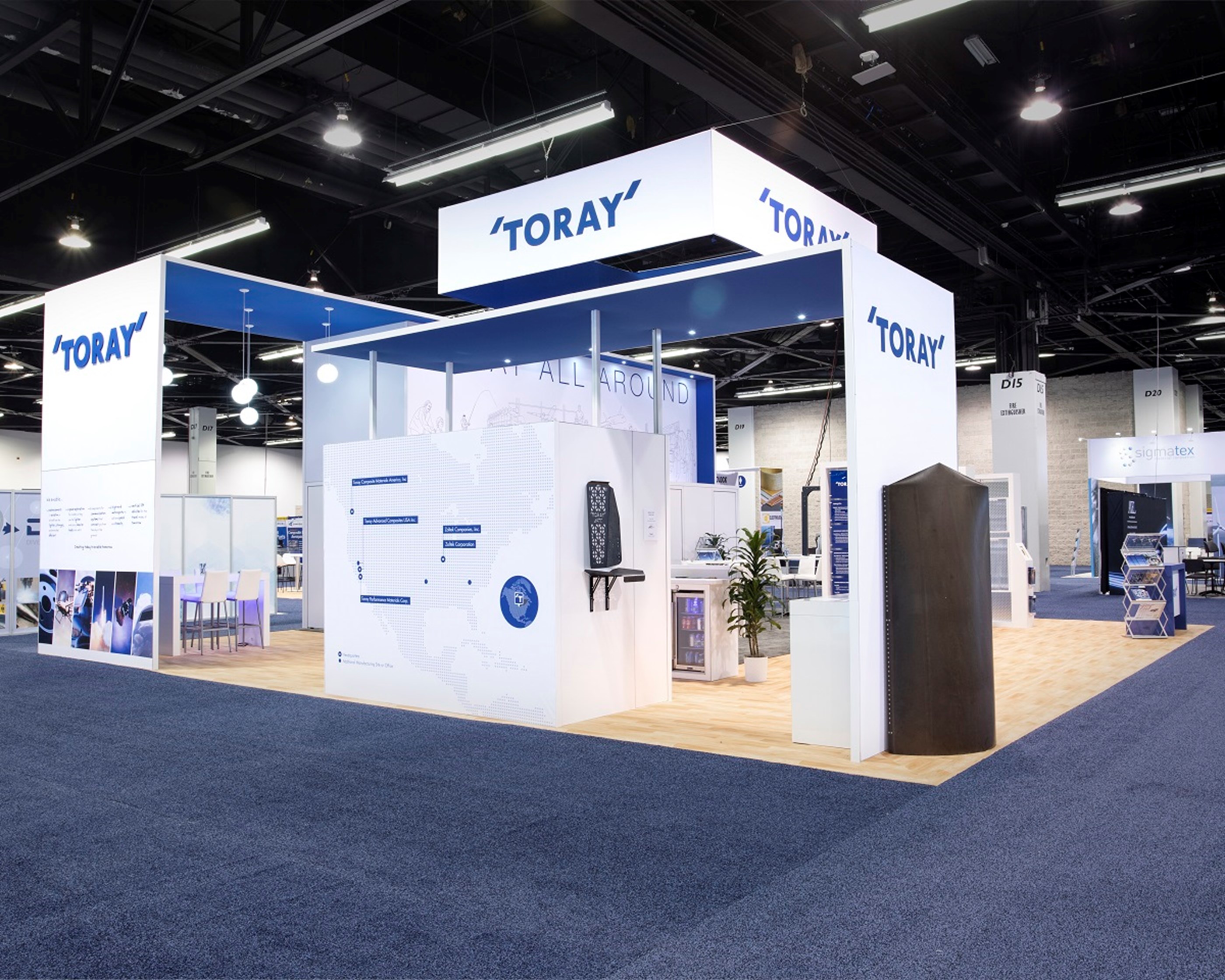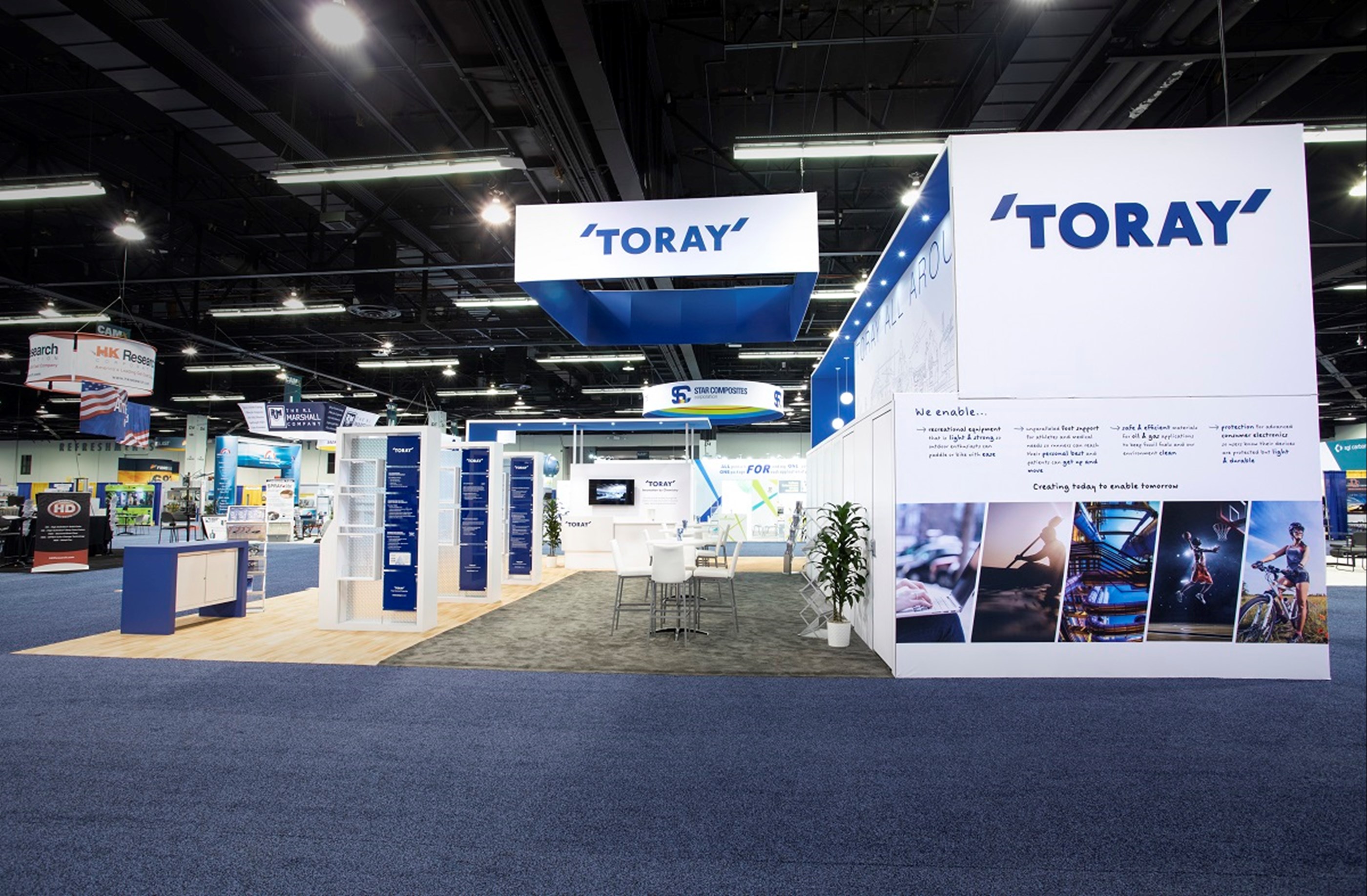 Toray was looking for a new partner, their team described it as “a vendor to lean on for our trade show needs.” Ion Exhibits quickly became their trusted adviser and partner. With newly developed brand guidelines, they were seeking a trade show booth that emulated their fresh new brand. Our team was invited to visit the newly remodeled facility for design inspiration. The client wanted modern clean lines, with a touch of human elements to make the exhibit both personable and approachable. Mimicking textures of soft accents with defined straight lines helped showcase their products. They needed help focusing on the attendee journey path and how to highlight their new products without creating a bottle neck around them.