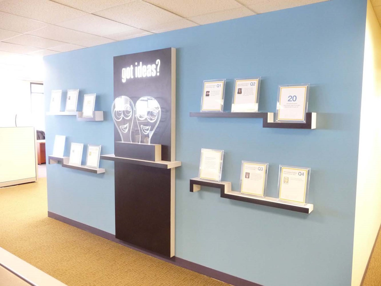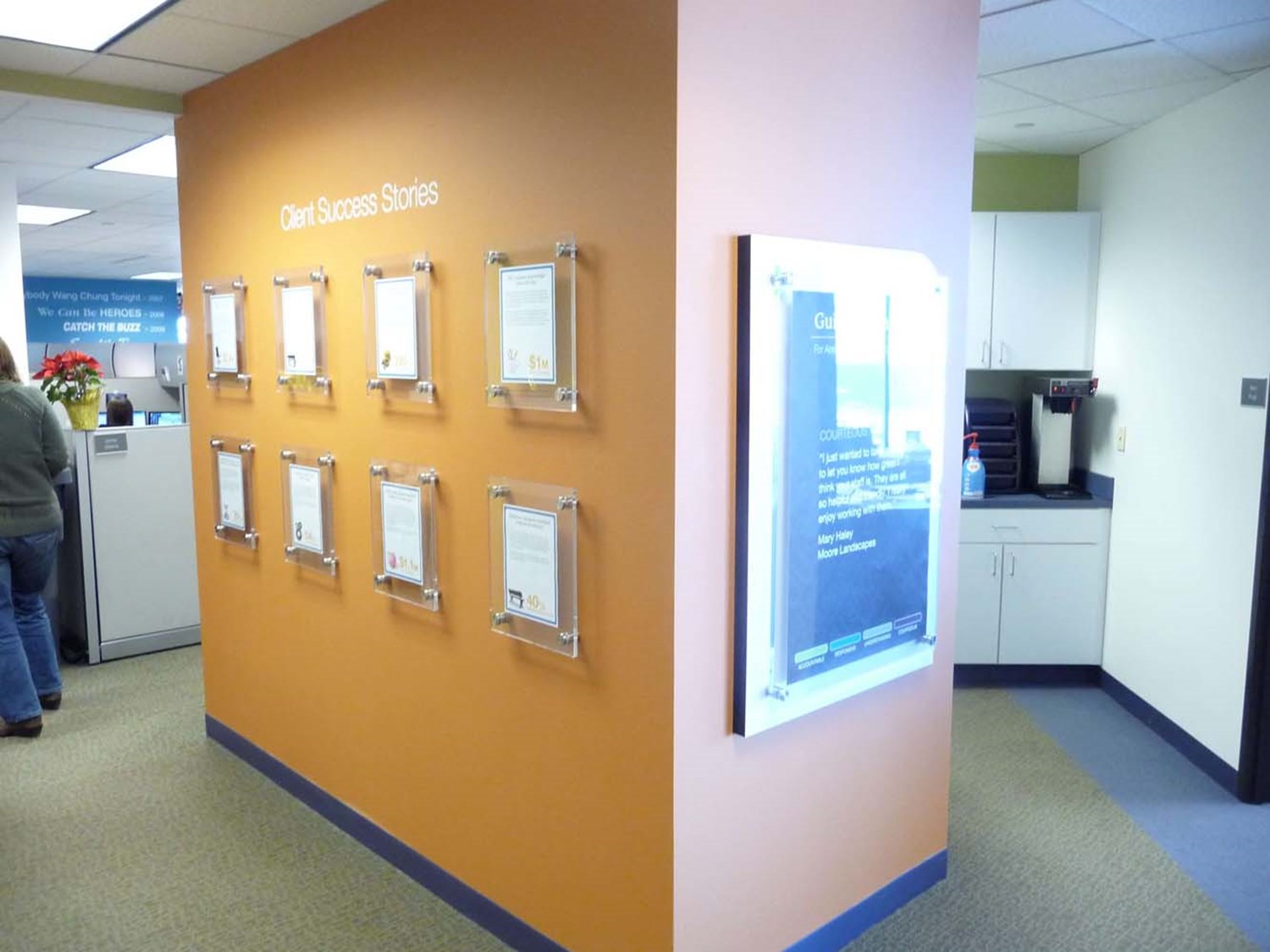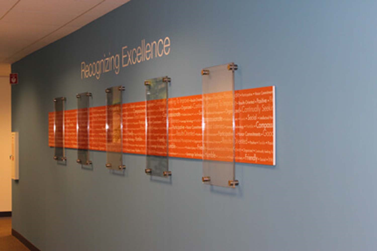 Branded design gives life to corporate interior space, leaving a lasting impression on clients and employees. Using our expertise in design, we take advantage of different media and space such as custom vinyl text on walls, three-dimensional raised signs and clear plexiglass structures to highlight literature with standoffs. Modern laminate shelving along with backlighting capabilities are also available.