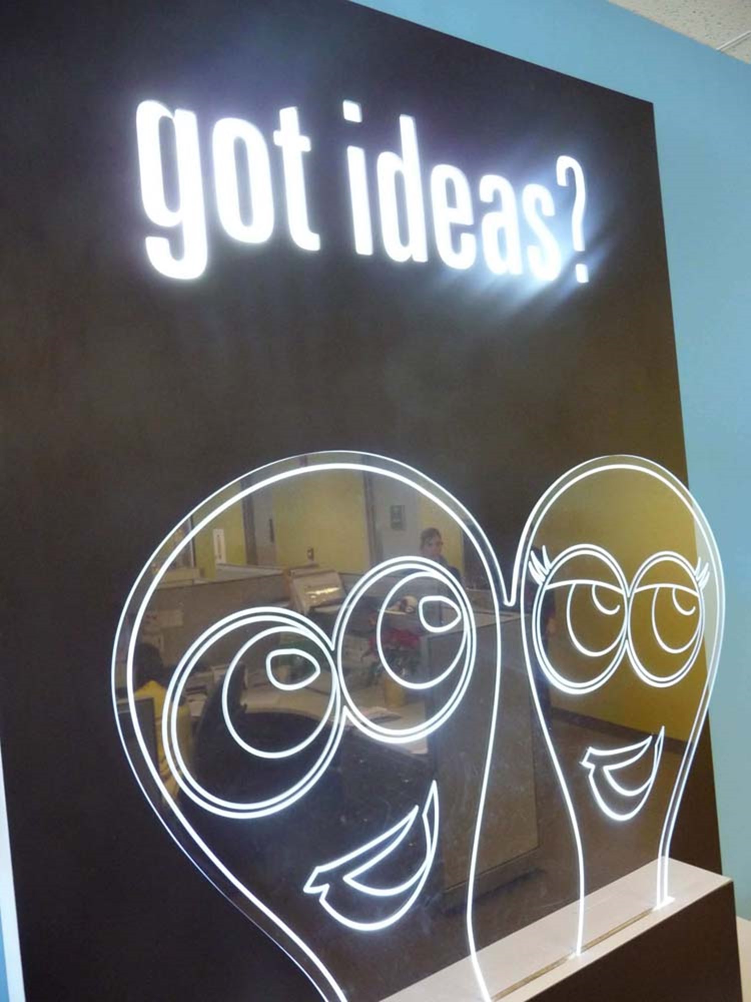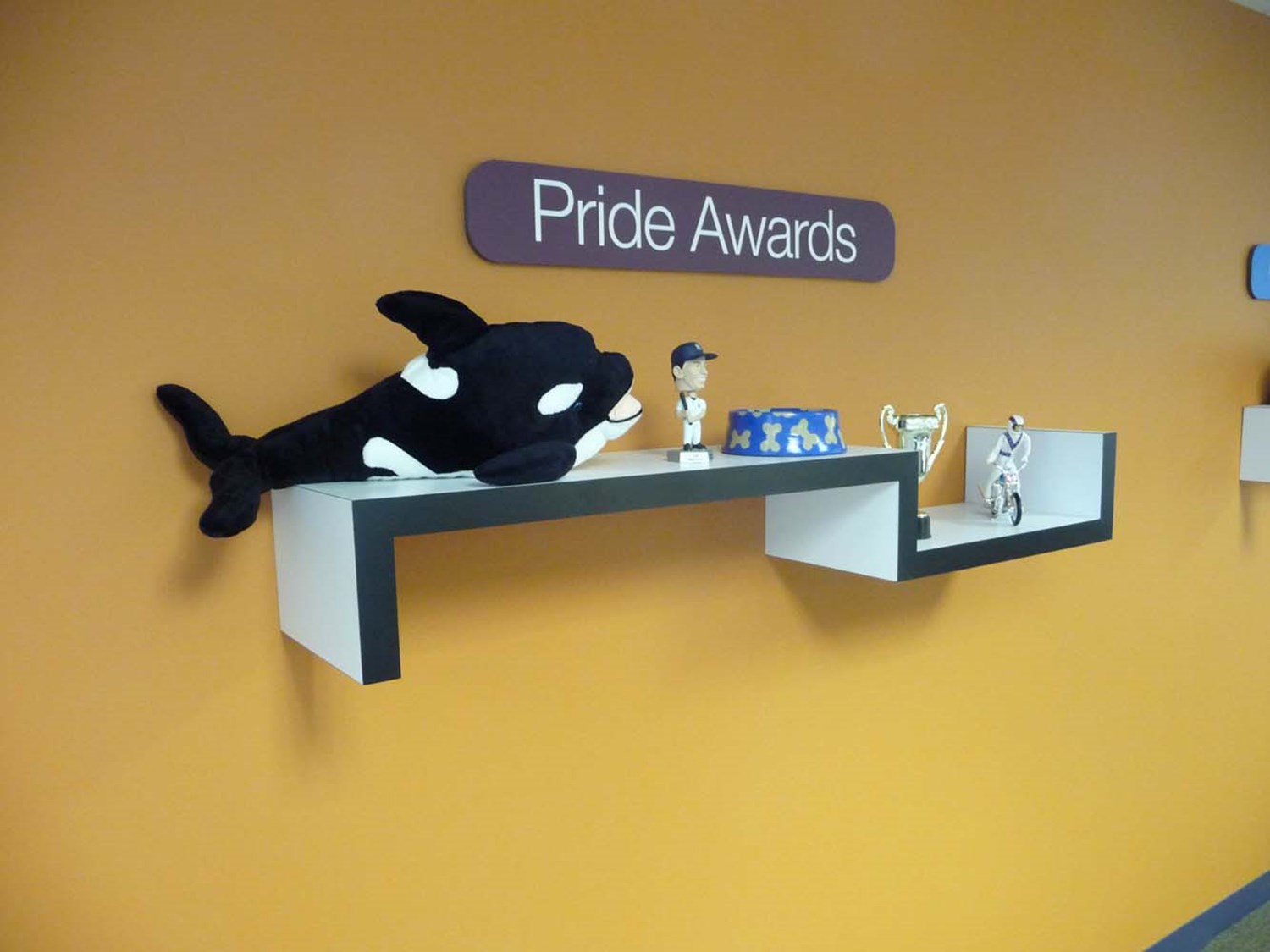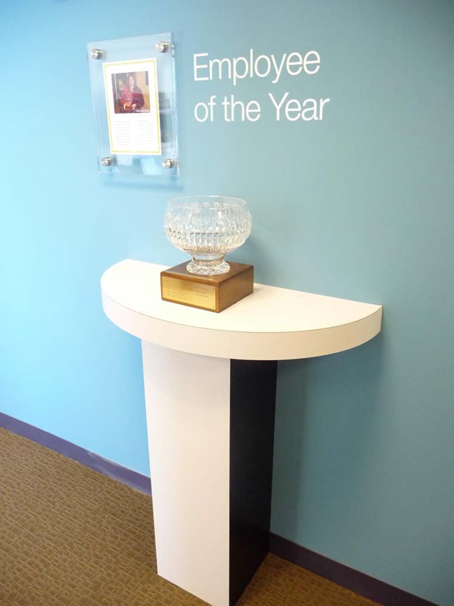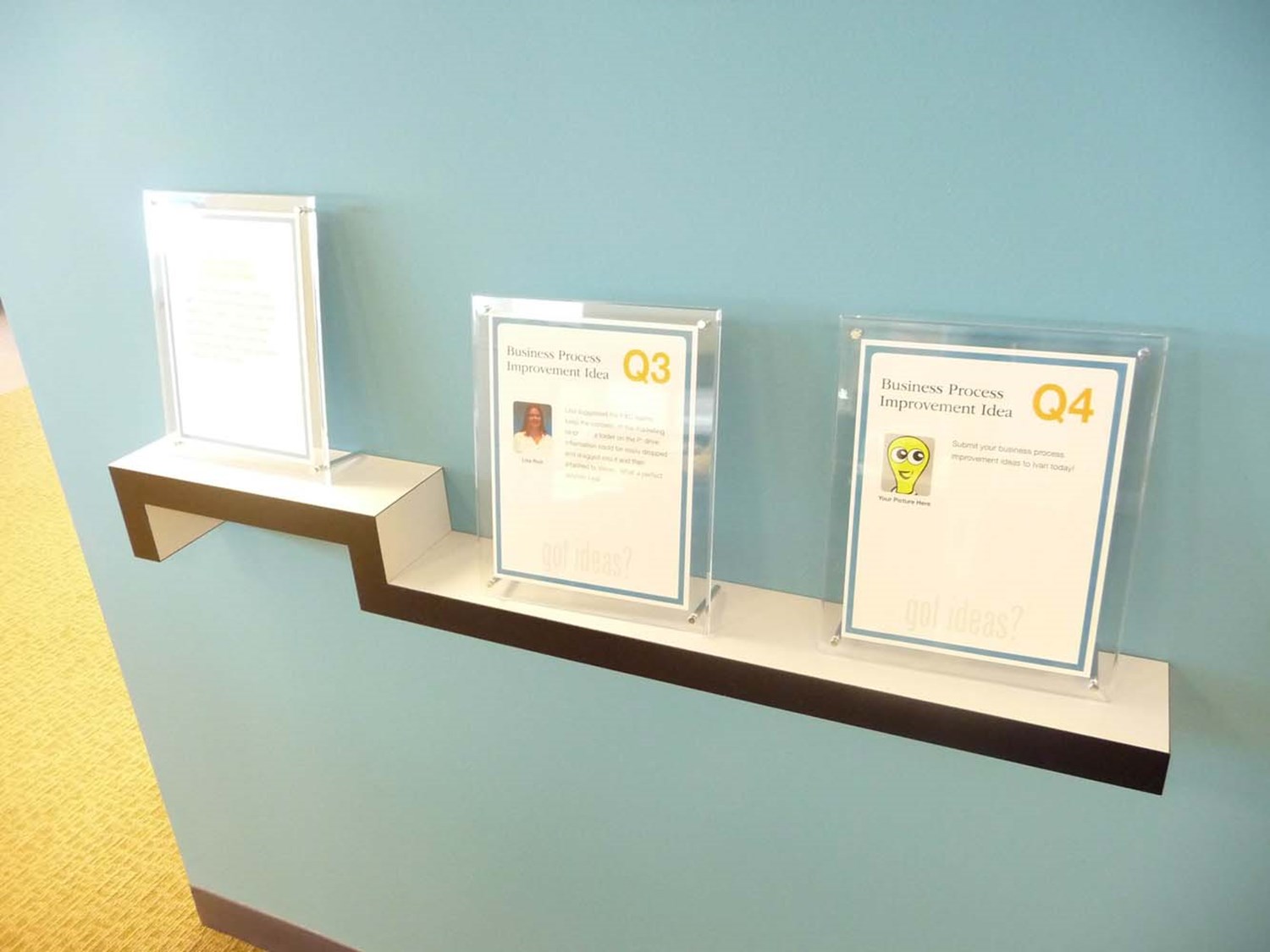 Branded design gives life to corporate interior space, leaving a lasting impression on clients and employees. Using our expertise in design, we take advantage of different media and space such as custom vinyl text on walls, three-dimensional raised signs and clear plexiglass structures to highlight literature with standoffs. Modern laminate shelving along with backlighting capabilities are also available.