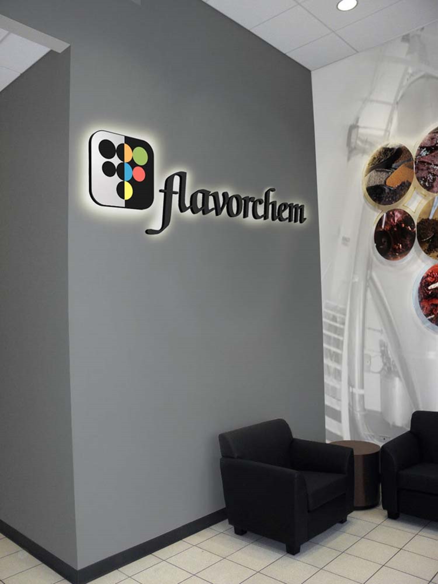Acrylic painted logo mounted on the lobby wall is a striking element that no one can miss. Custom colors and characters are available. The digitally printed back wall with the three-dimensional round graphics elevate the room and transform a basic wall into a vision. The vinyl text on the walls ensures visitors and employees are reminded of company’s goals, encouraging more business and creating a positive environment for employees.