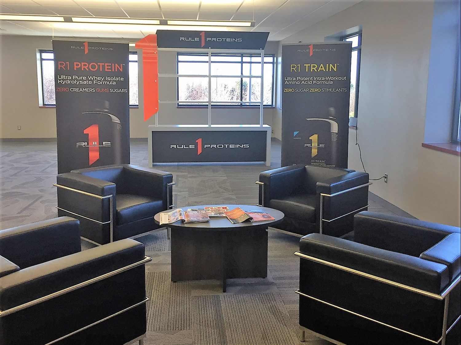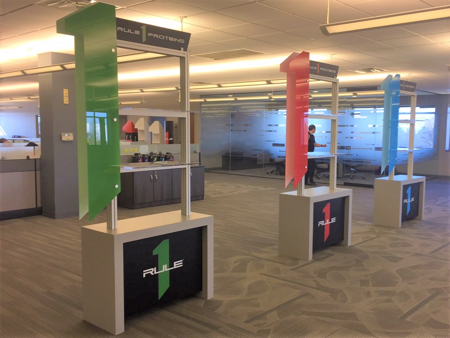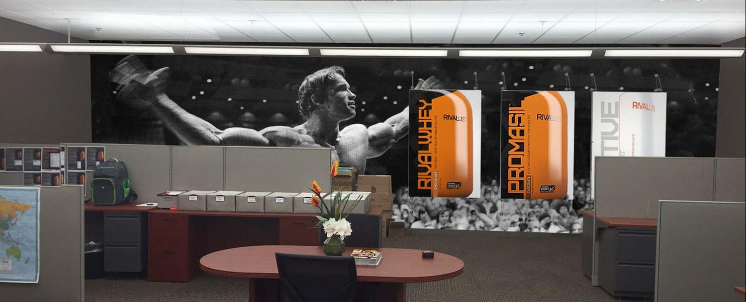 To create a signature environment, we focused on developing a unique link to the company's brand and space by incorporating multi-panel graphics which allowed the imagery to do the talking. The outcome is a workplace resonating with the brand's culture and values. The display cases bring to life the company's product with vivid colors and bold logos create a focal point.