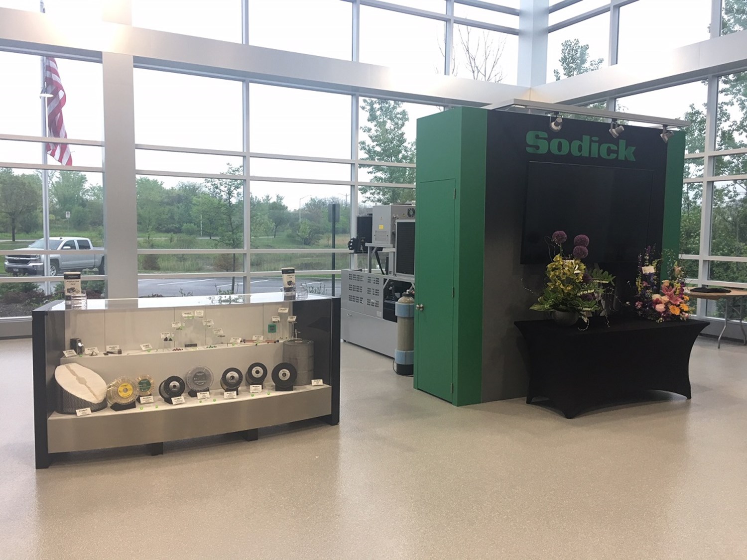 Many dimensions of the company are transmitted through text on custom lit kiosks. Color and high-definition graphics on the custom kiosks serve as visuals to show the company's capabilities and values. The focal point remains the three-dimensional wall mounted logo along with the brushed aluminum mounted map. Track lighting was also added.