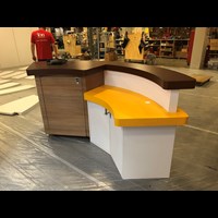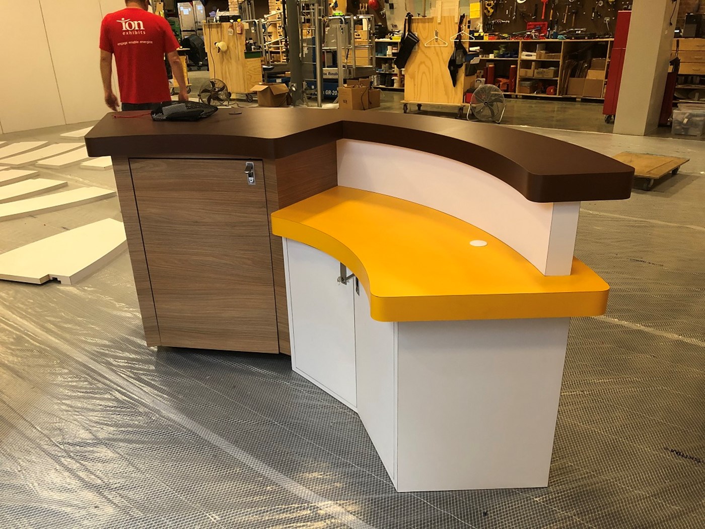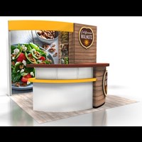 8' Tall backwall with curved pillow-case curved accent graphic. Pillow-case dimensional mounted logo.