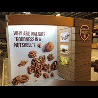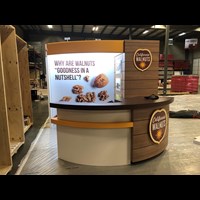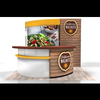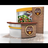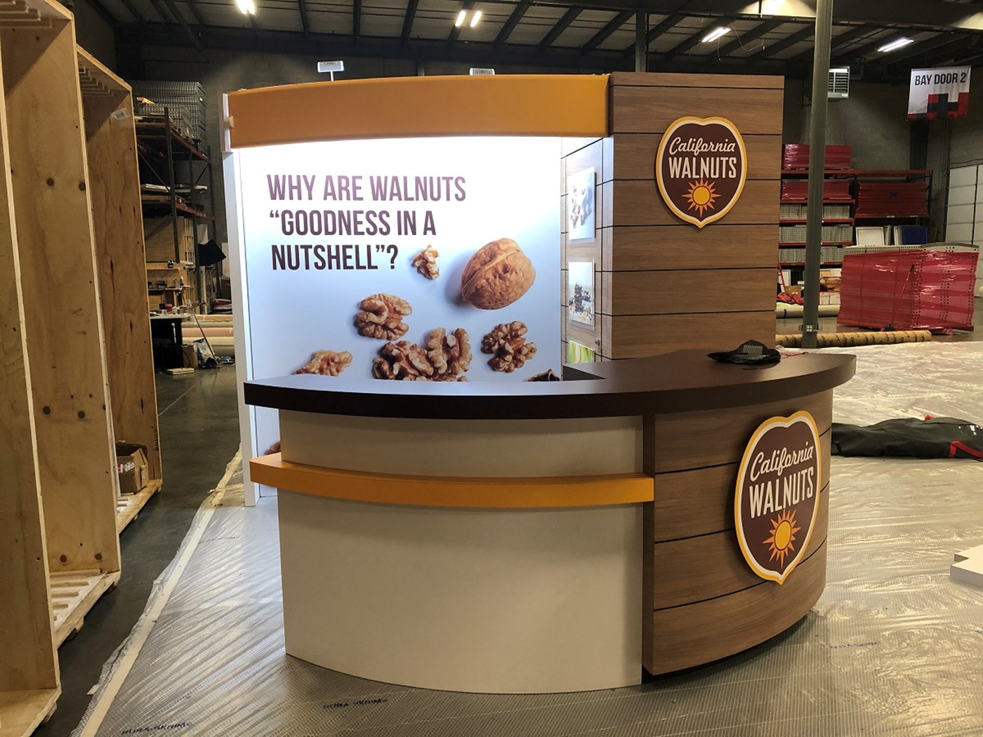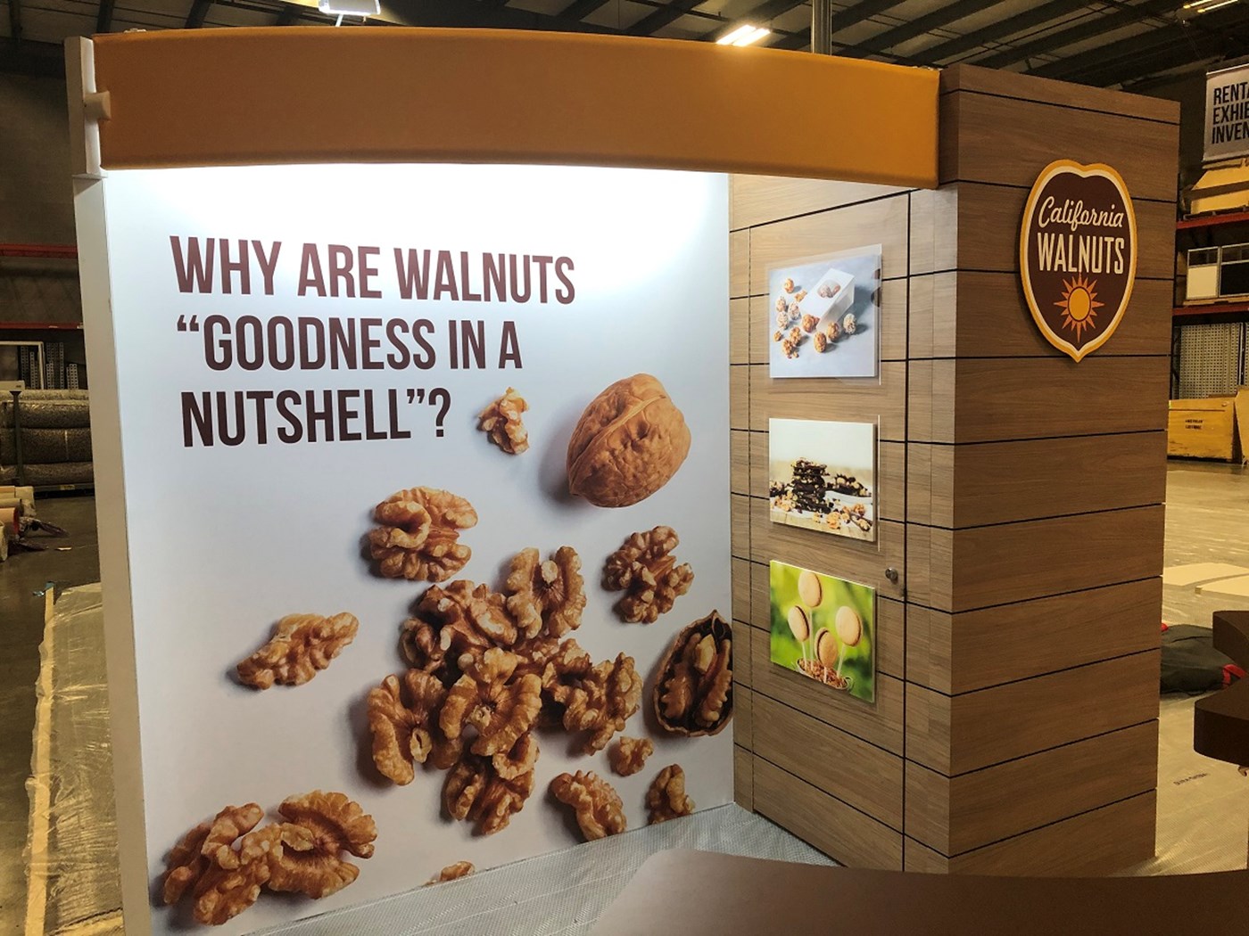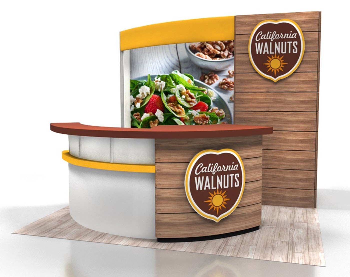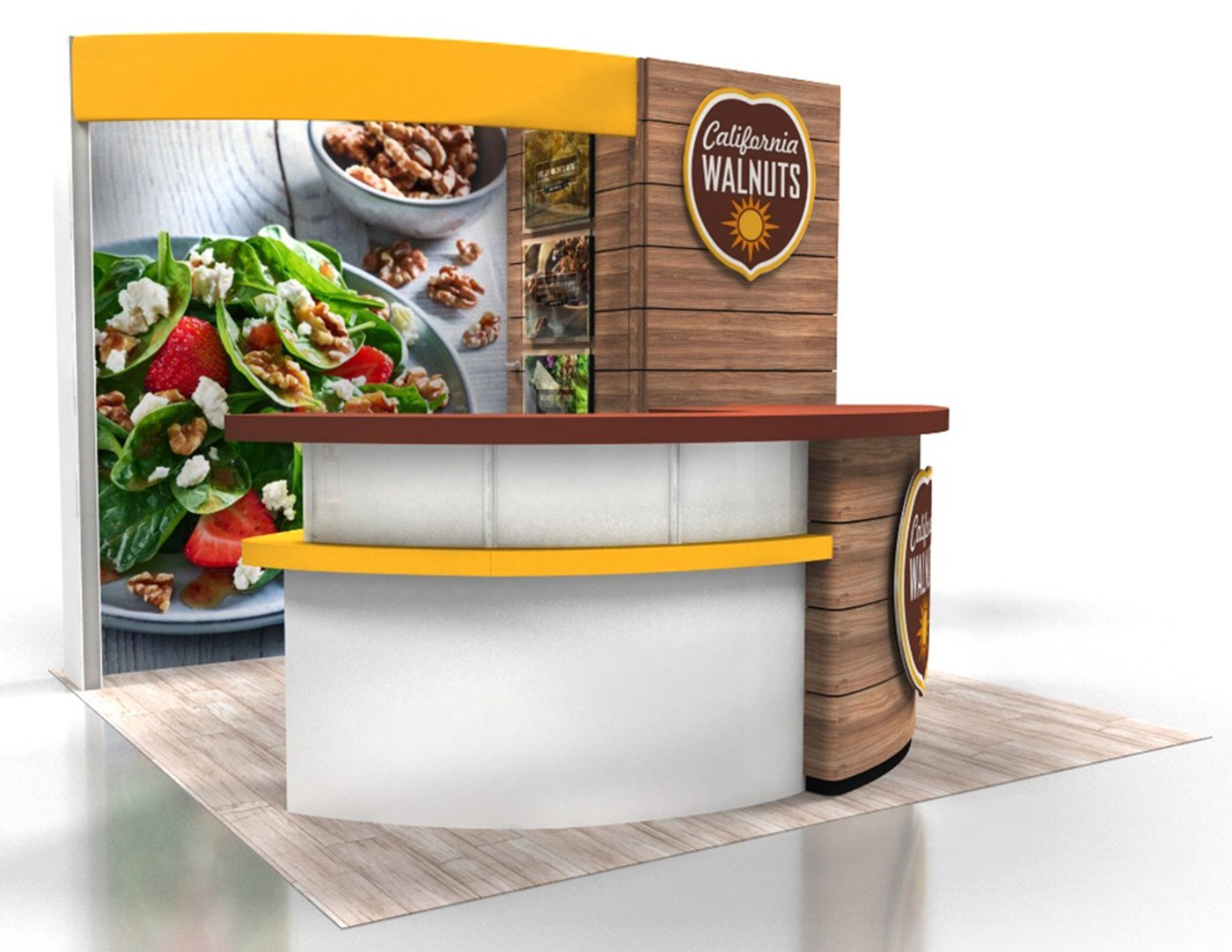 10' x 10' Custom inline exhibit constructed of wood plank horizontal panels, pre-assembled aluminum FOUNDATION panels for custom appeal and tool-less installation. Large format graphics printed in-house for superior color saturation and taut finish.