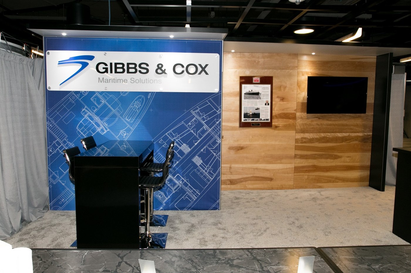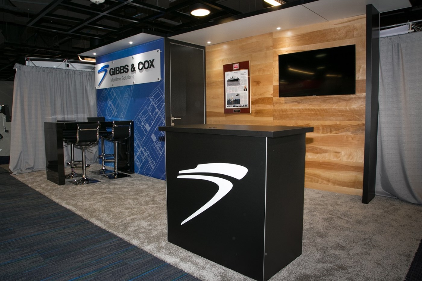 Options include (2) ceiling canopies with integrated LED down-lighting, stand-off acrylic graphic and key-less locking reception counter with graphic.