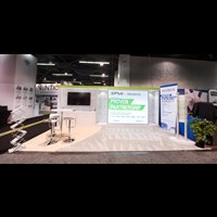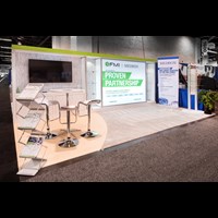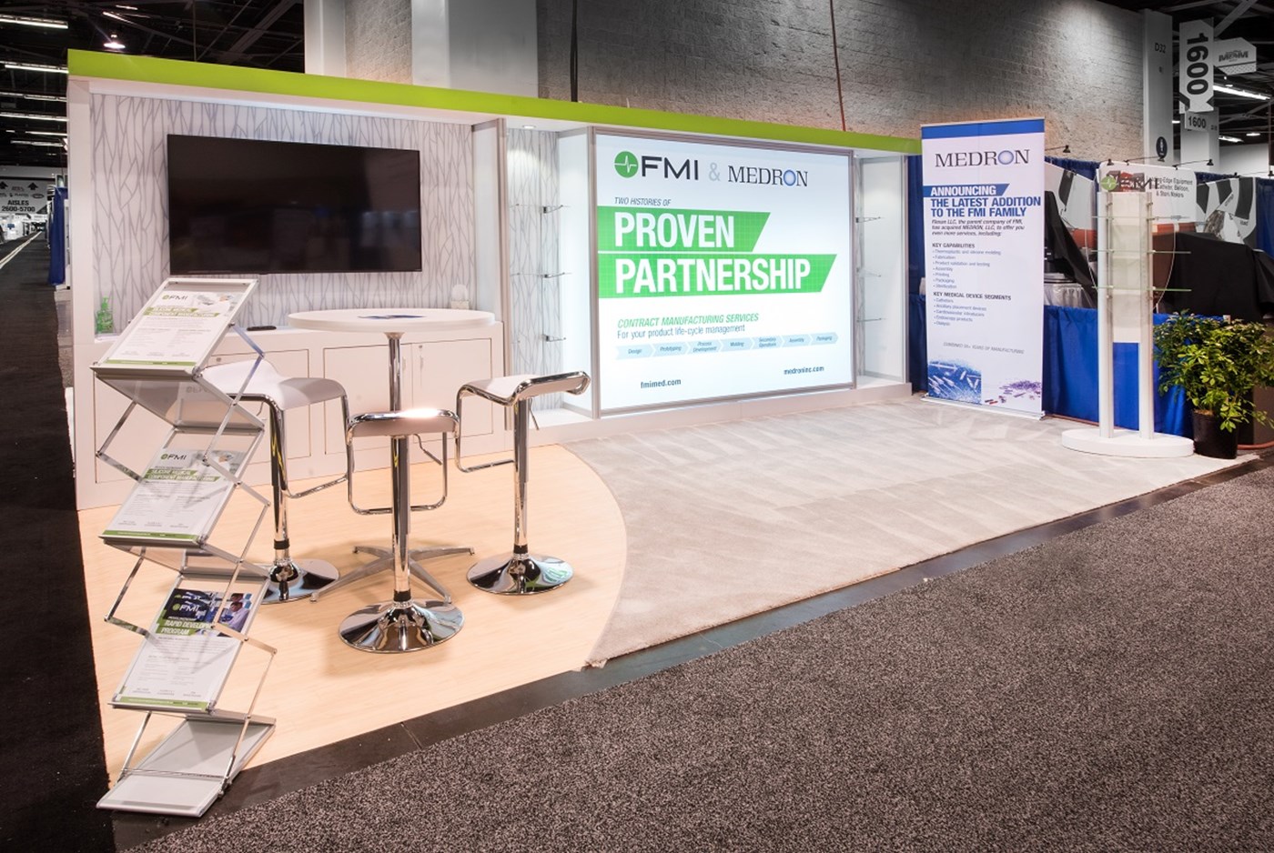 Modern style trade show display with linear design features, laminated canopy and base, large backlit graphic and product kiosks.