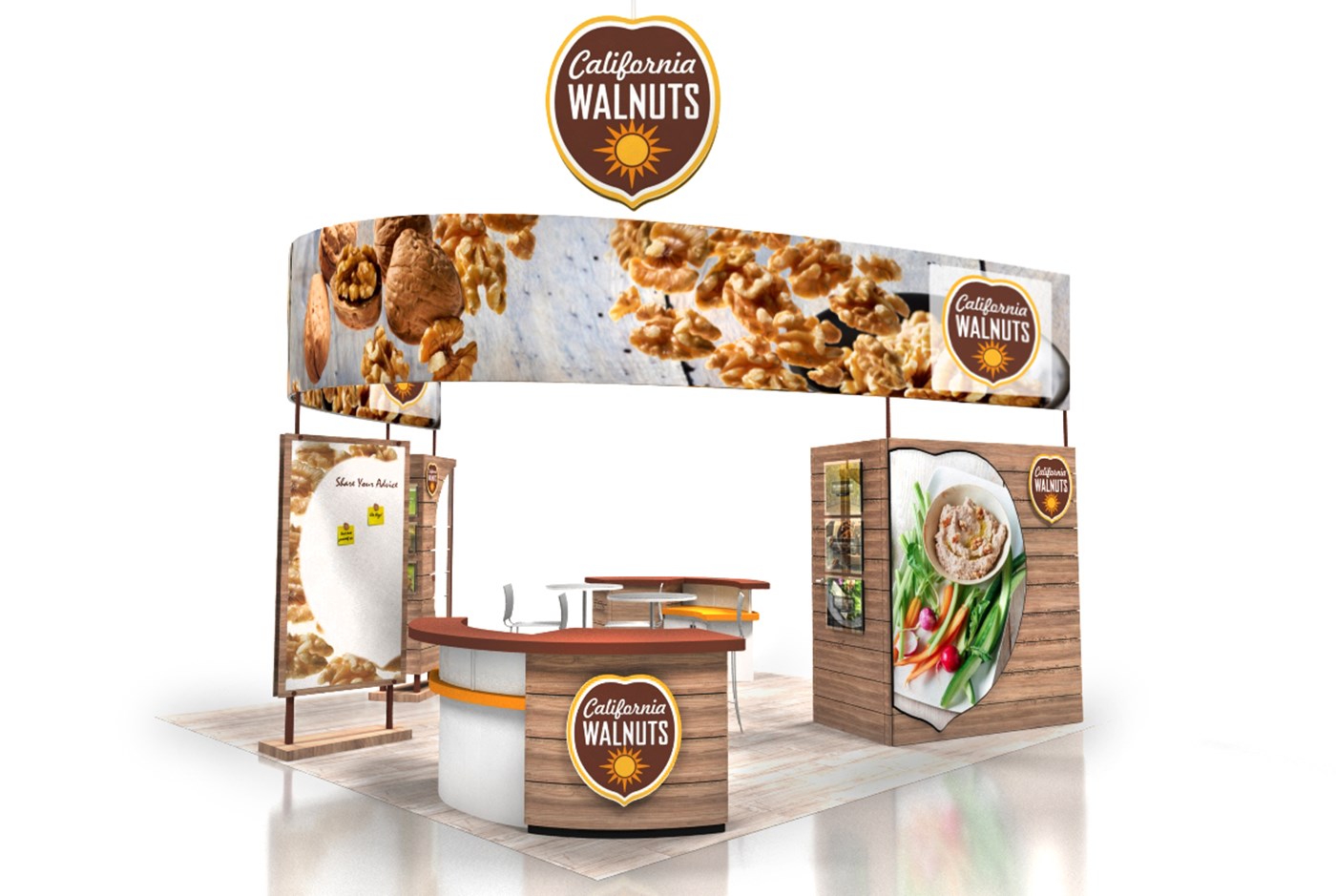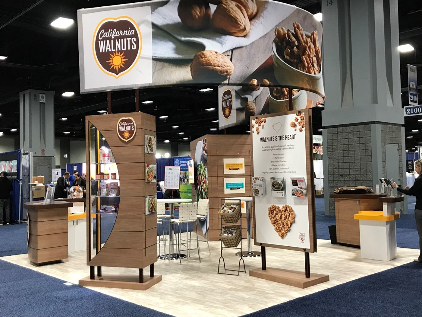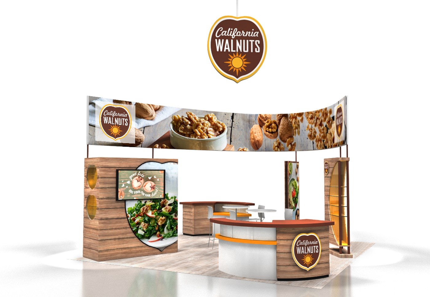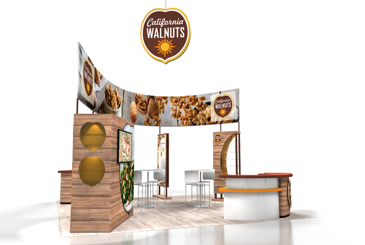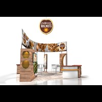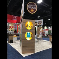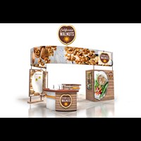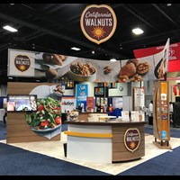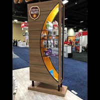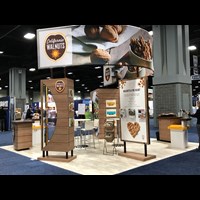 20' x 20' Custom exhibit with wood laminate accents with reveals throughout. Closet & kiosk features profile cut shadow boxes with acrylic shelving, laminate accents, free form pillow-case dye-sublimation graphics and LED down-lighting. Double-sided curved pillowcase header graphic and free-form hanging sign with 2" diameter aluminum tubing.