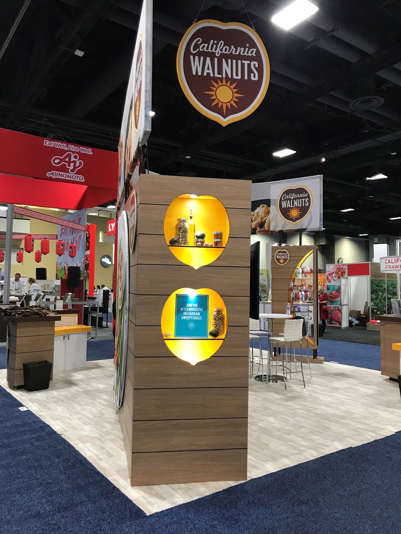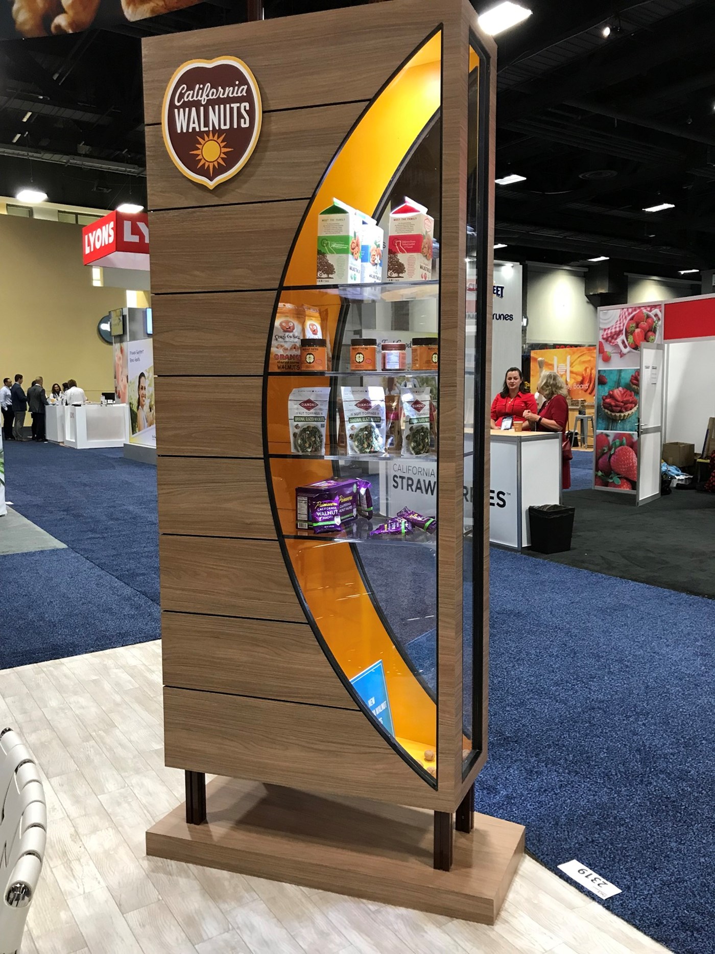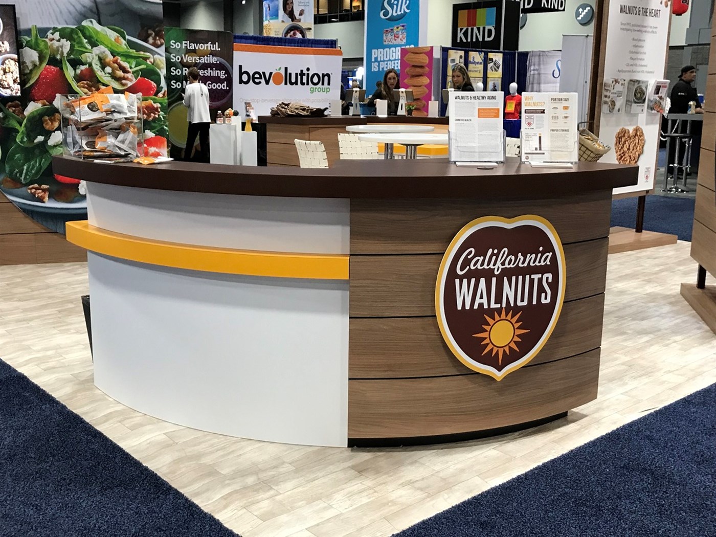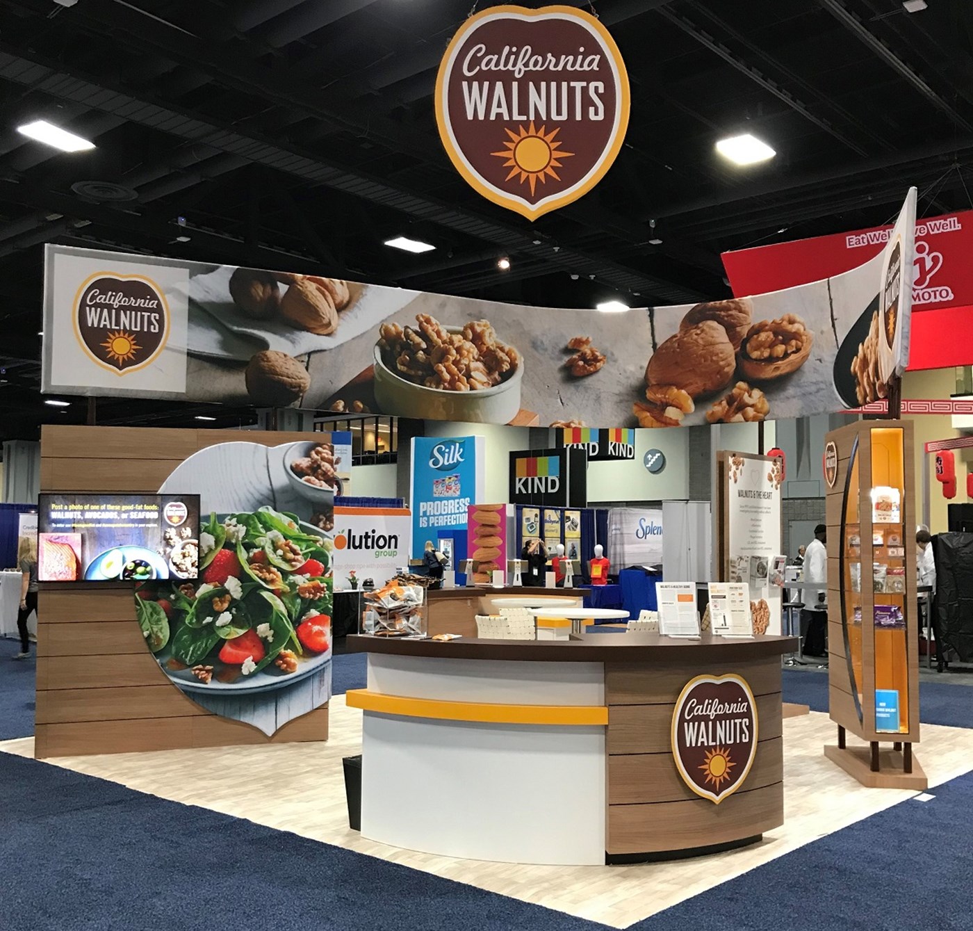 20' x 20' Custom exhibit with wood laminate accents with reveals throughout. Closet & kiosk features profile cut shadow boxes with acrylic shelving, laminate accents, free form pillow-case dye-sublimation graphics and LED down-lighting. Double-sided curved pillowcase header graphic and free-form hanging sign with 2" diameter aluminum tubing.
