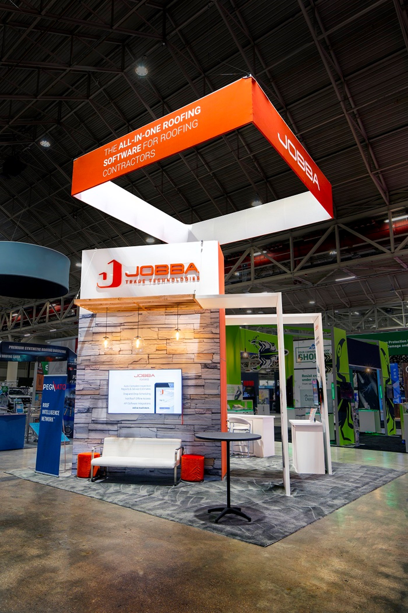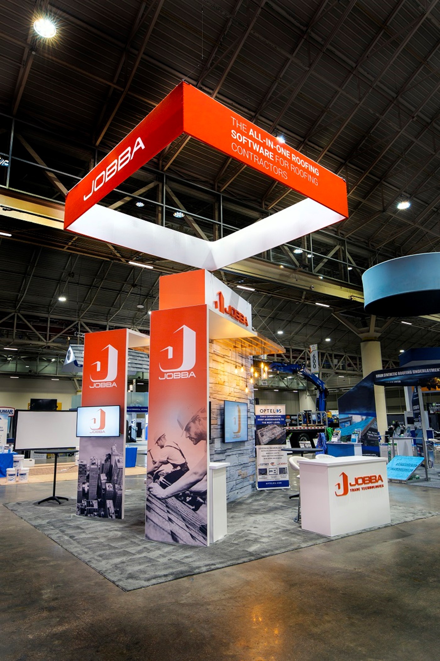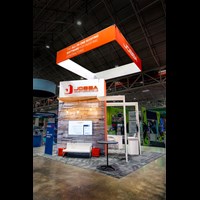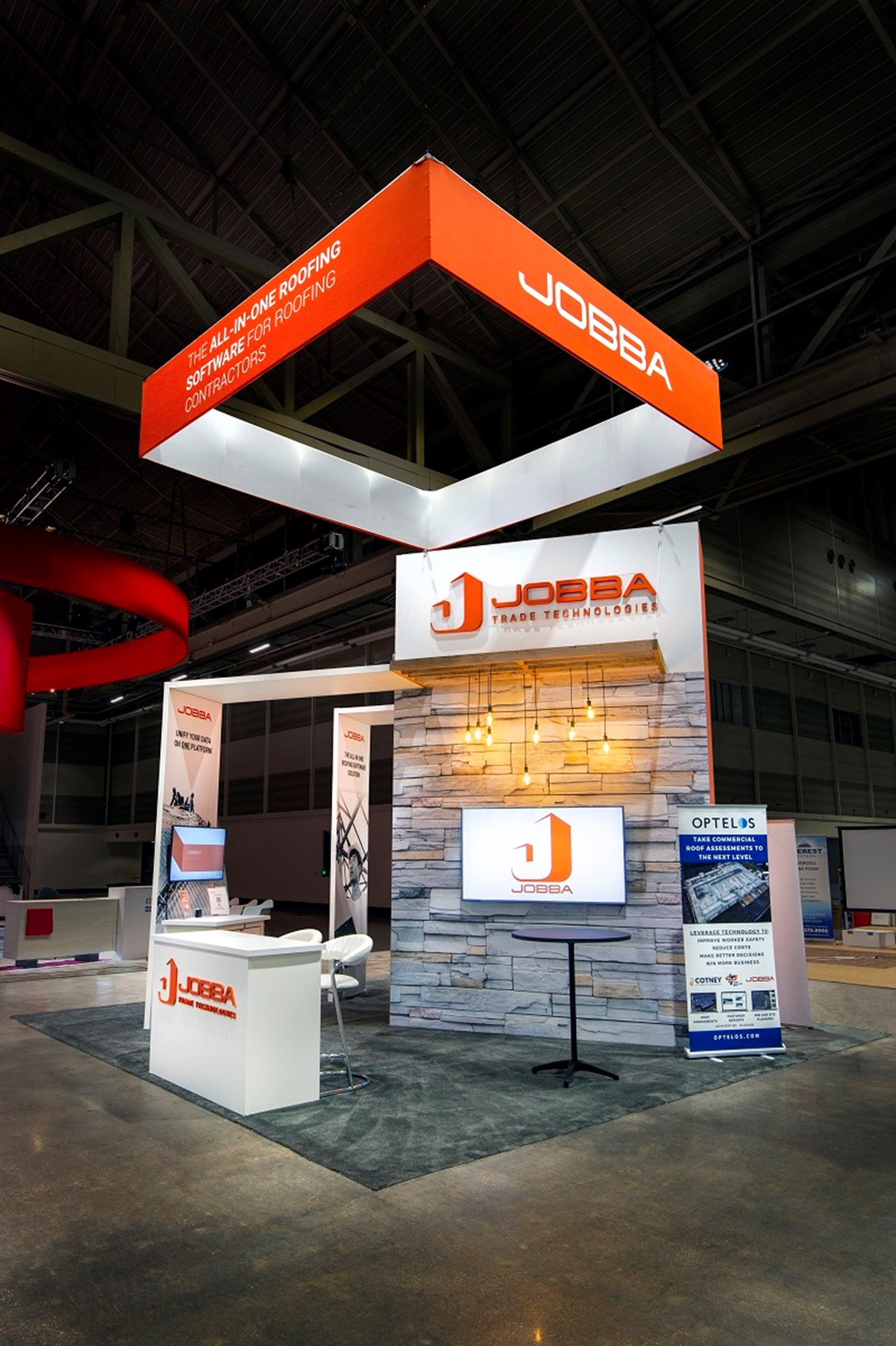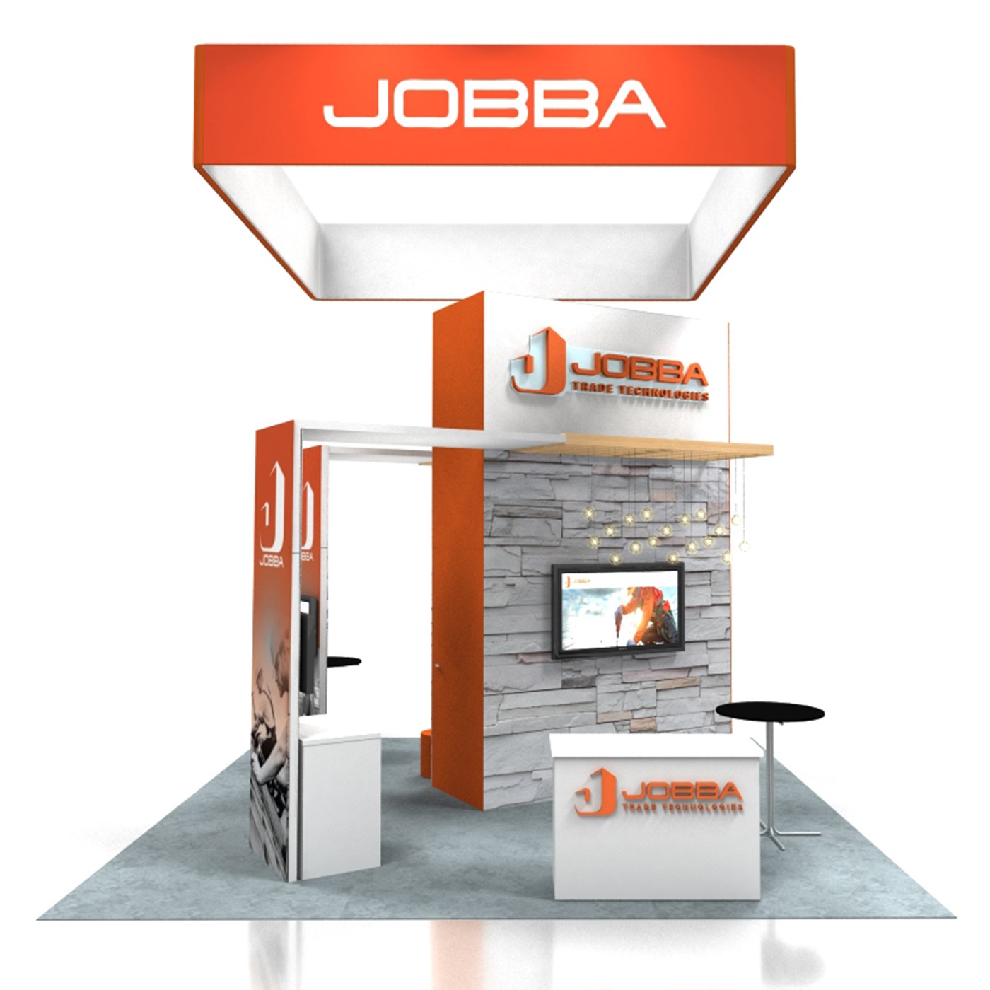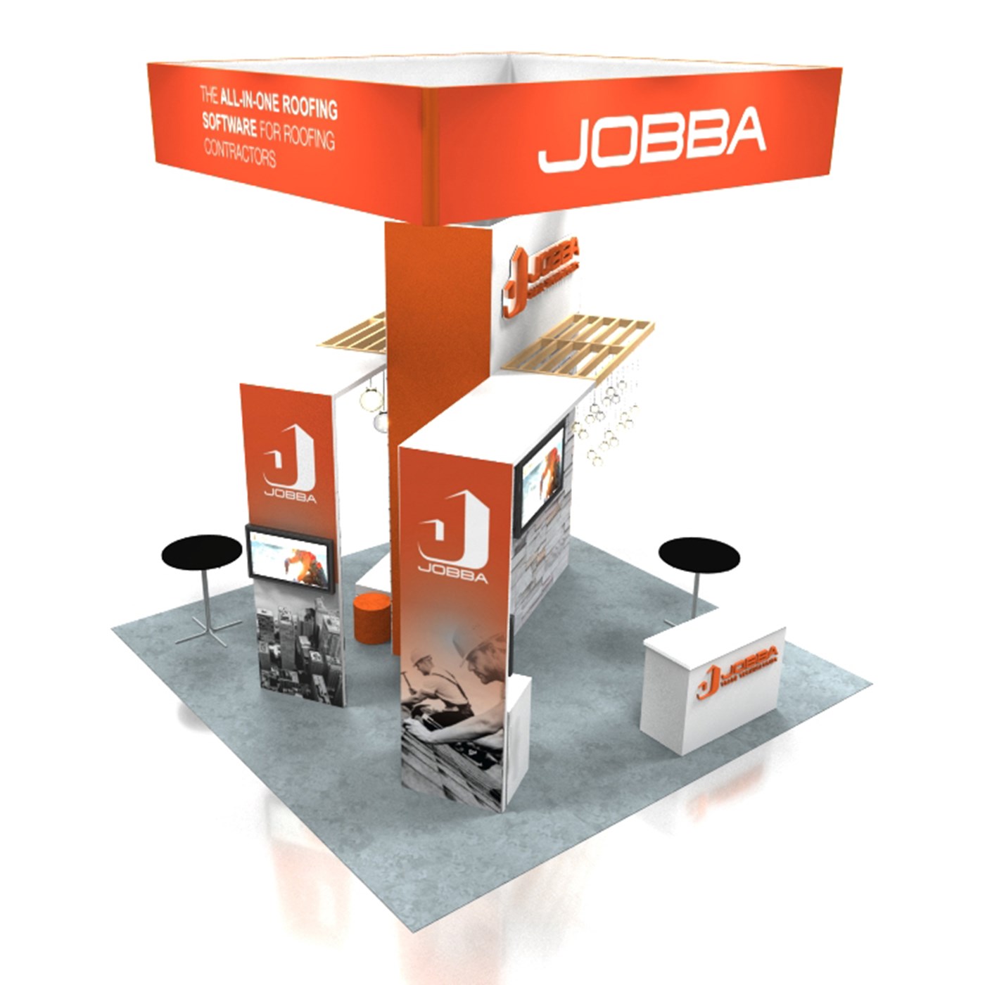 16' Tall tower with tension fabric graphics with Perfect Corners, walk-in locking storage, (2) slat wood canopies with pendant lighting. (2) Demo kiosks with double-sided tension fabric graphics and 24" x 48" key-less locking laminated cabinets.
