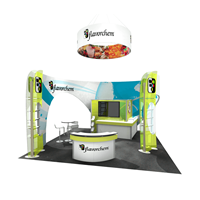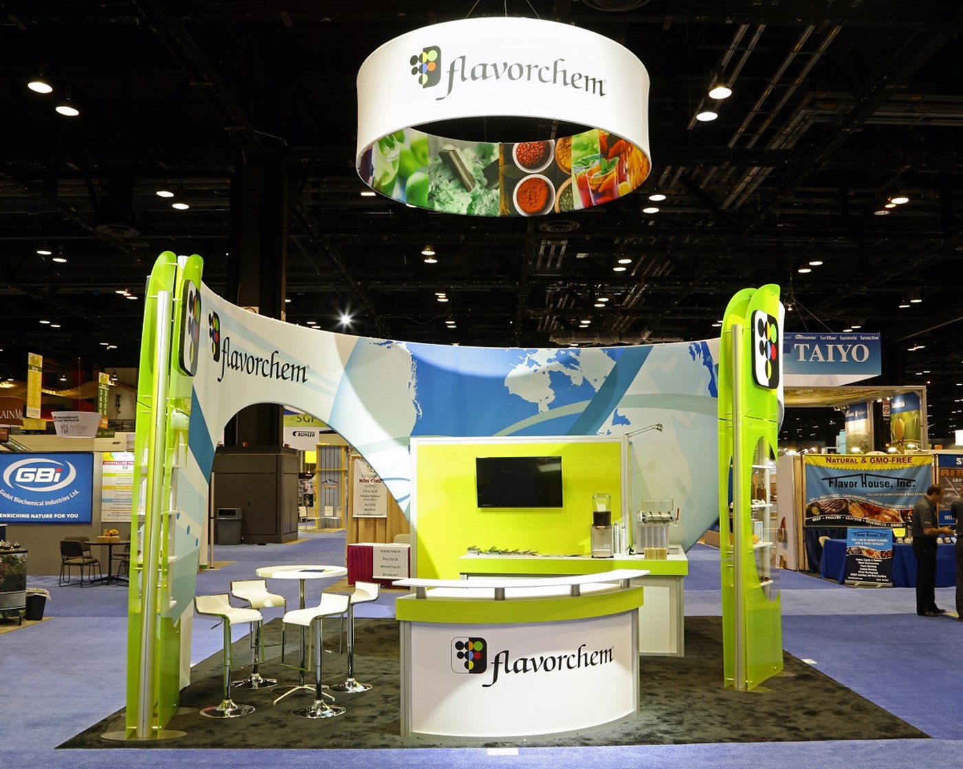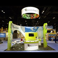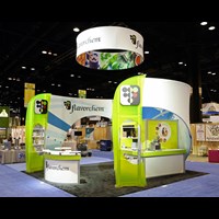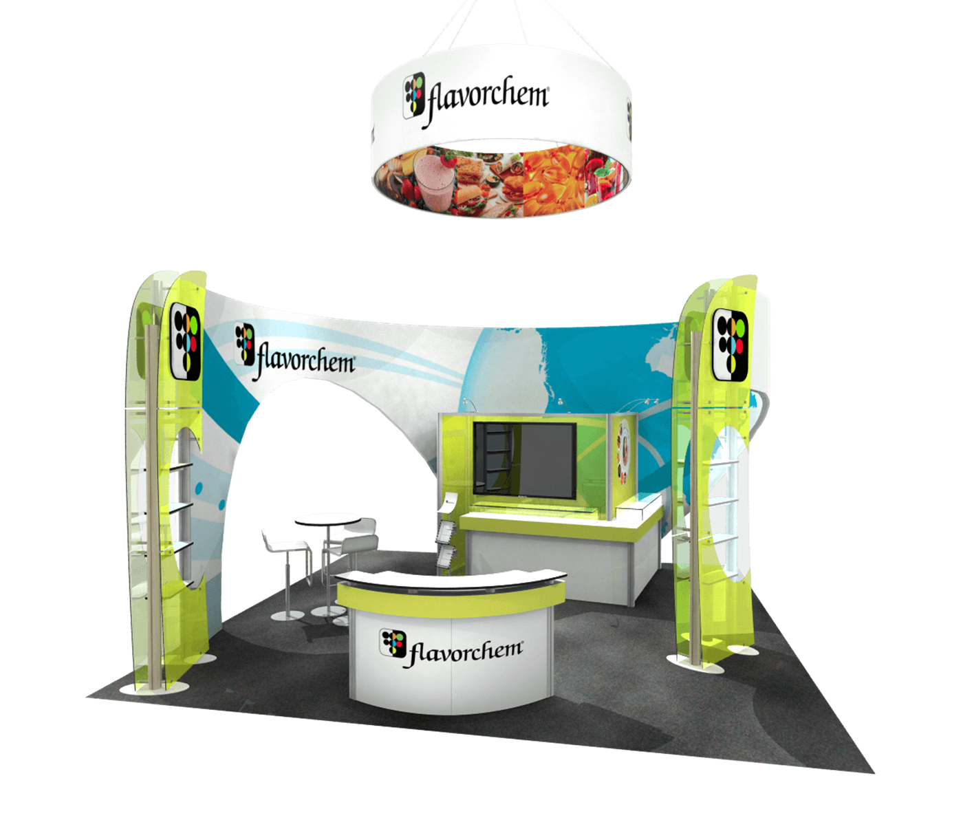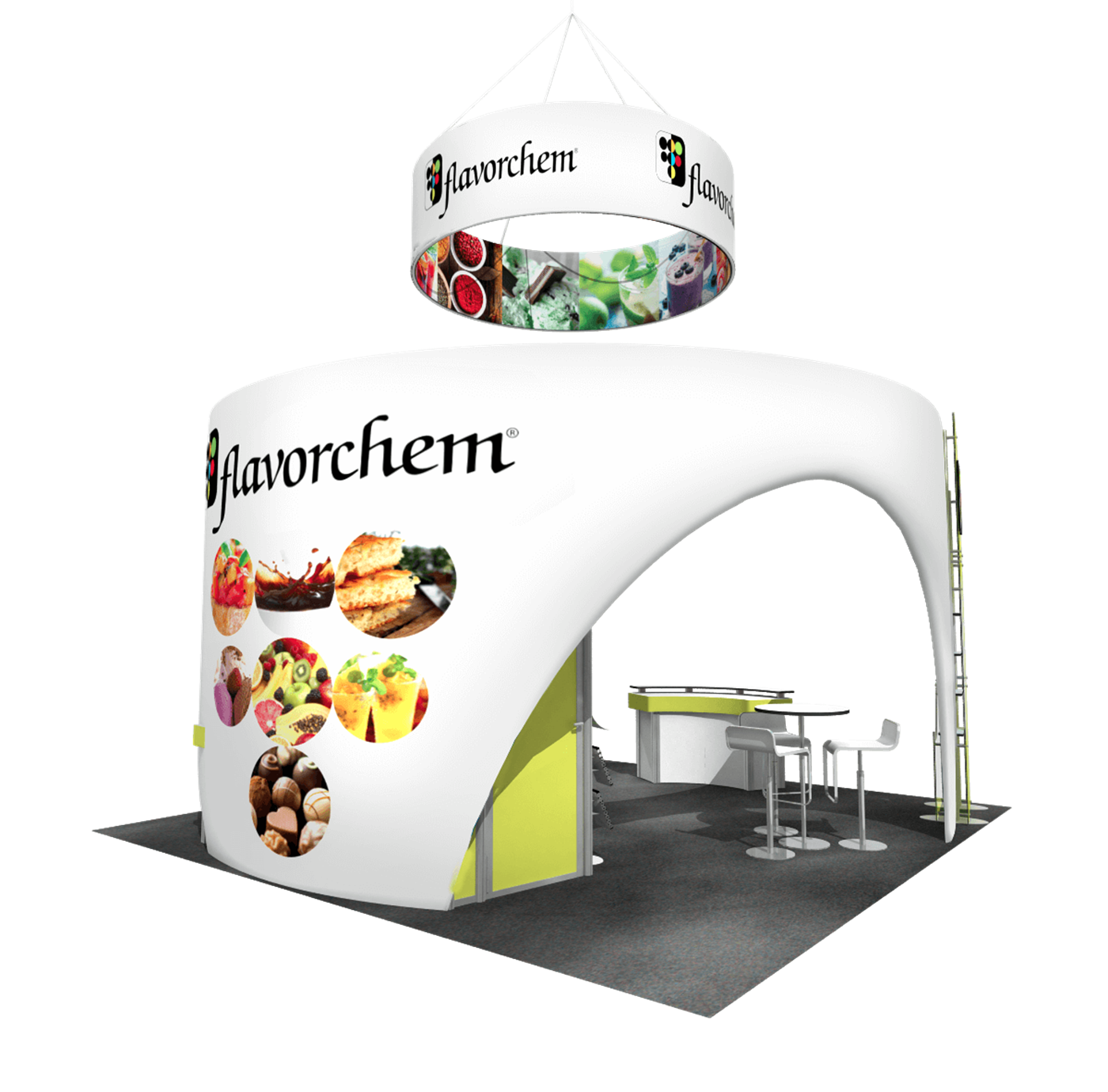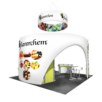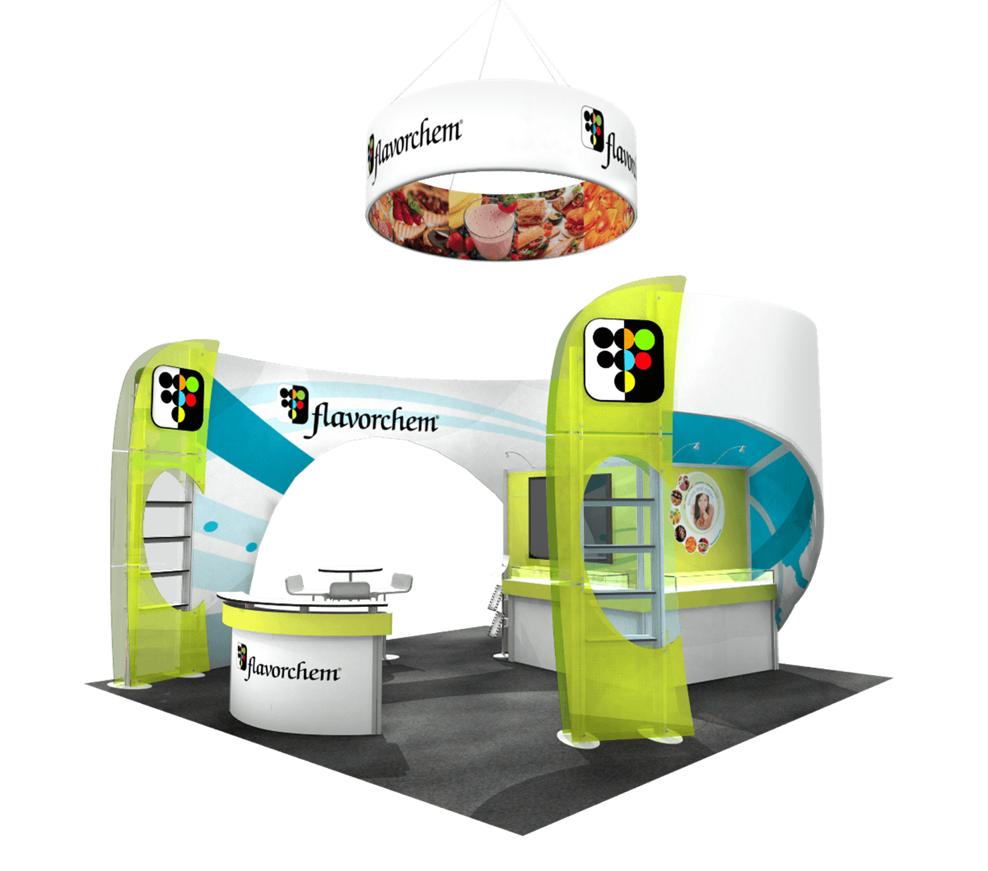 Organic island display with a sweeping fabric structure, acrylic accents and product shelving. (Award Winning Design)