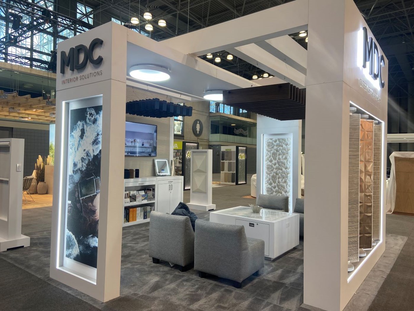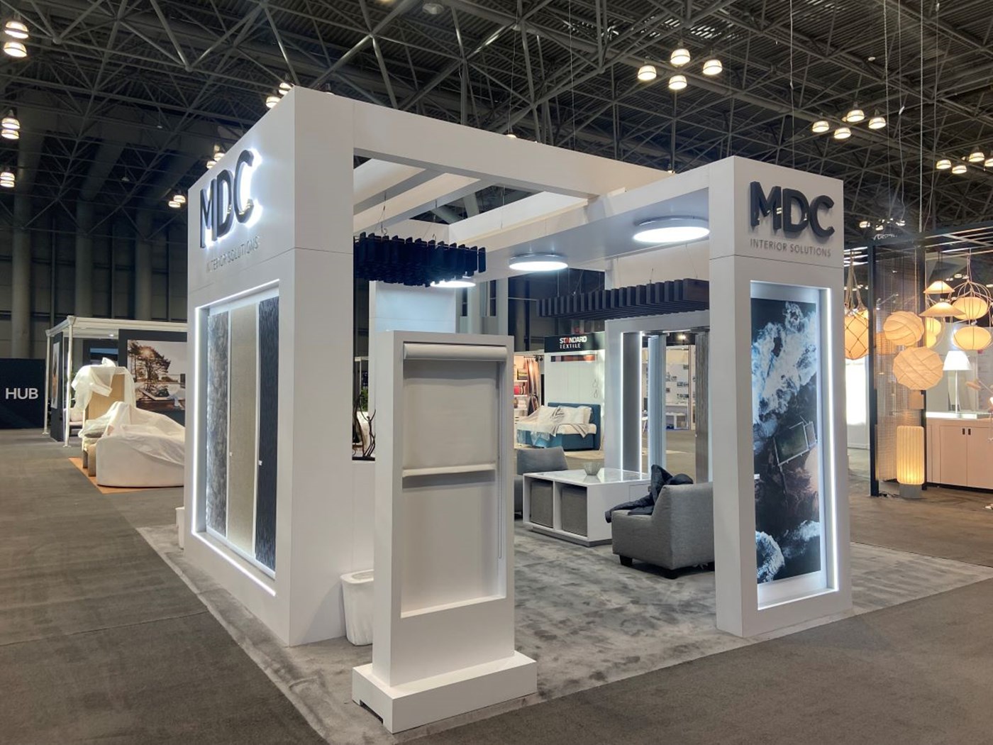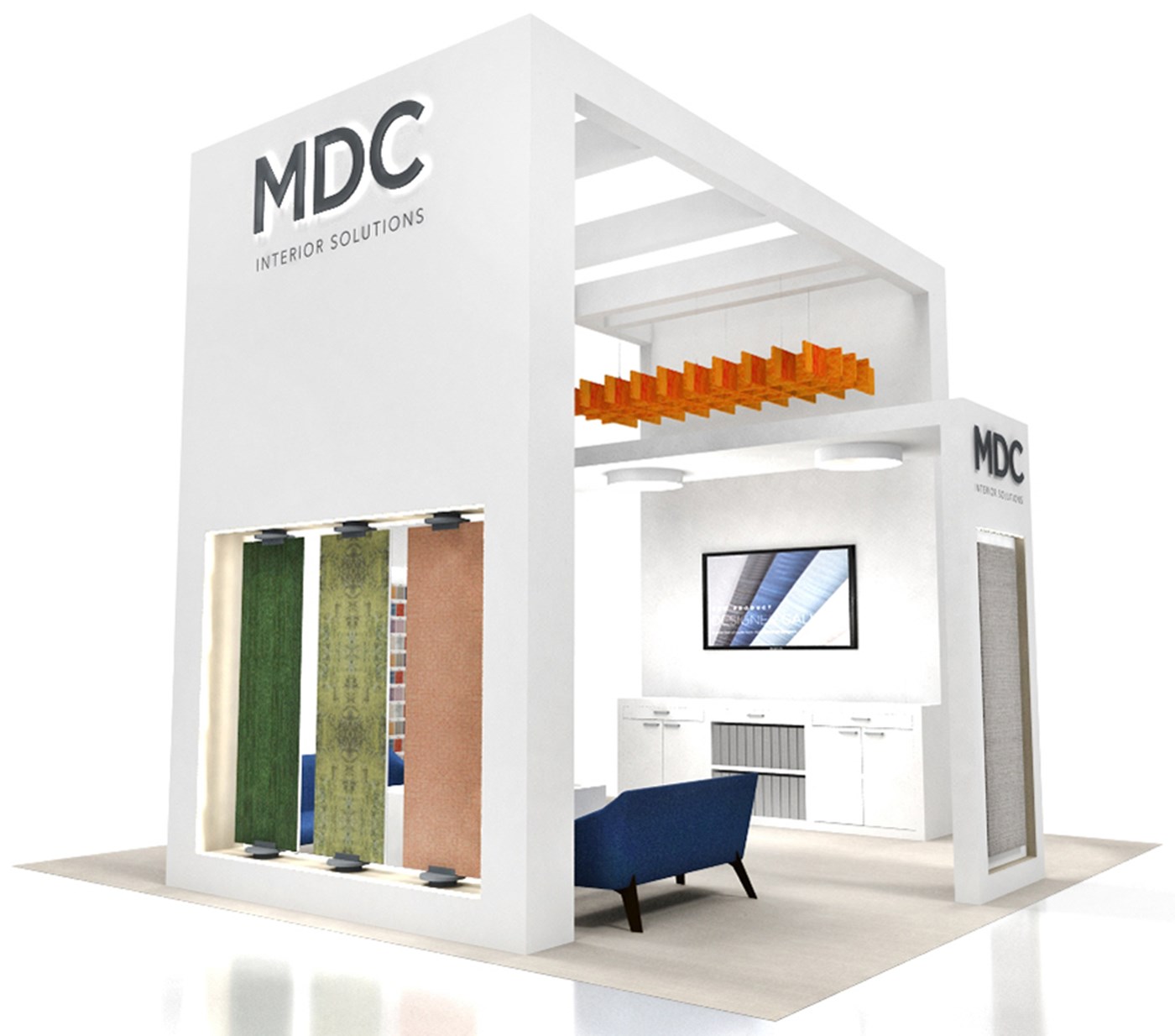 20' x 20' Custom fabricated exhibit for high-end appeal. Fabricated with laminated wood panels, ceiling and cabinets. Integrated spindles for client mounted textiles. Ceiling beams structures for hanging client product and lighting.