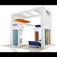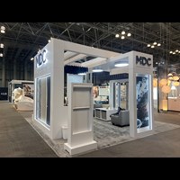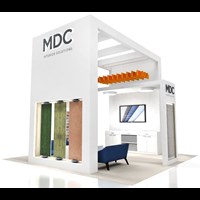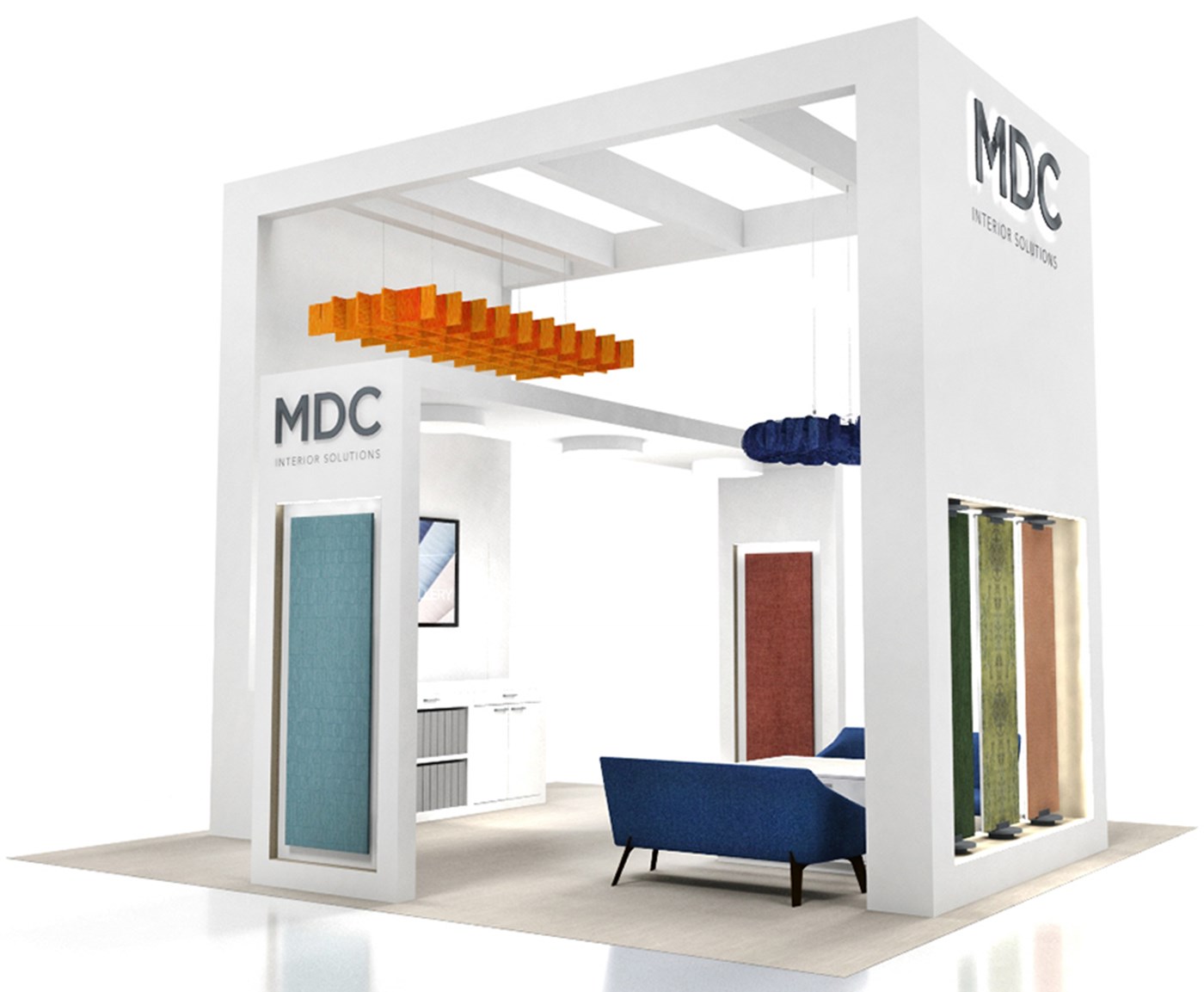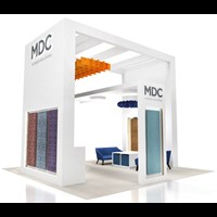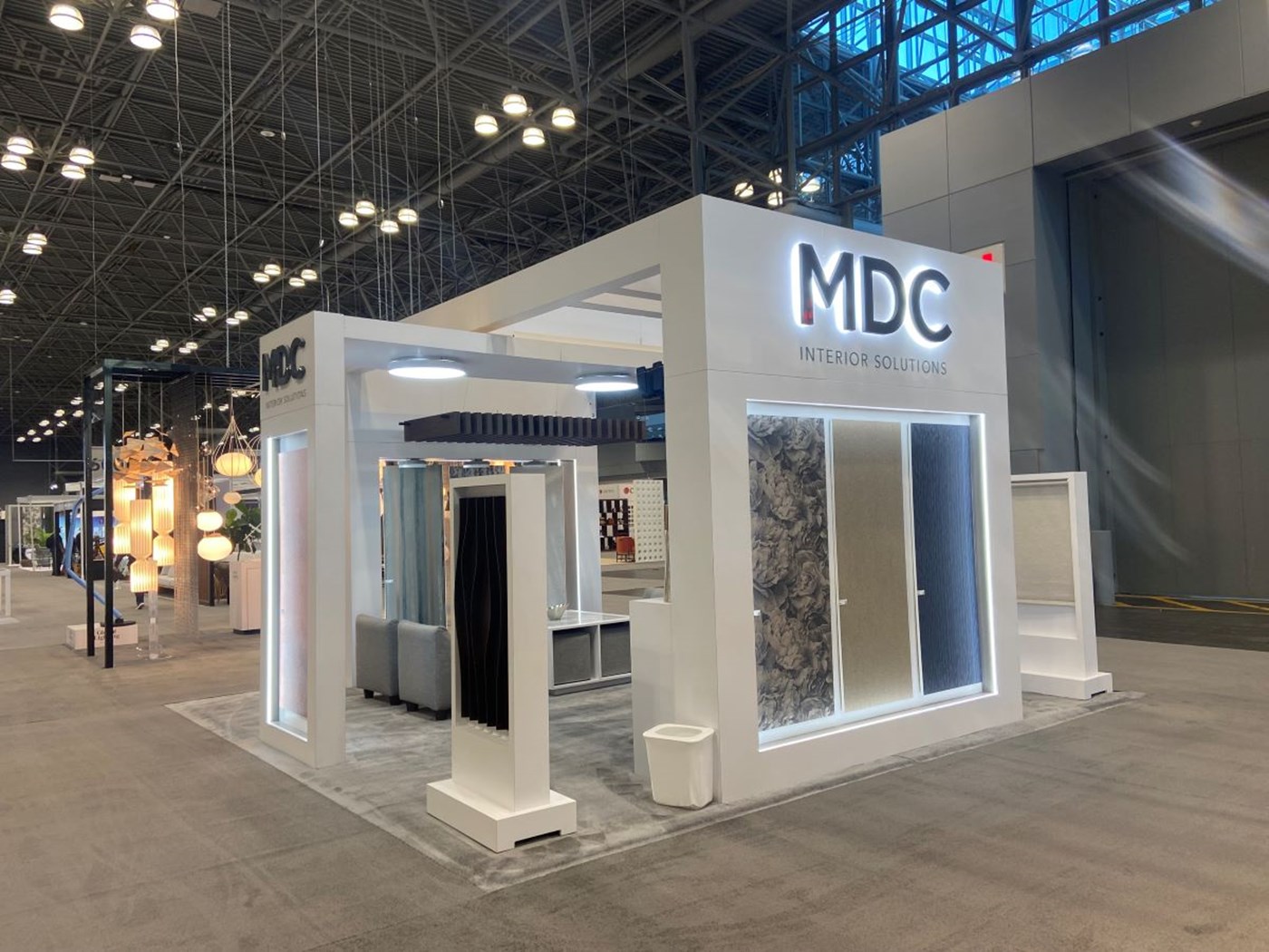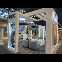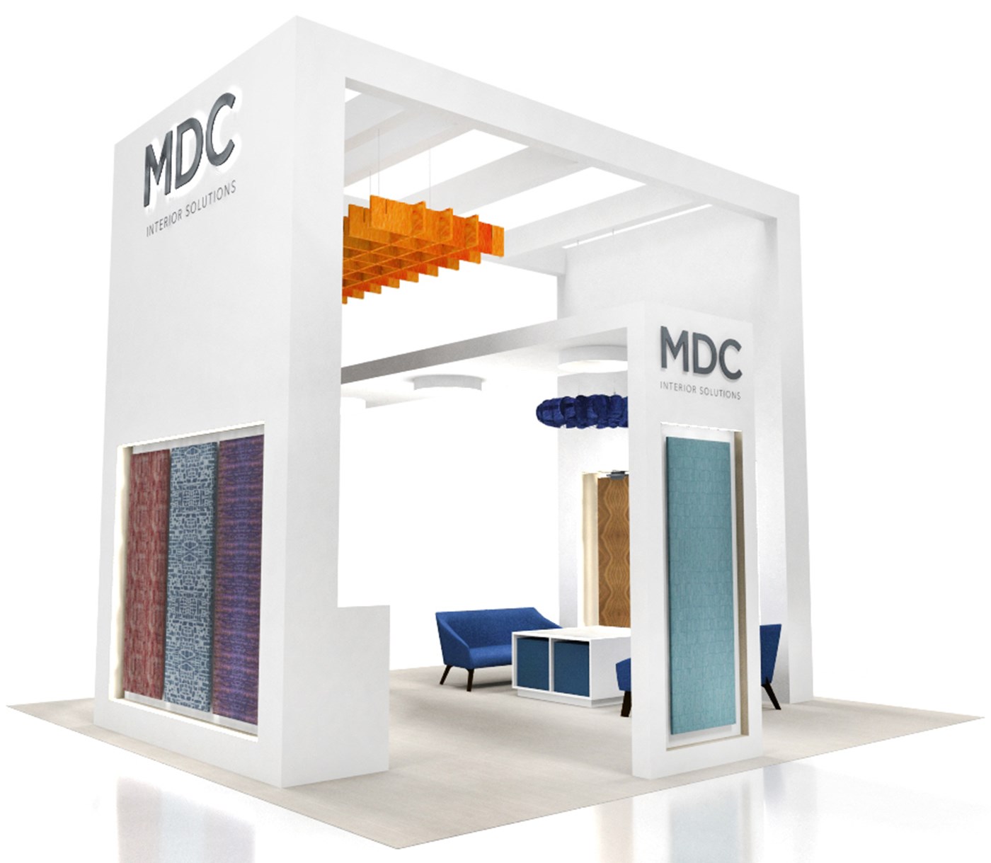 20' x 20' Custom fabricated exhibit for high-end appeal. Fabricated with laminated wood panels, ceiling and cabinets. Integrated spindles for client mounted textiles. Ceiling beams structures for hanging client product and lighting.