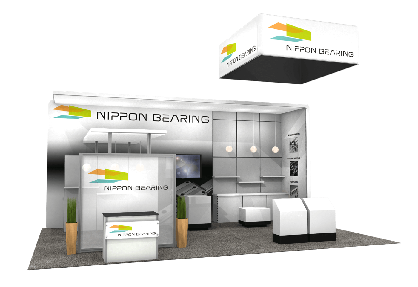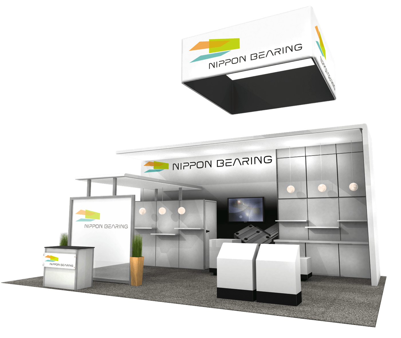 Modern peninsula display with bold graphics, semi-private meeting & storage areas and hanging sign.