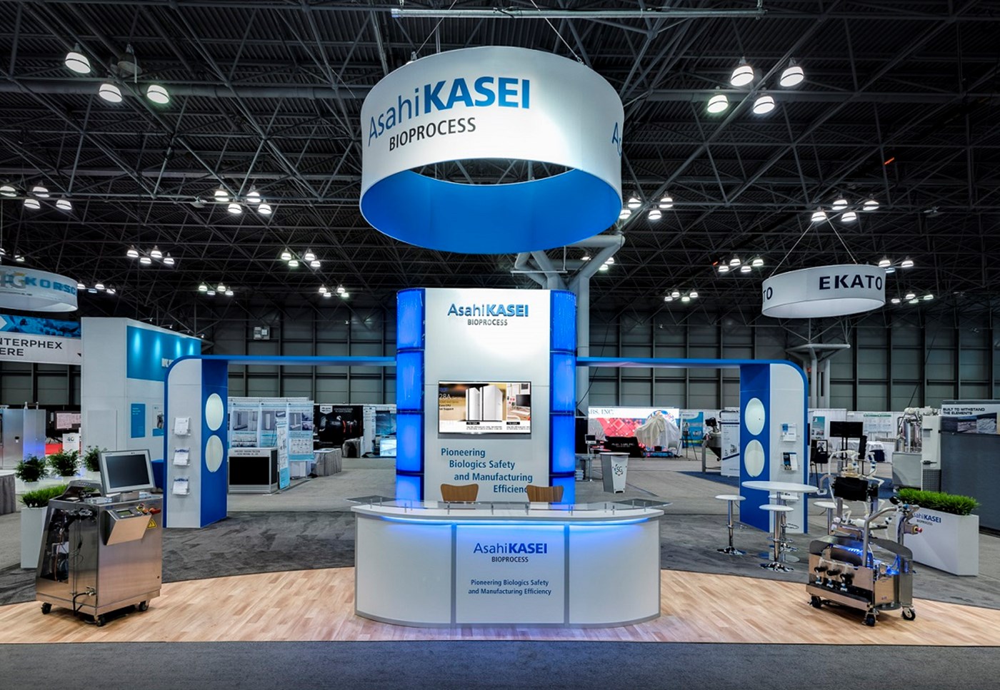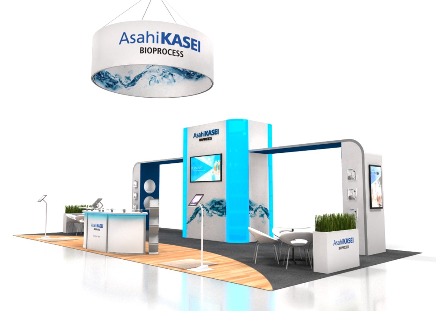 16' Tall center key-less storage tower with tension fabric graphics and acrylic accents. (2) 10' Tall side towers and ceiling canopies.