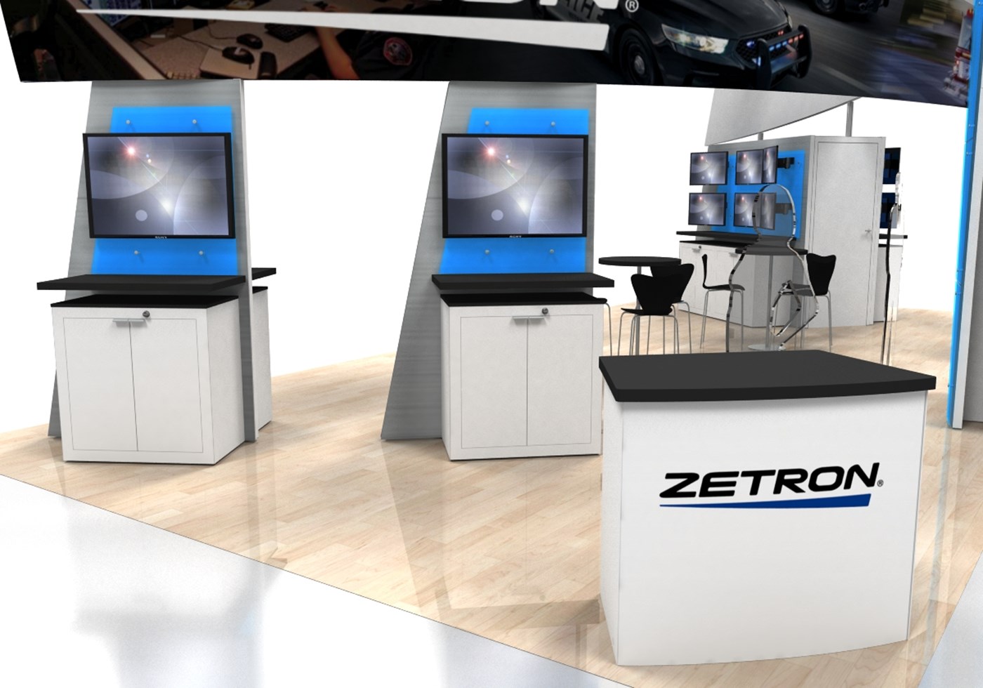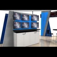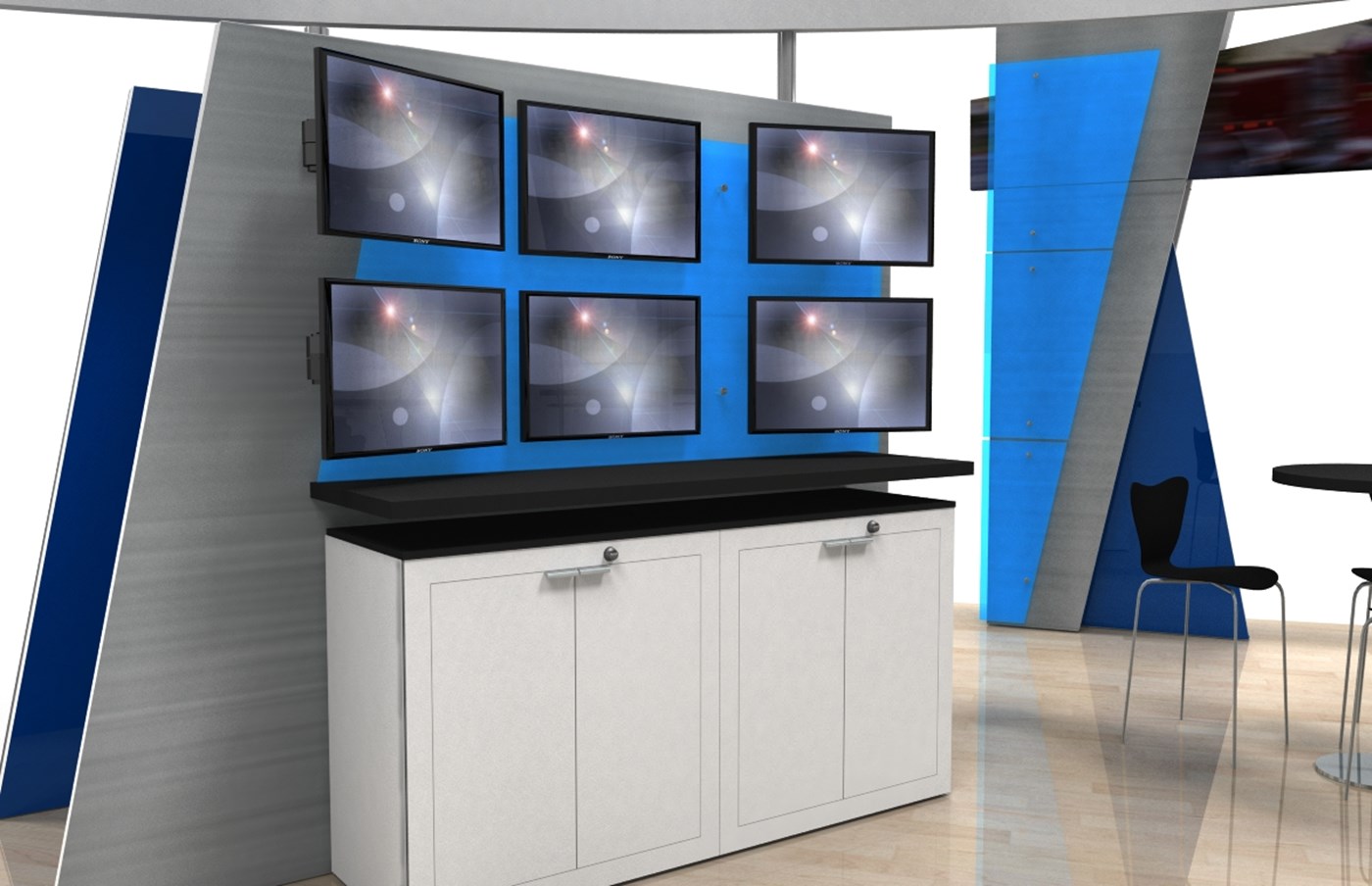 15' and 13' Tall curved, tapered tension fabric graphics structures, walk-in storage room, (2) demo areas with (4) 44" x 24" key-less locking laminated cabinets and (2) presentations areas with (2) 81" x 24" key-less locking laminated cabinets and (2) 48" x 24" key-less locking crescent counter with graphic.
