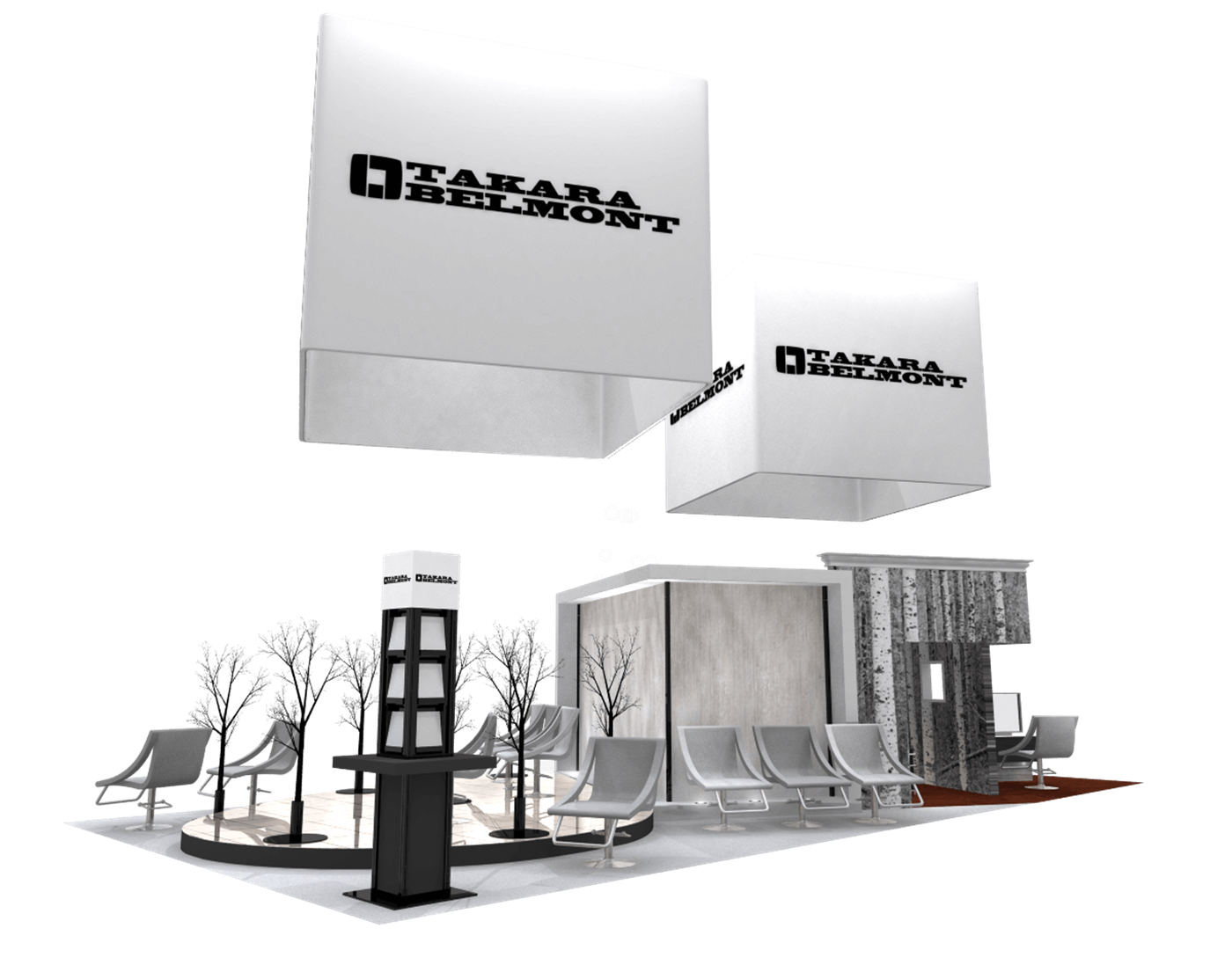 Modern trade show display with large cubed hanging fabric structures, large format graphics and private lounge area.