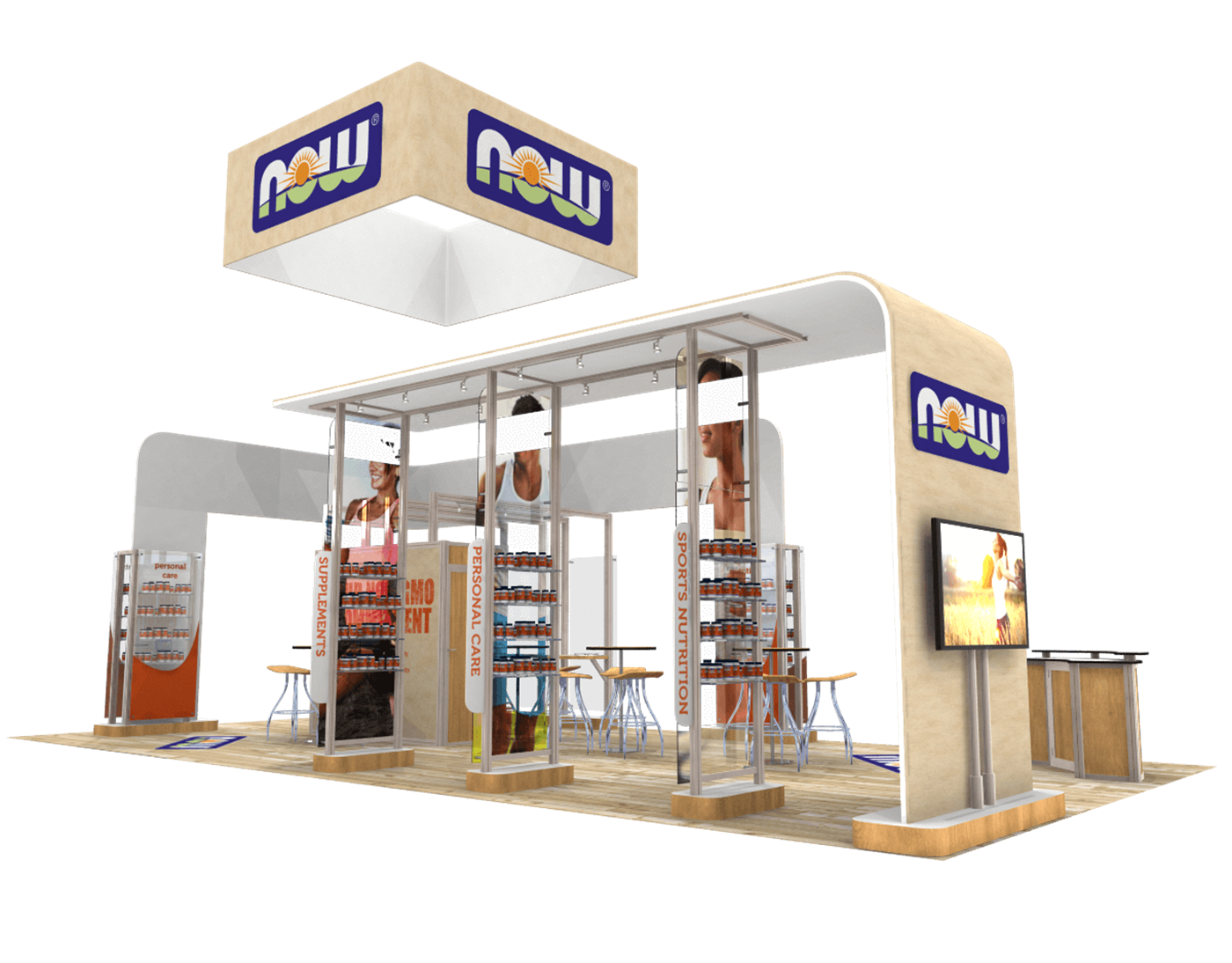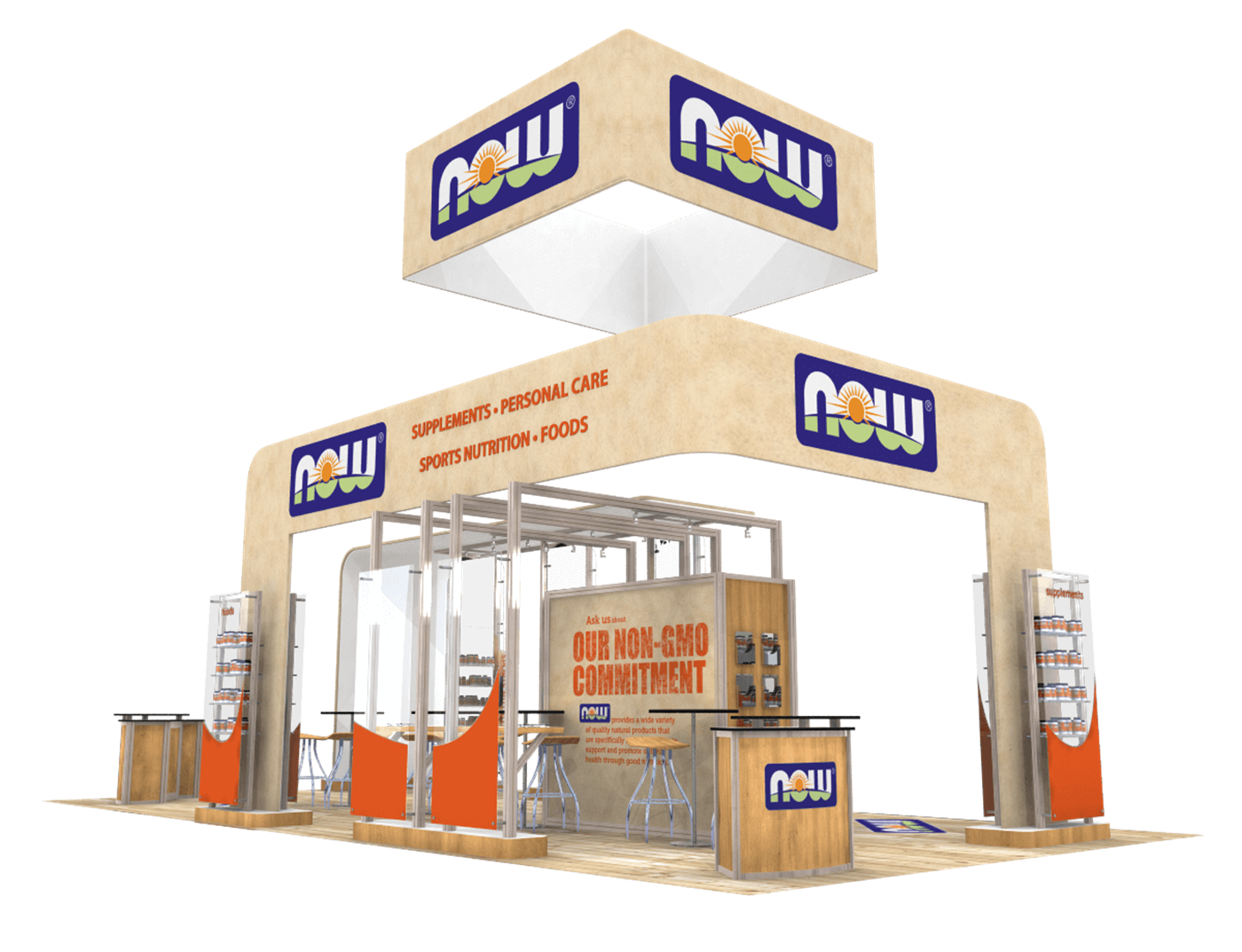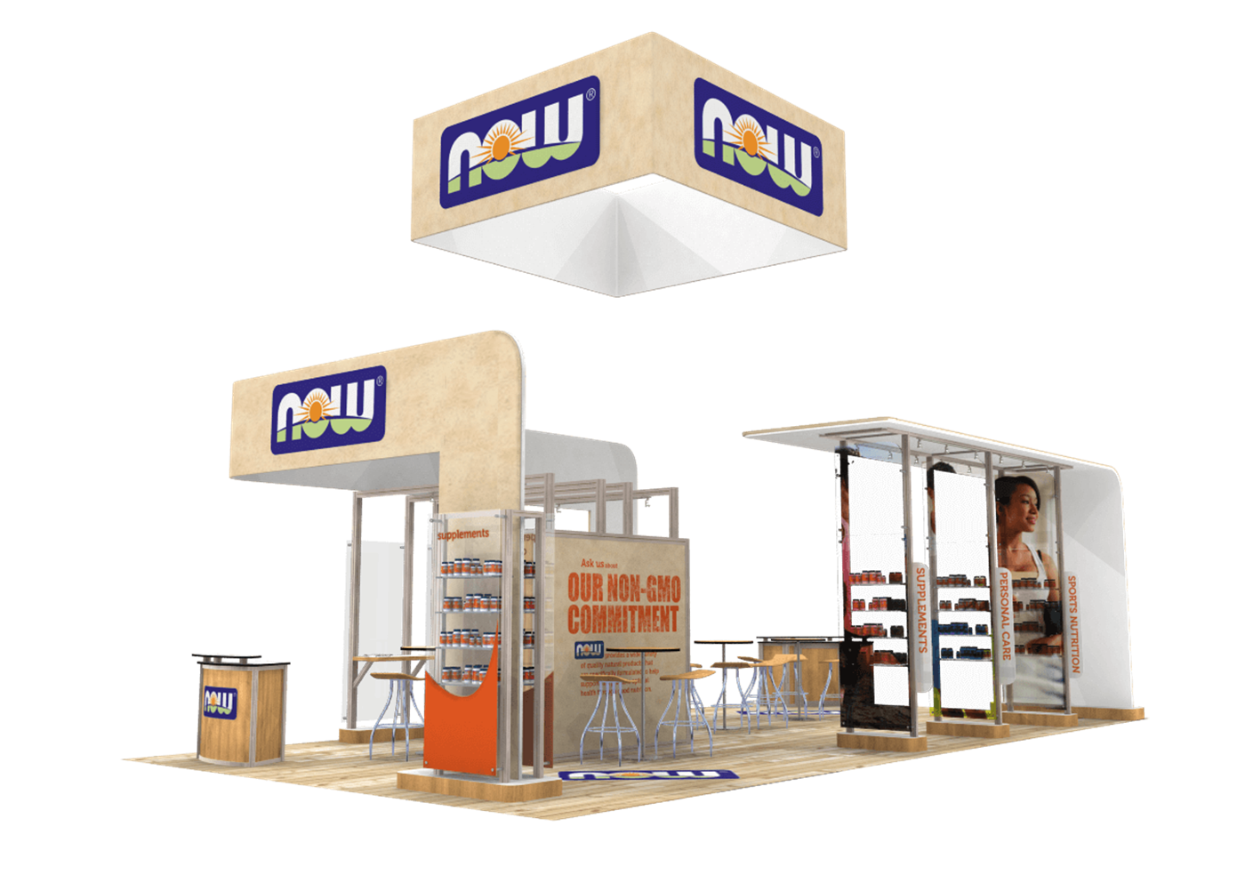 Organic display with multiple product kiosks, fabric graphic canopies and hanging sign.