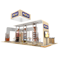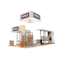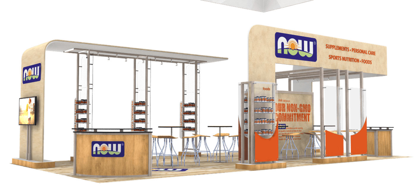 20' x 40' Island trade show exhibit fabricated with engineered aluminum extrusion. Product kiosks with acrylic shelving, profile cut graphics and laminated bases. Pillow case tube structure canopies with tension fabric graphics.