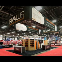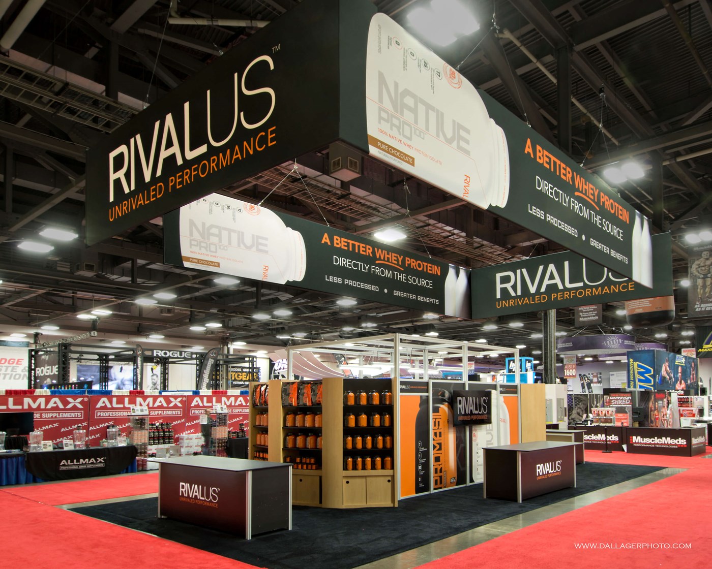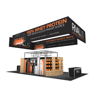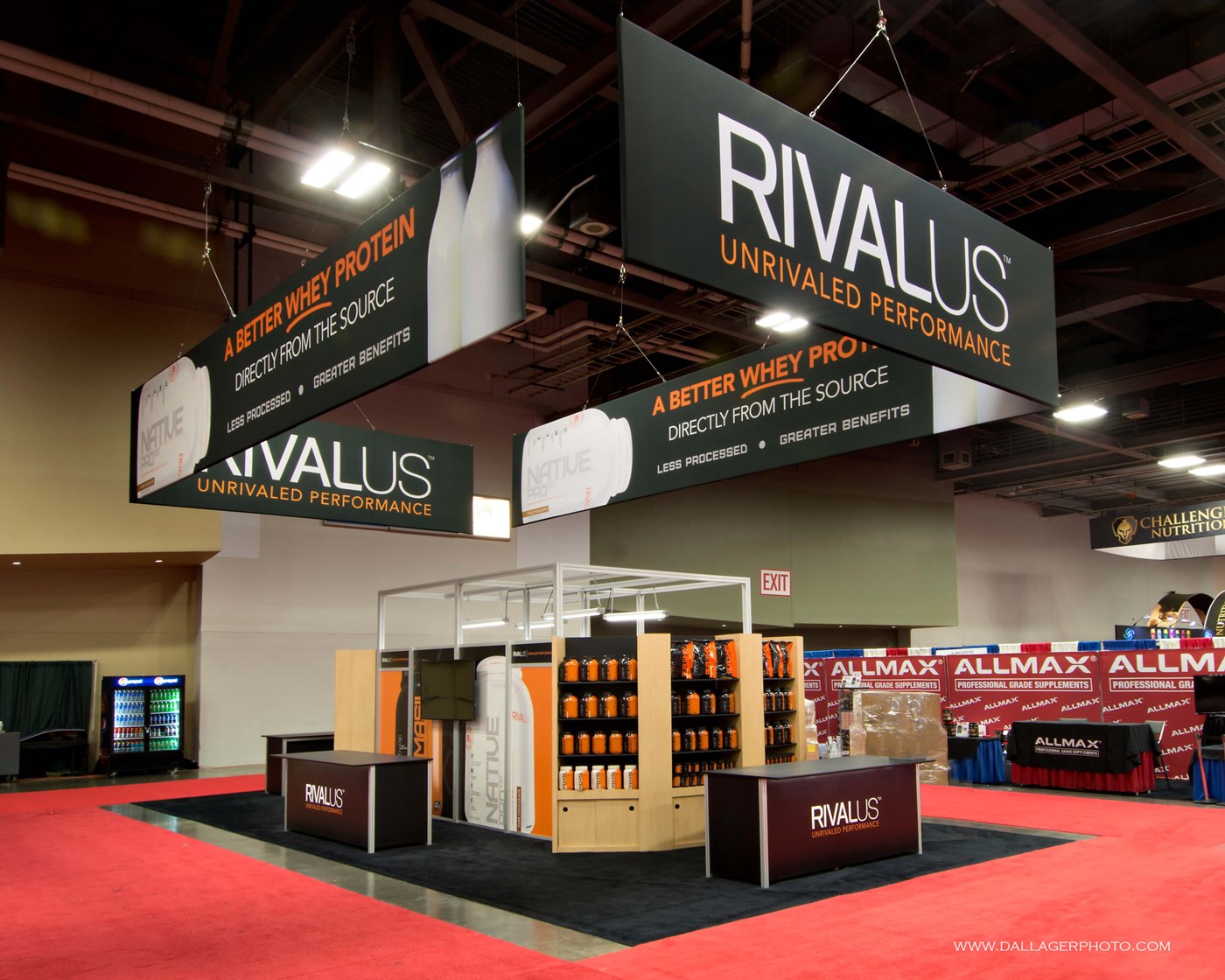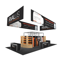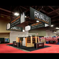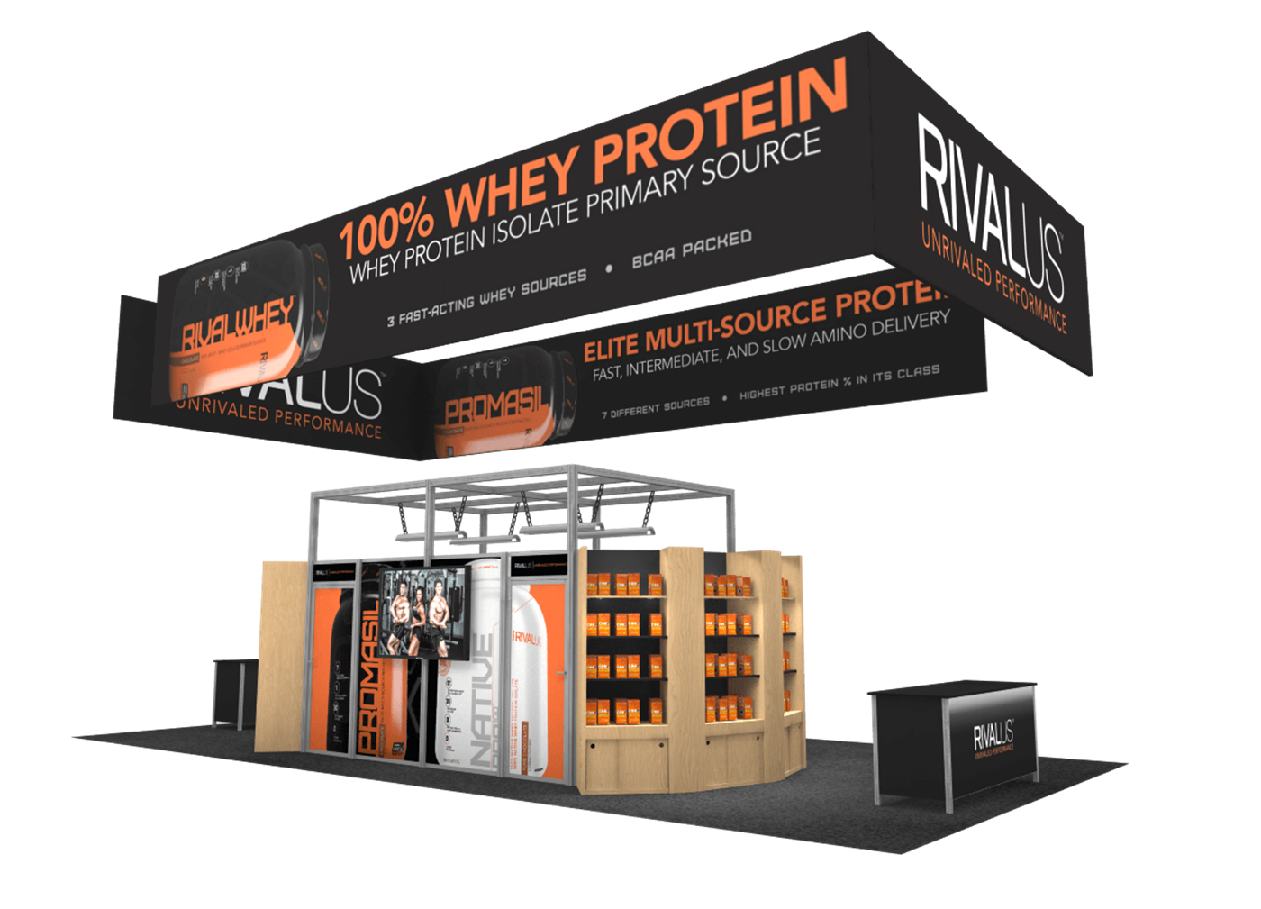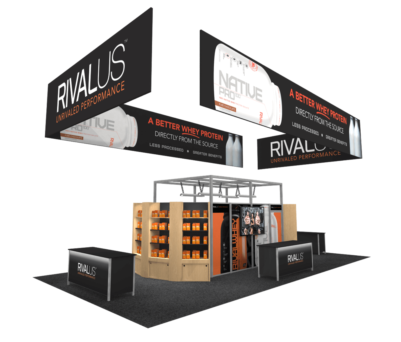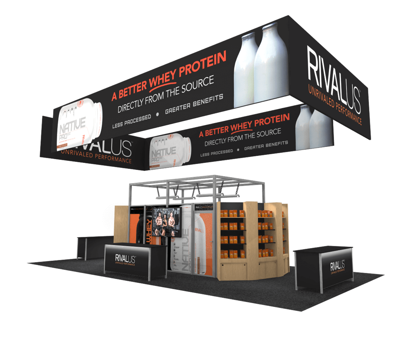 Modern exhibit design with large branding appeal with rectangle hanging fabric structure, private meeting rooms and product shelving.