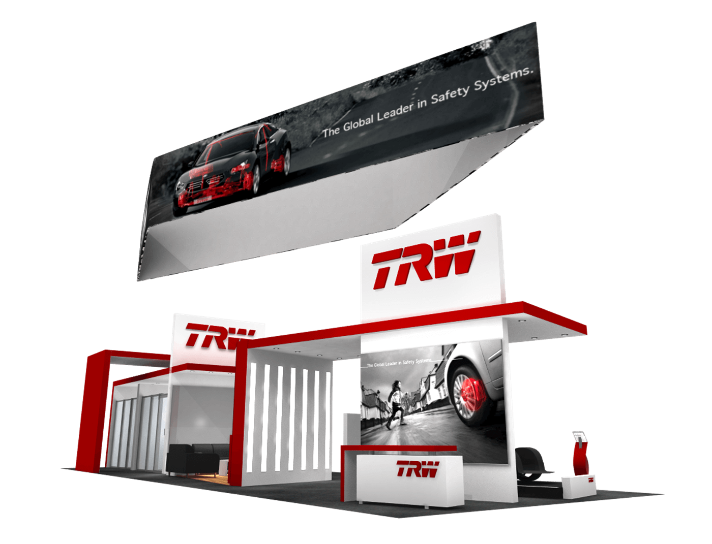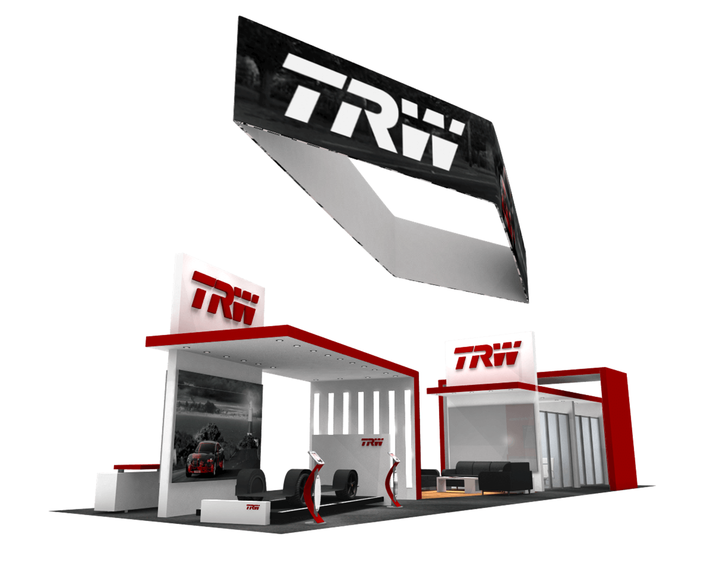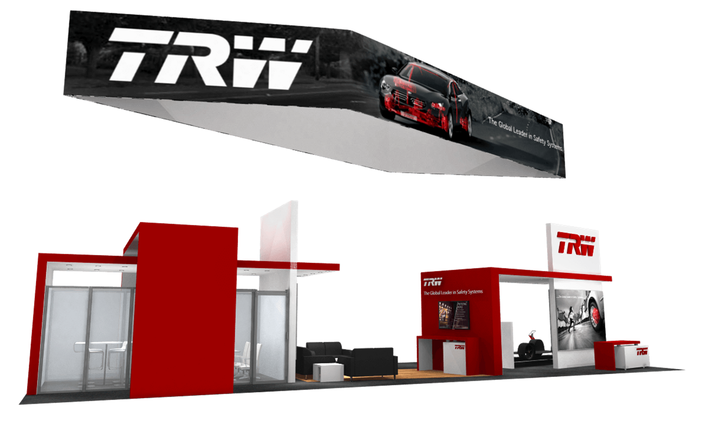 Industrial exhibit design with hanging fabric structure, towers with 3-D logos and ceiling canopies.