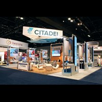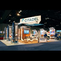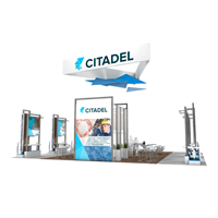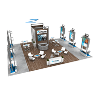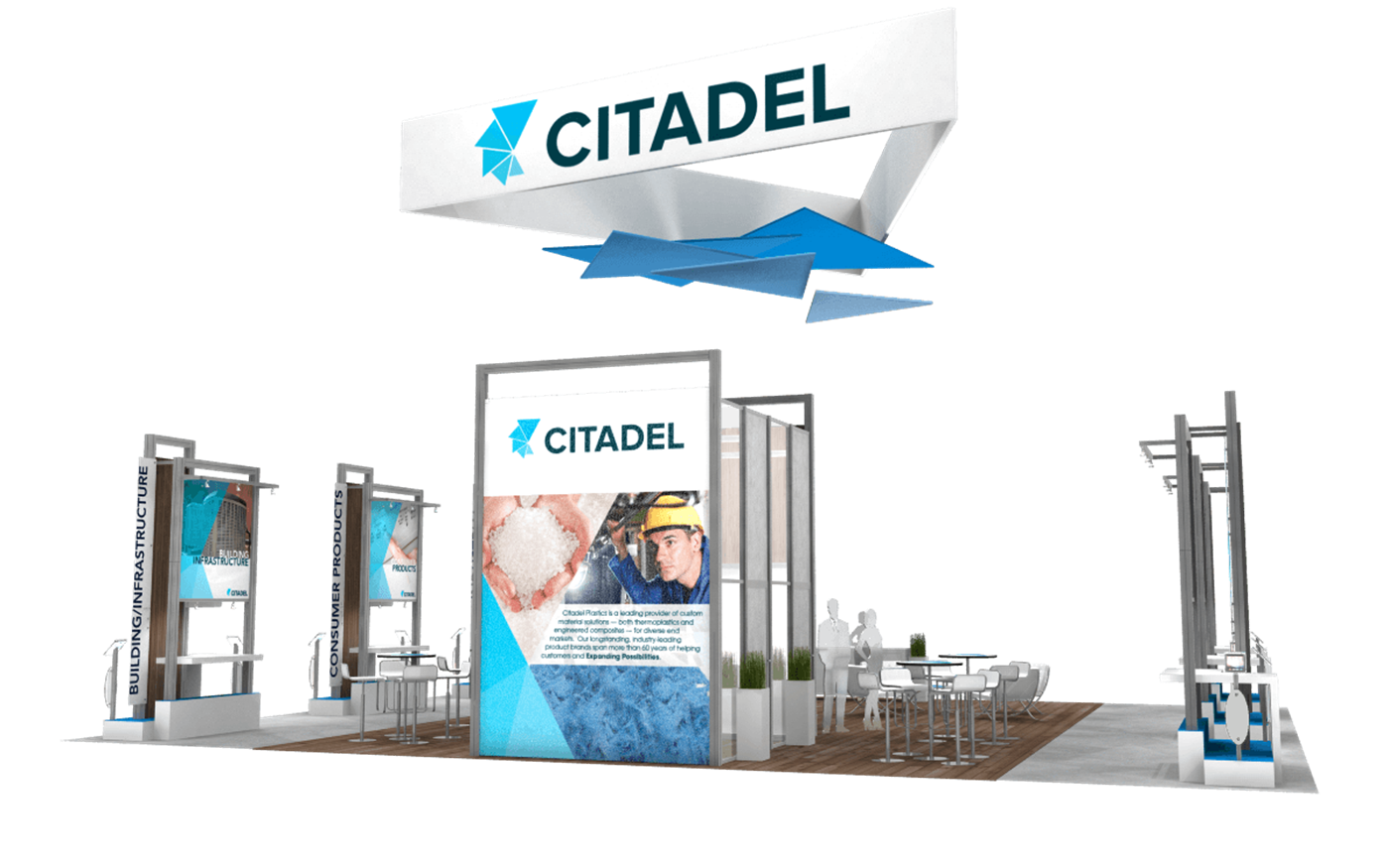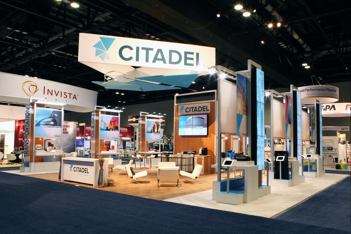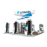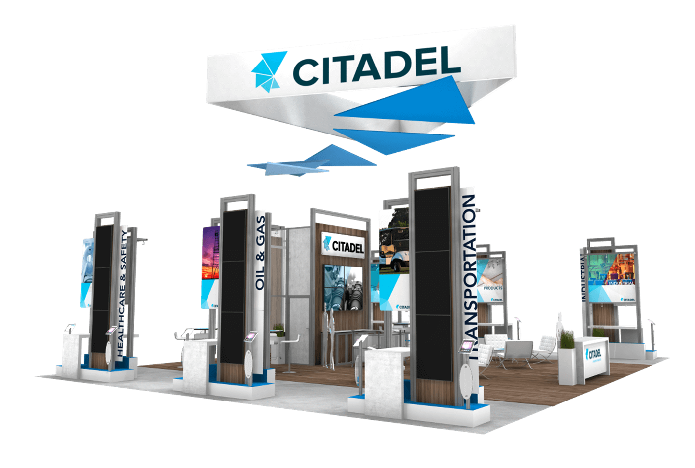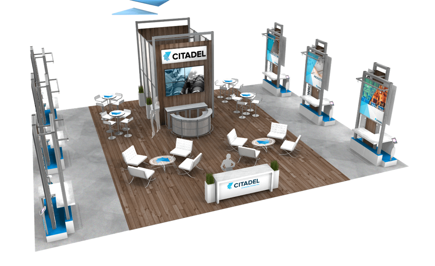 High-tech exhibit with lightbox graphic towers, fabric structures, tower conference room and video wall.