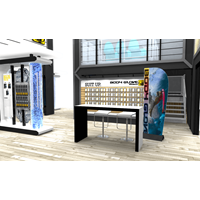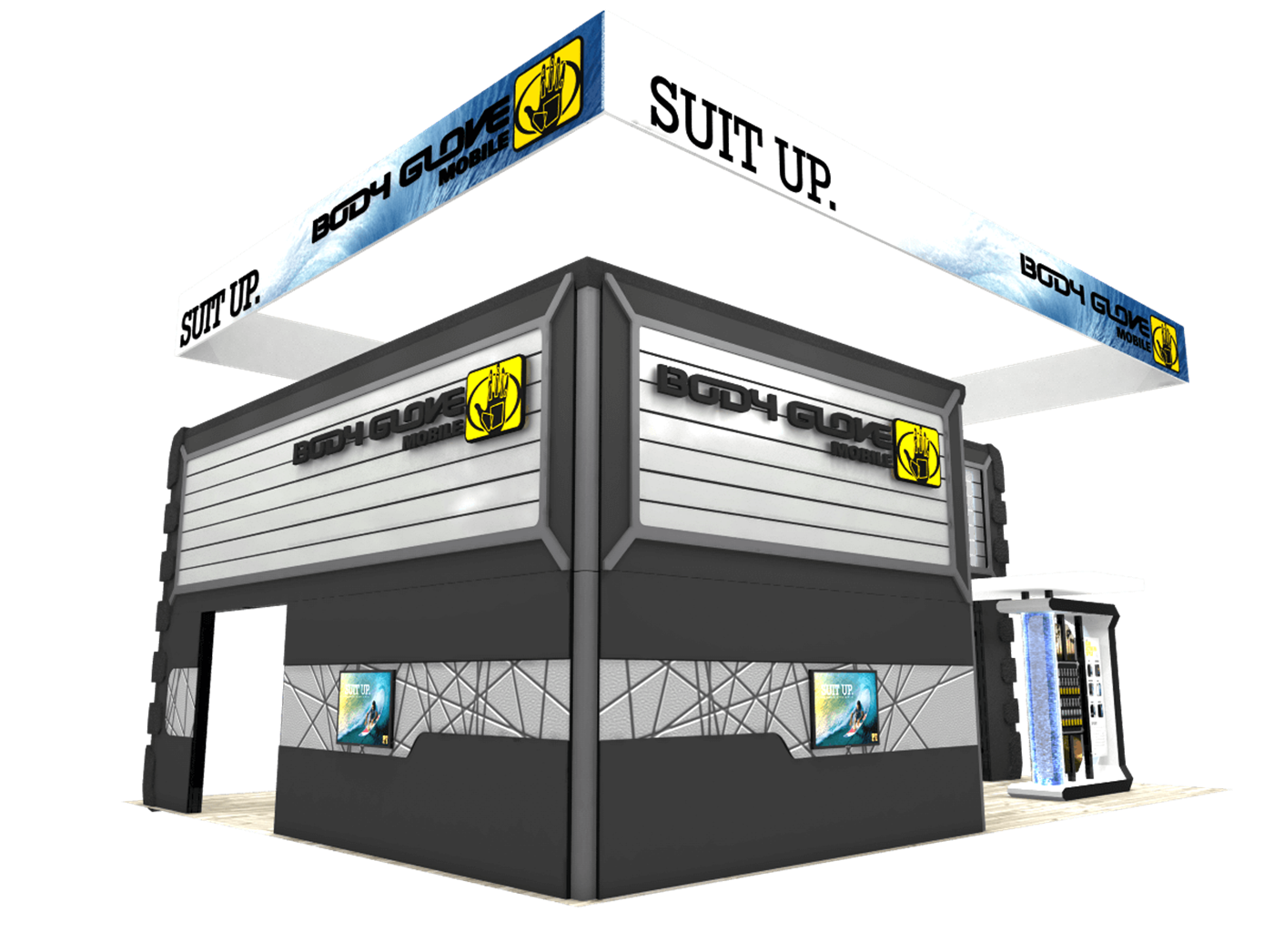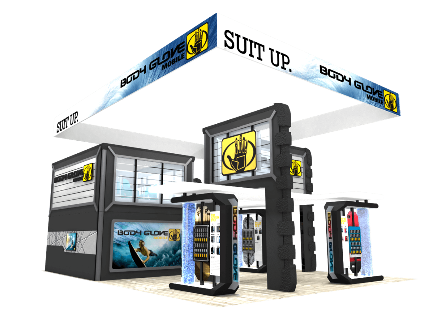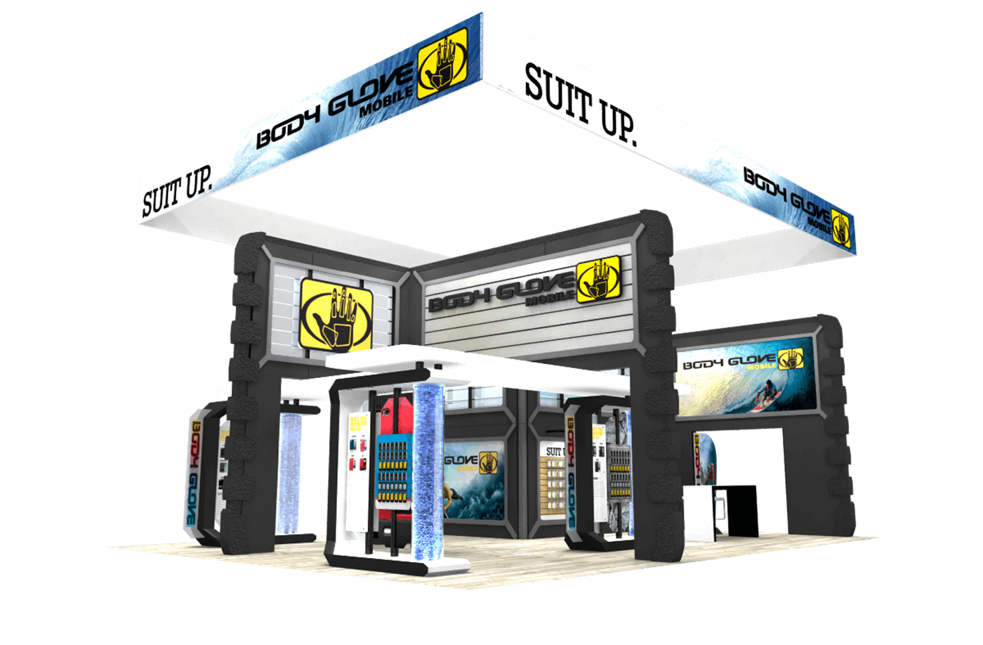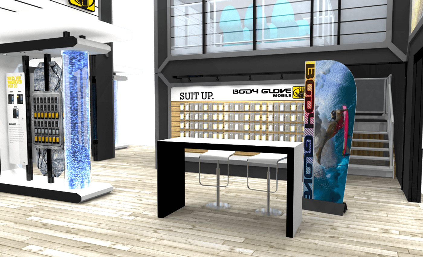Themed double deck display with second level meeting area, unique branded bridges, water features and product kiosks.