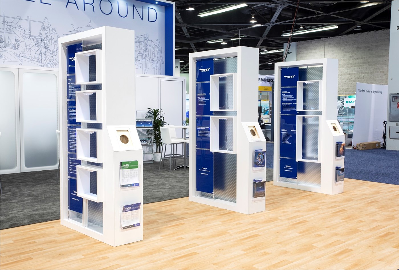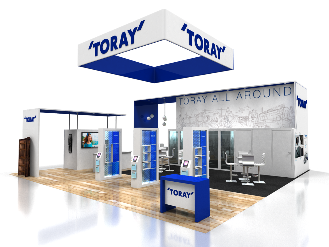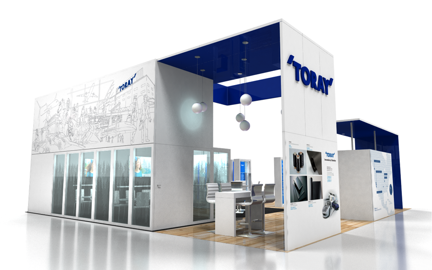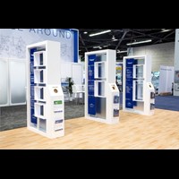 16' Tall main structure with dual conference rooms with frosted acrylic panels and sound barrier insulation, key-less storage room, printed canopy with integrated LED down-lighting, hanging pendant lights and graphics. 12' Tall structure with printed canopy, integrated LED down-lighting, storage room and graphics. Dimensional magnetic logo's for accurate alignment.