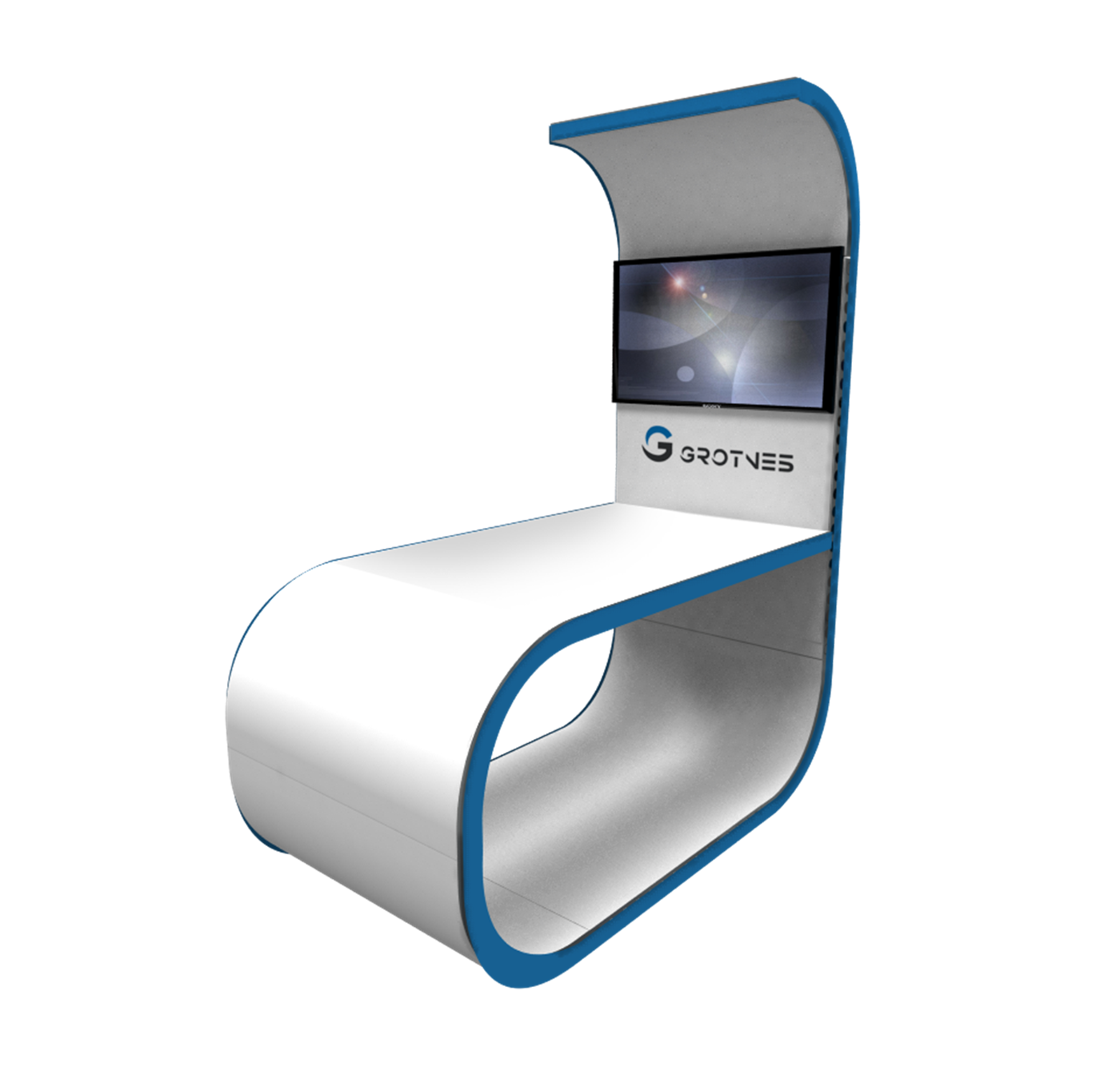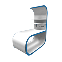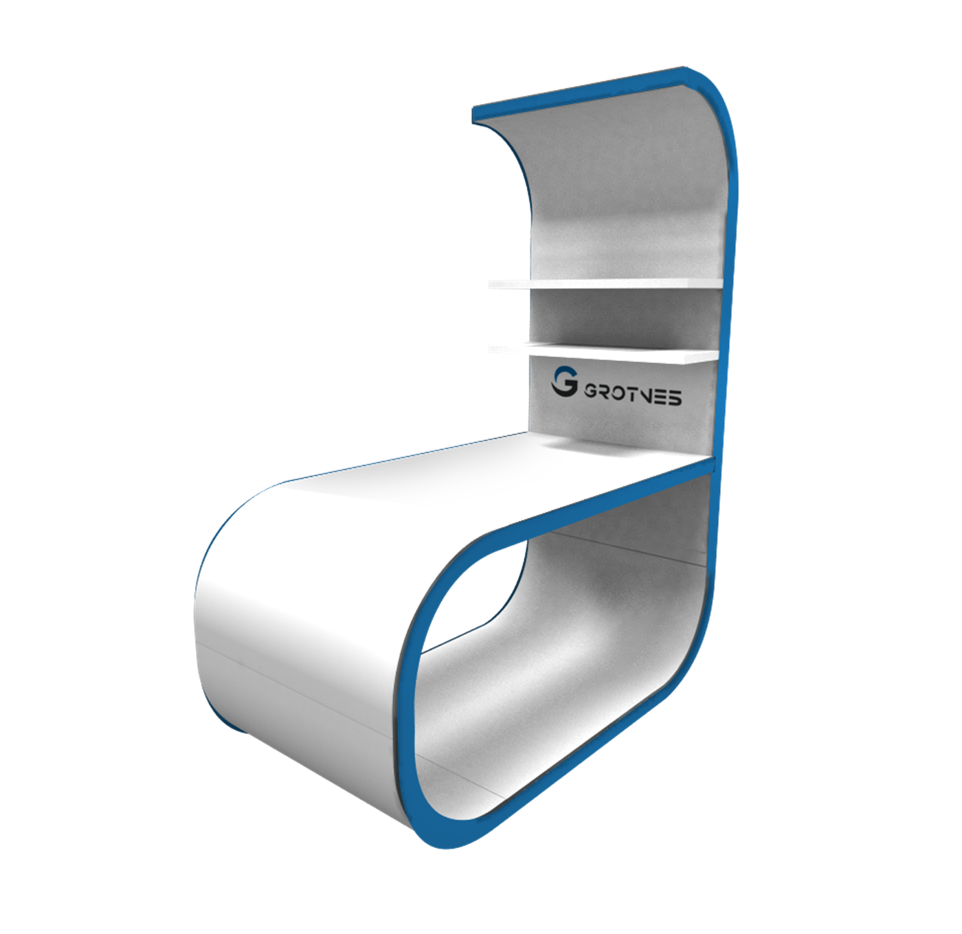 39" x 79" Open oval counter, sturdy wood surface in white or black laminate. Kiosk back wall with curved ceiling accent.