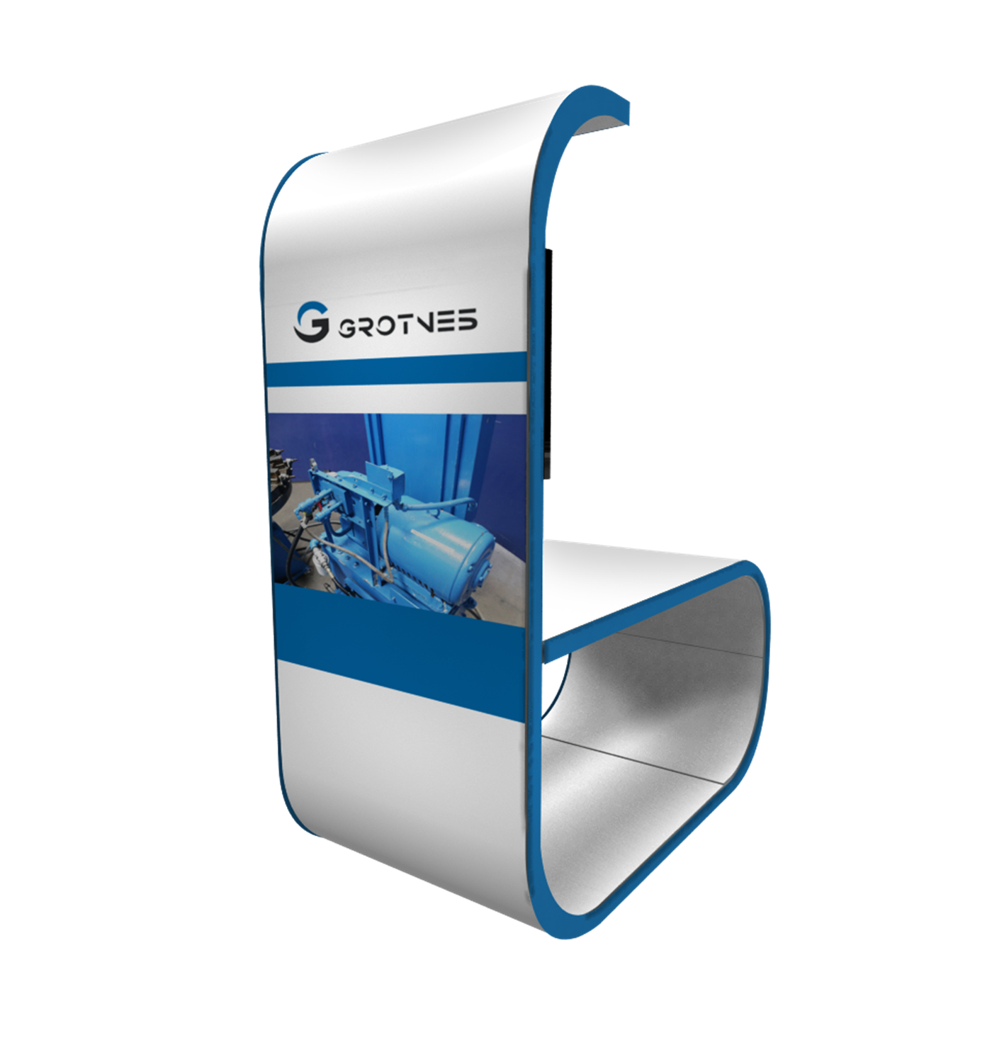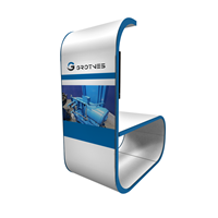106" Kiosk with open oval counter and curved canopy designed with pre-assembled aluminum FOUNDATION framing for tool-less installation and custom appeal. Graphics printed in-house for excellent colors and fit-n-finish.