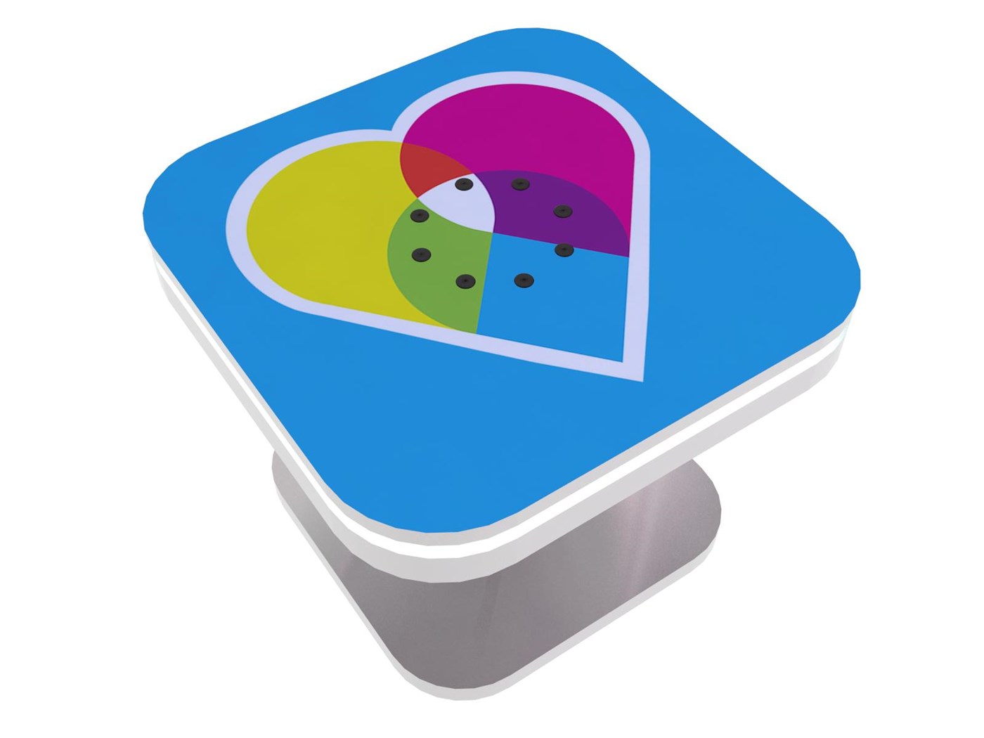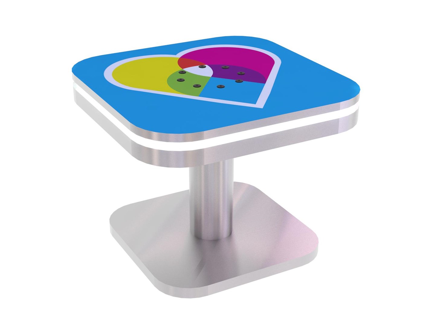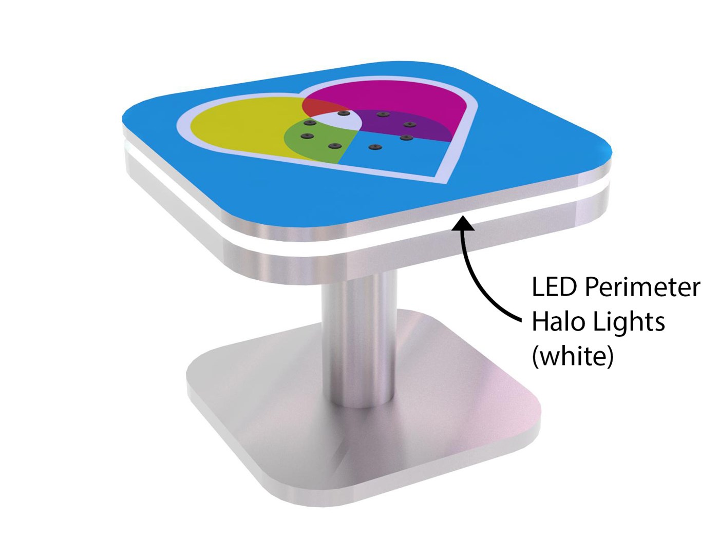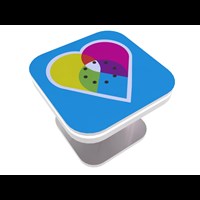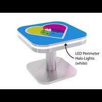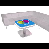 Branded Square Coffee Charging Table with USB connectivity, top graphic and LED halo lighting.