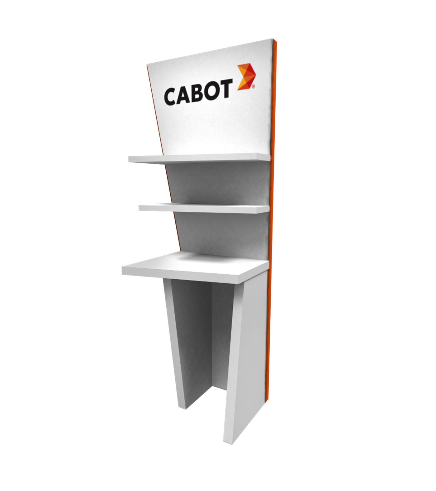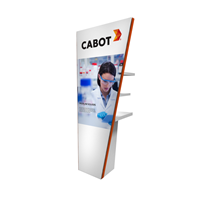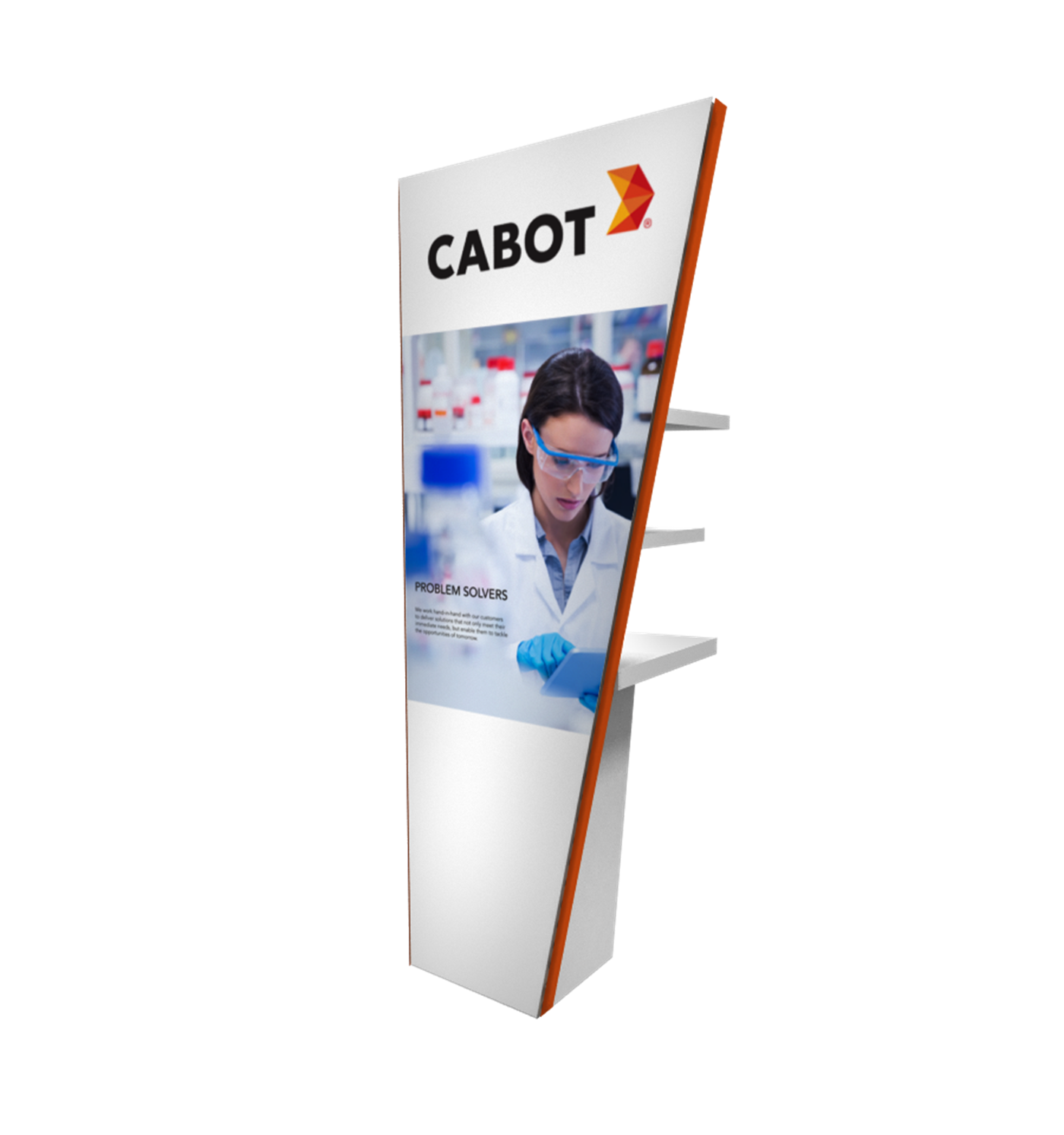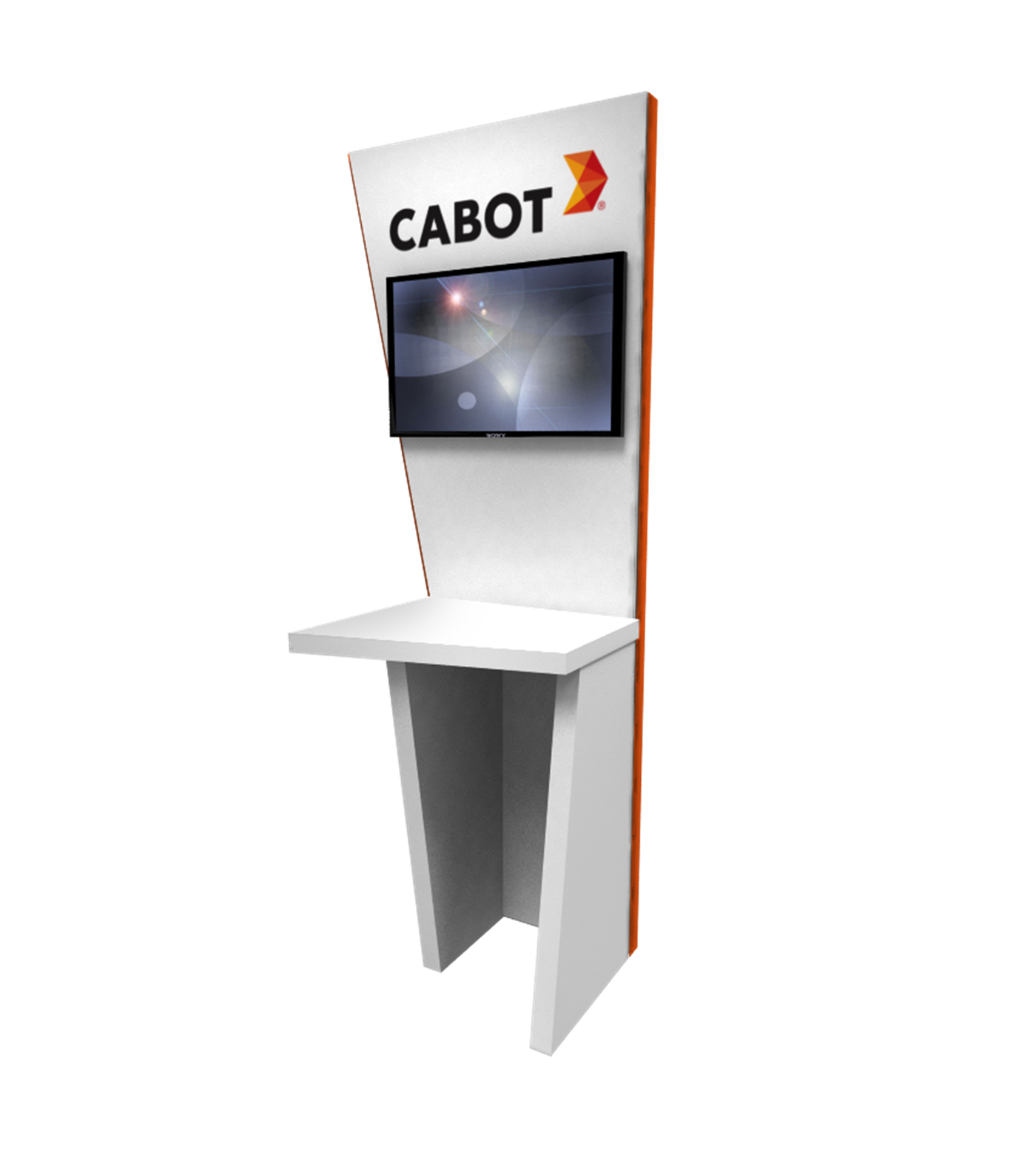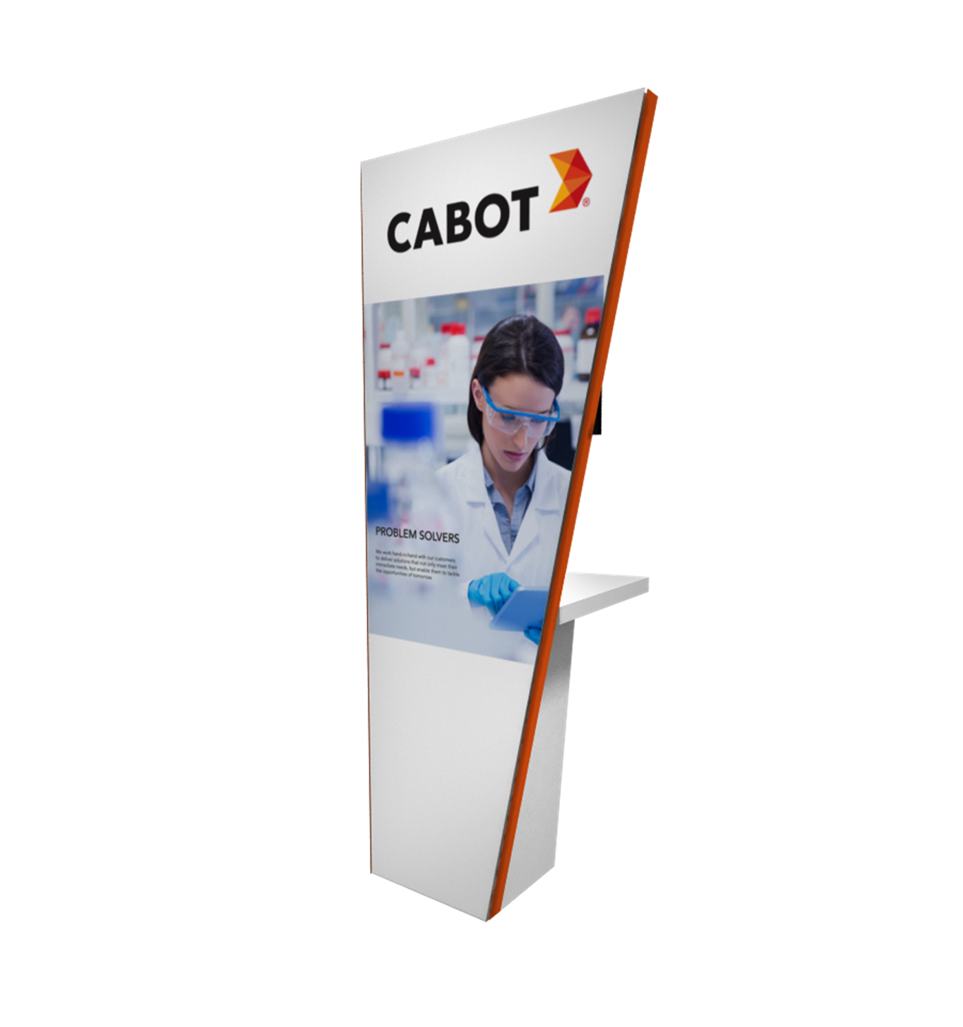 Angled kiosk with branded graphics, open counter surface and accessory options.