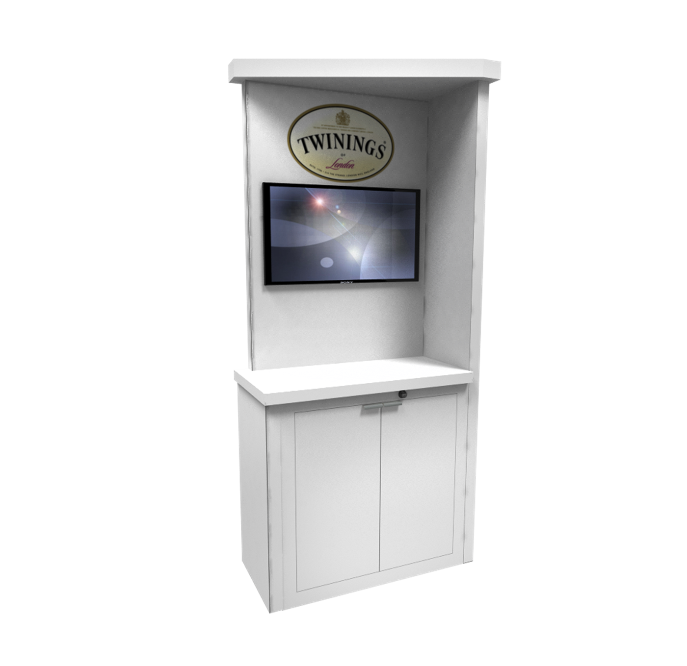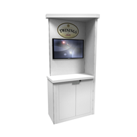 Elegant kiosk with branded graphics, angled ceiling cove, counter and accessory options.