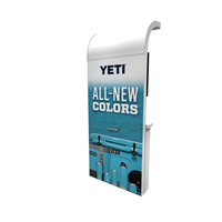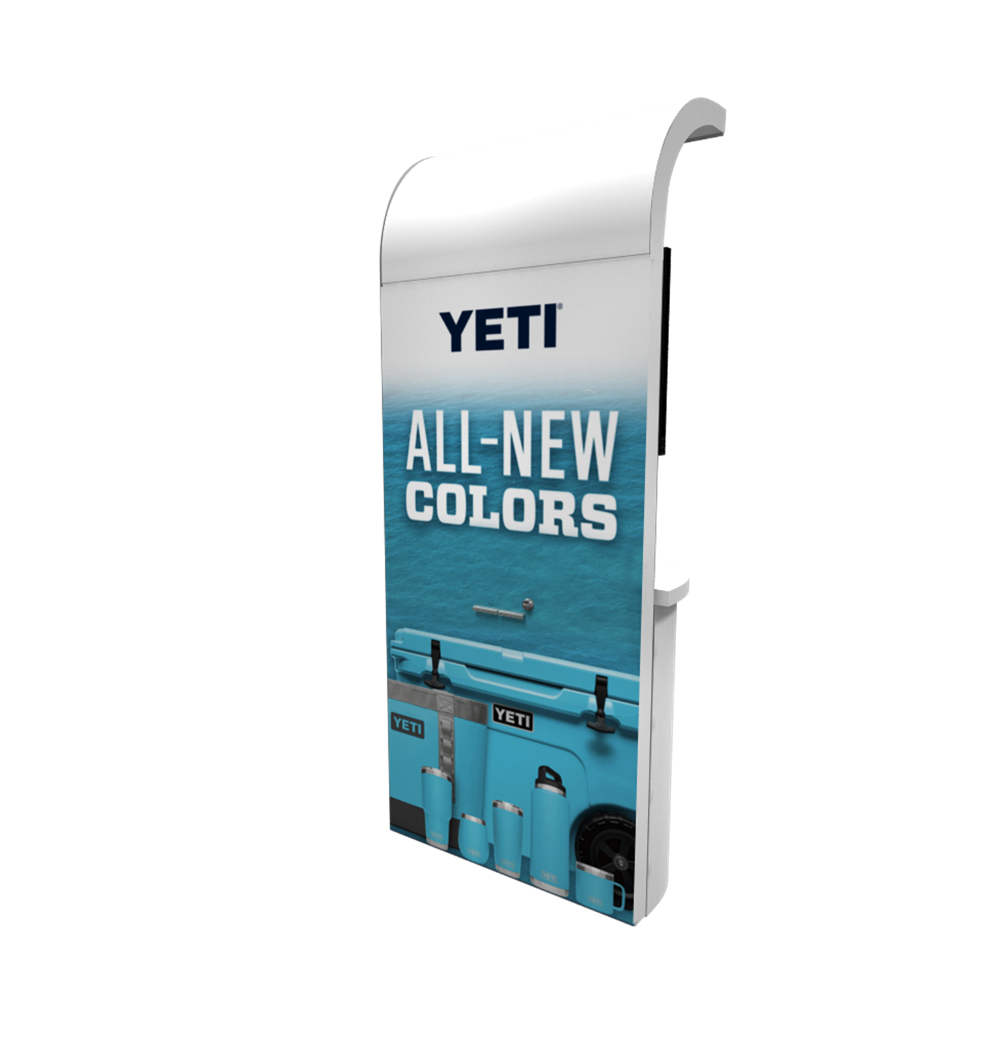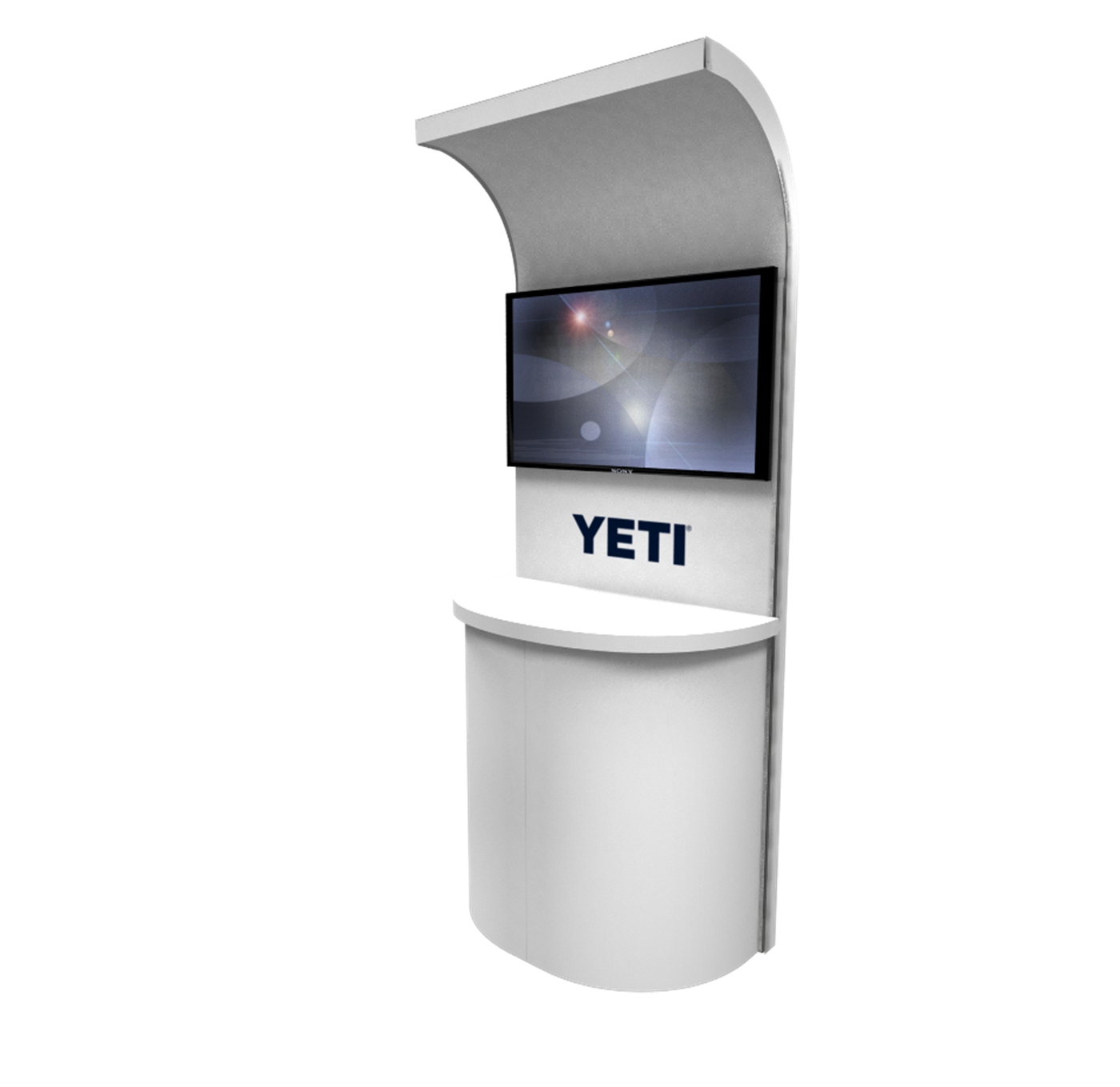 97" Kiosk with curved counter and curved canopy designed with pre-assembled aluminum FOUNDATION framing for tool-less installation and custom appeal. Graphics printed in-house for excellent colors and fit-n-finish.