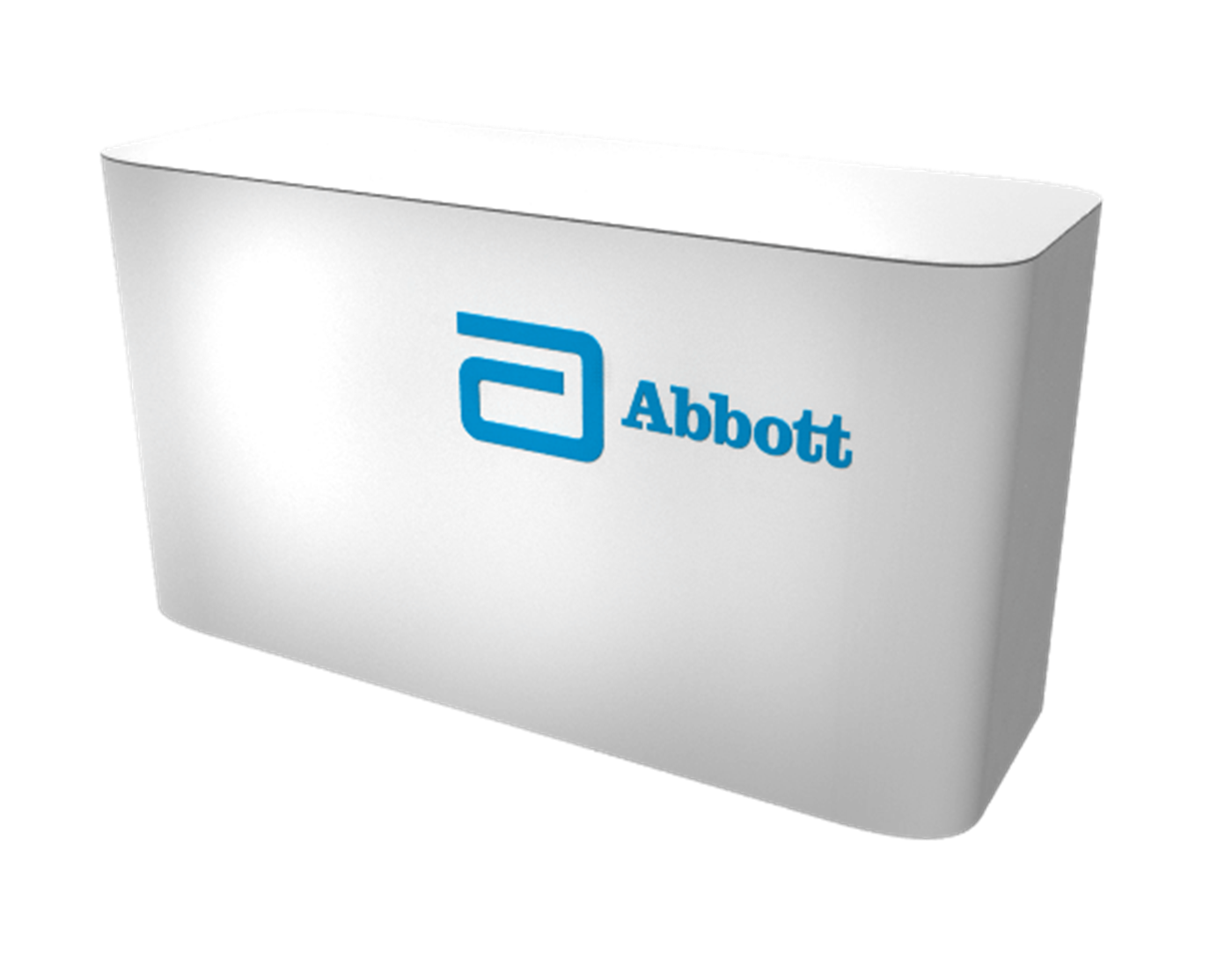 PACCRRC Custom Rectangular Rounded Counter $6,050 - $6,400 Custom rectangular counter with rounded edges and white wood laminate finish with branded logo.