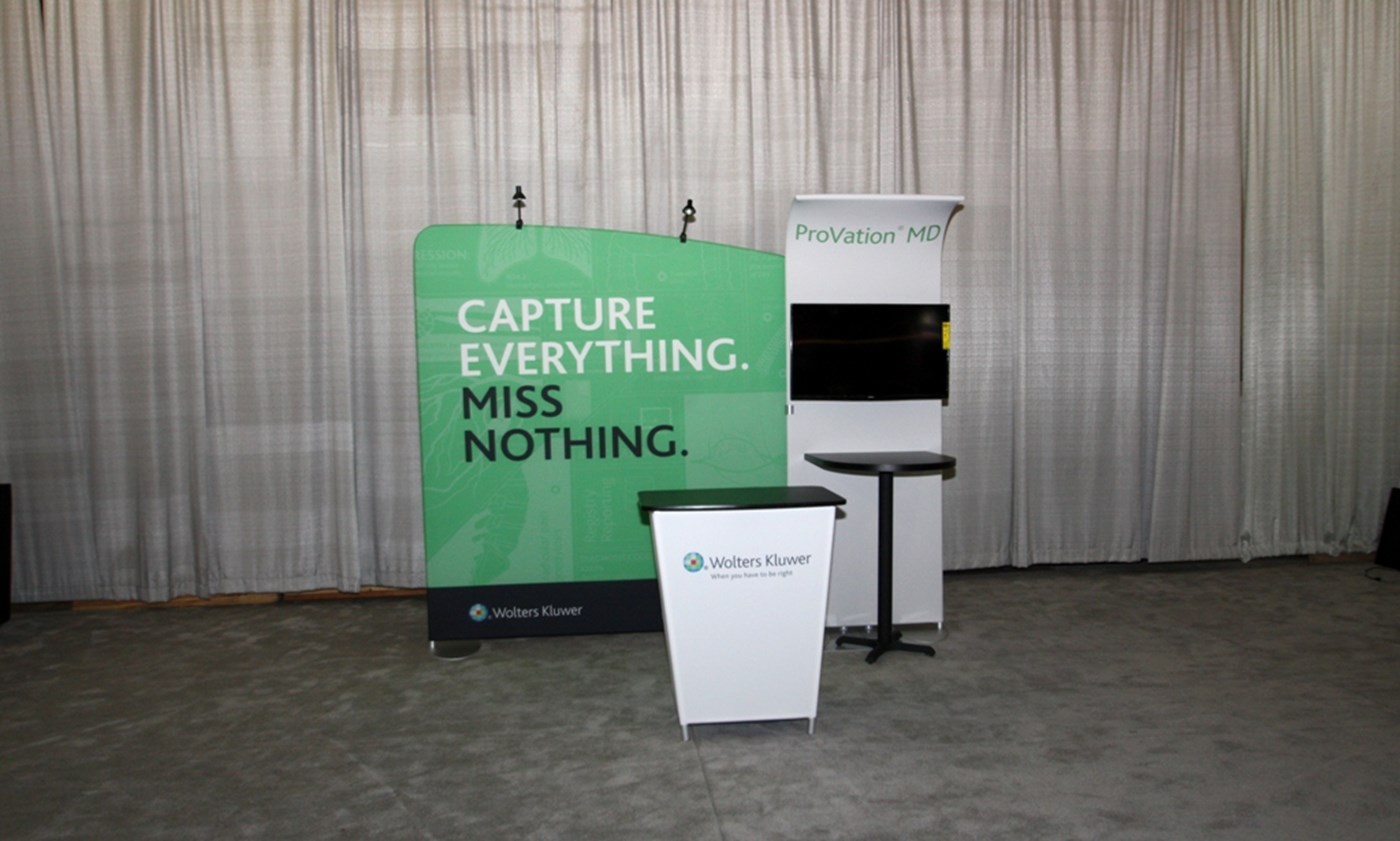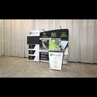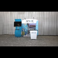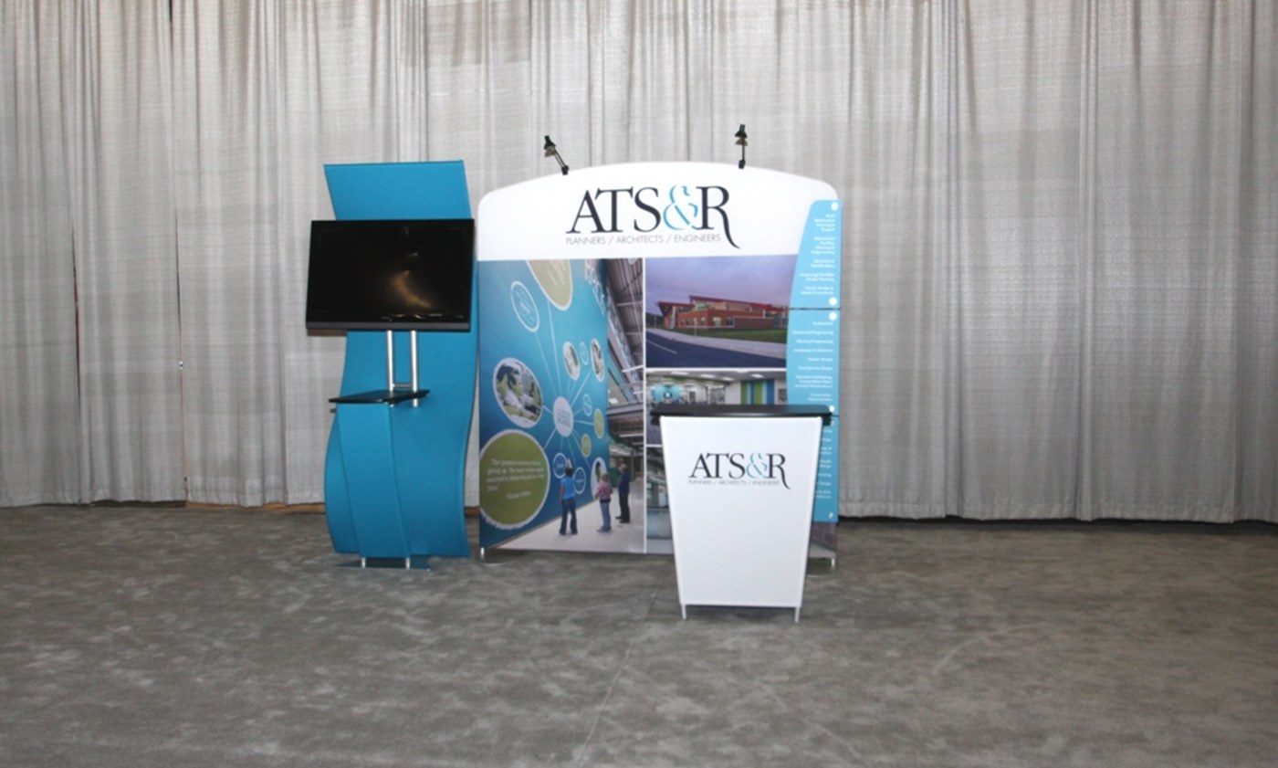 33" Tapered IMPACT counters are quality constructed of labeled & shock-corded, push-pin aluminum tubes, dye-sublimation HD tension fabric graphic wrap with light-blocker, black top with wire-management hole, rear sliding doors and internal shelves in sturdy base. Rolling shipping case included.