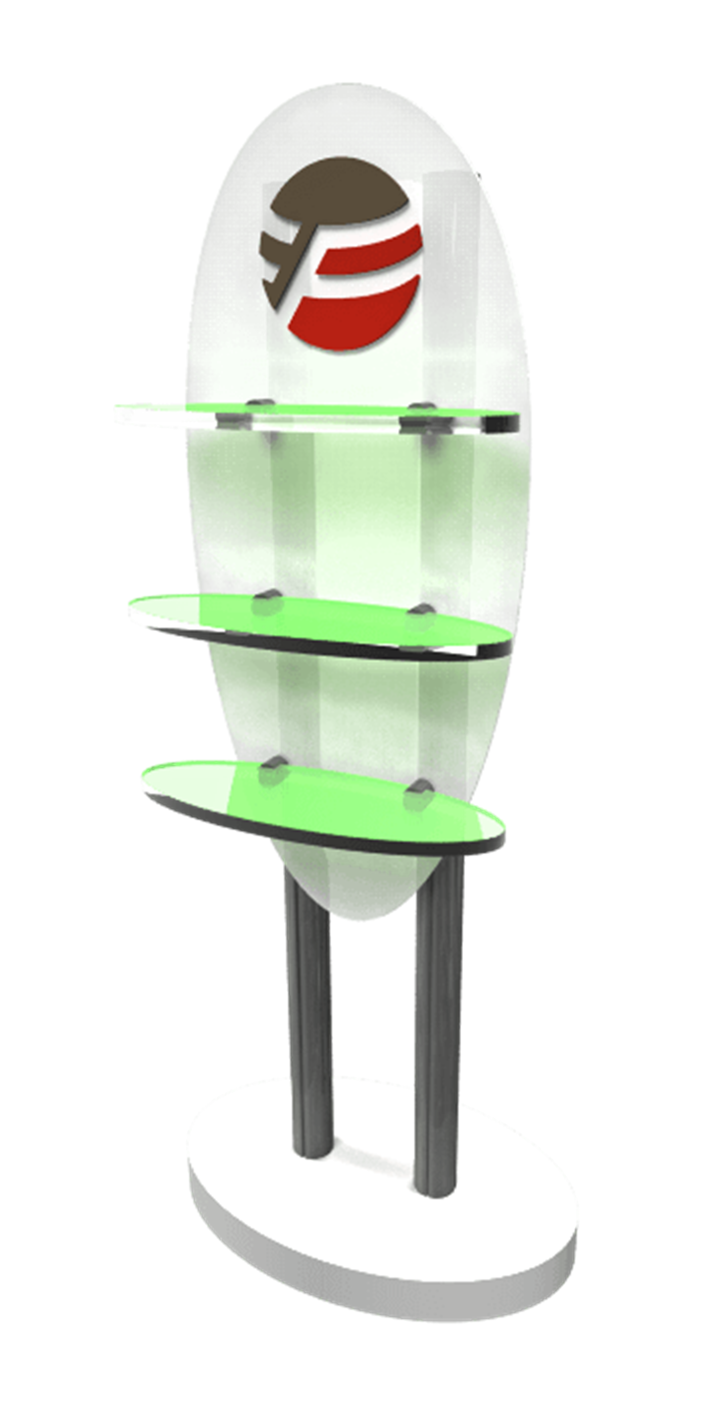 Custom kiosk with oval graphic backing, adjustable acrylic shelving and custom base.