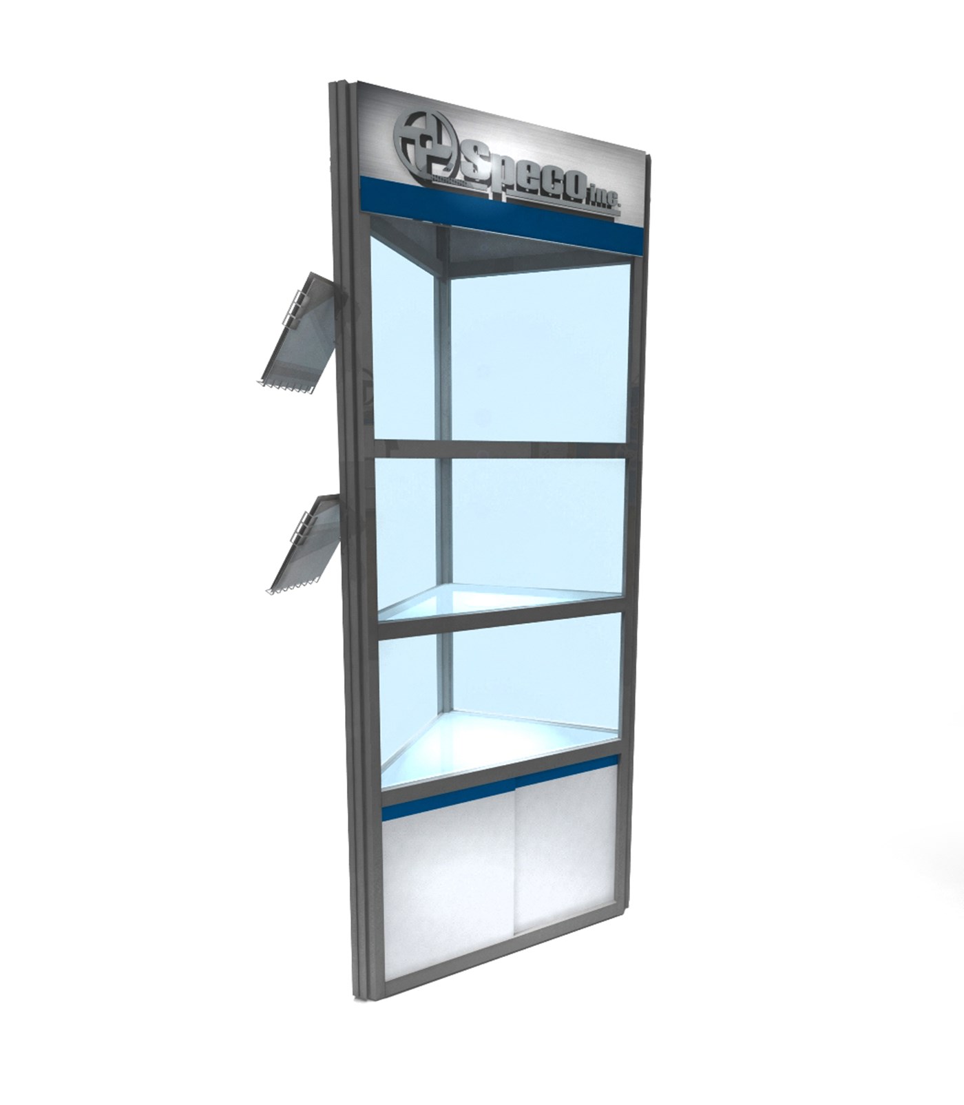 PAWKUTEK3684 36" x 84" Upright Triangular Enclosed Kiosk $5,300 - $6,050 Upright triangular enclosed kiosk with acrylic shelving, sides and branded header.