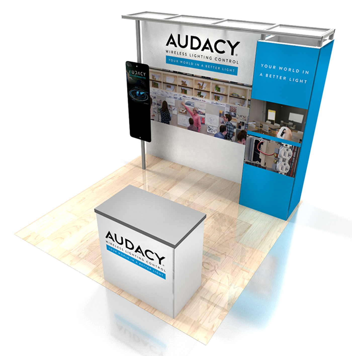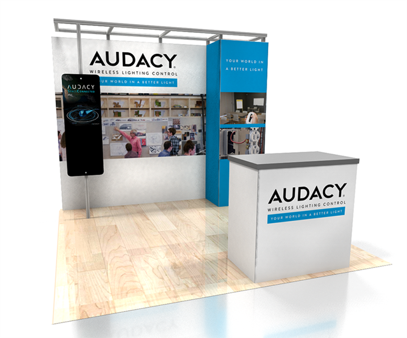 Optional rental items include engineered aluminum extrusion ceiling canopy and 44" x 24" key-less locking standard counter with graphic.
