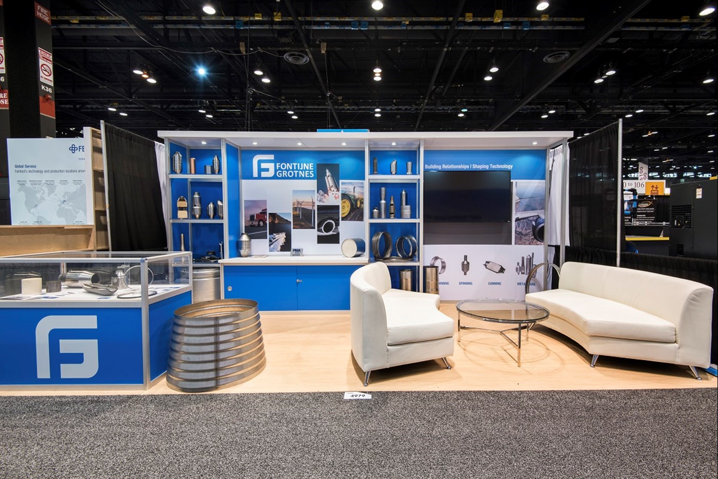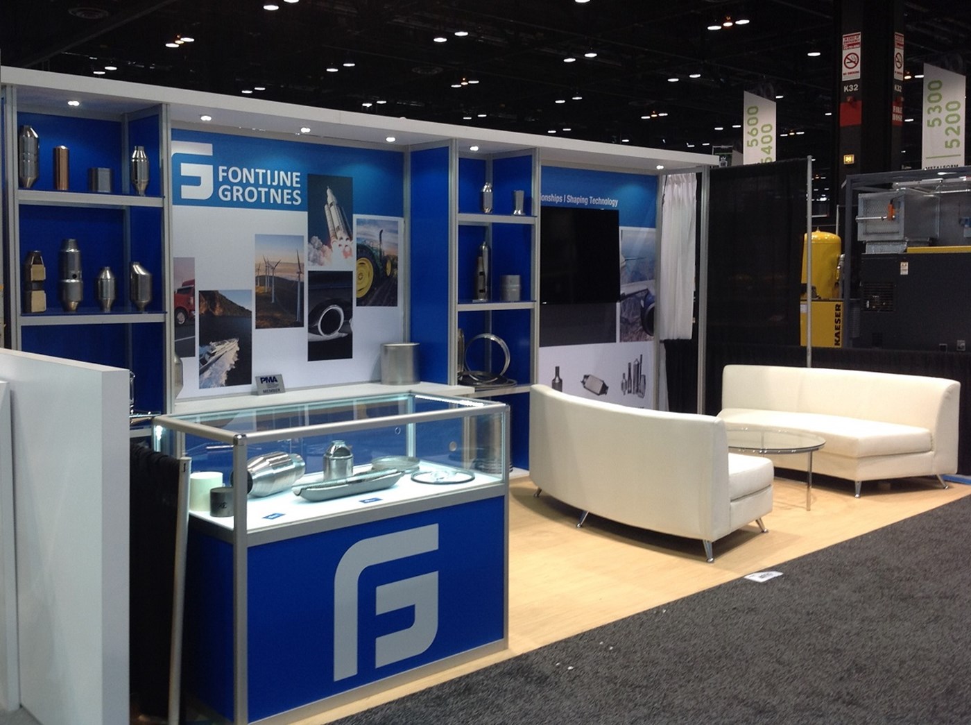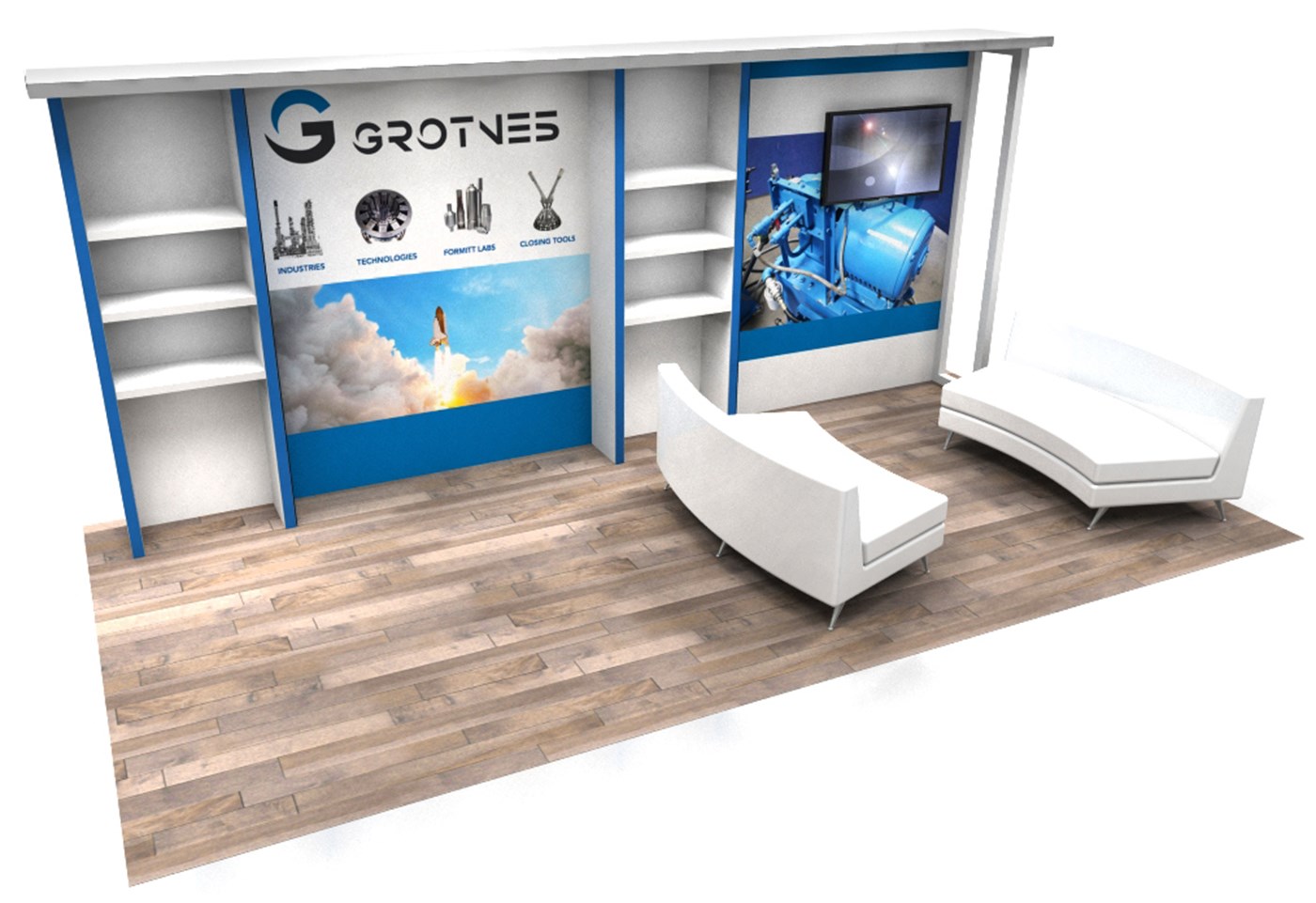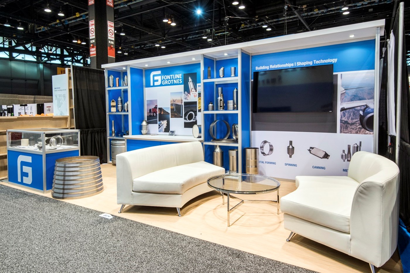 Traditional rental exhibit with impact branding, integrated shelving and canopy.