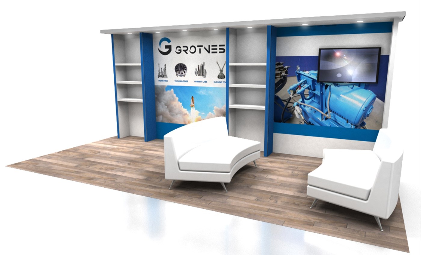 8' Tall backwall with tension fabric graphics, white laminated ceiling canopy & repositionable magnetic LED down-lighting.