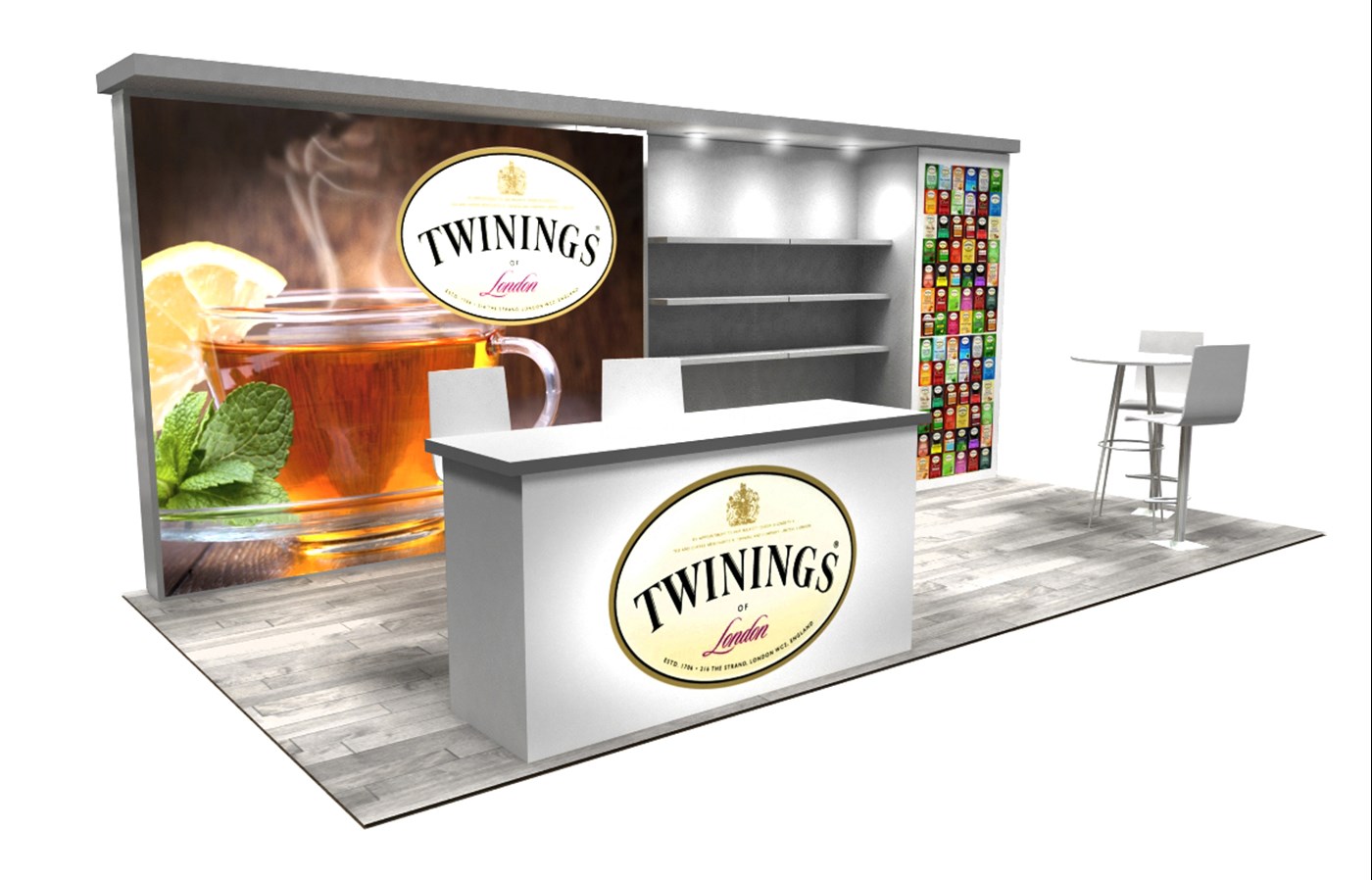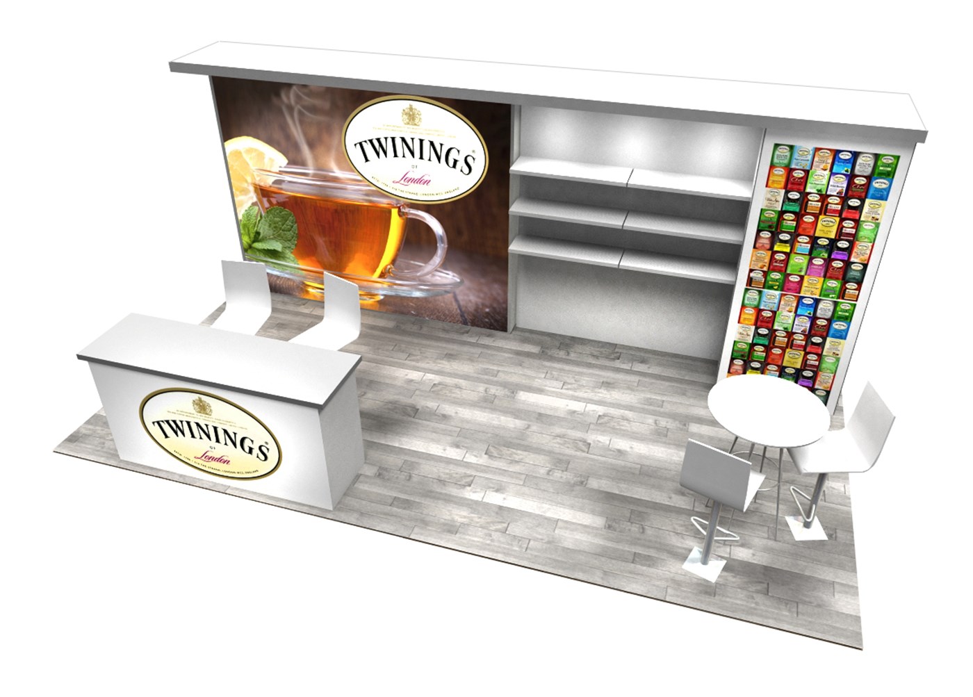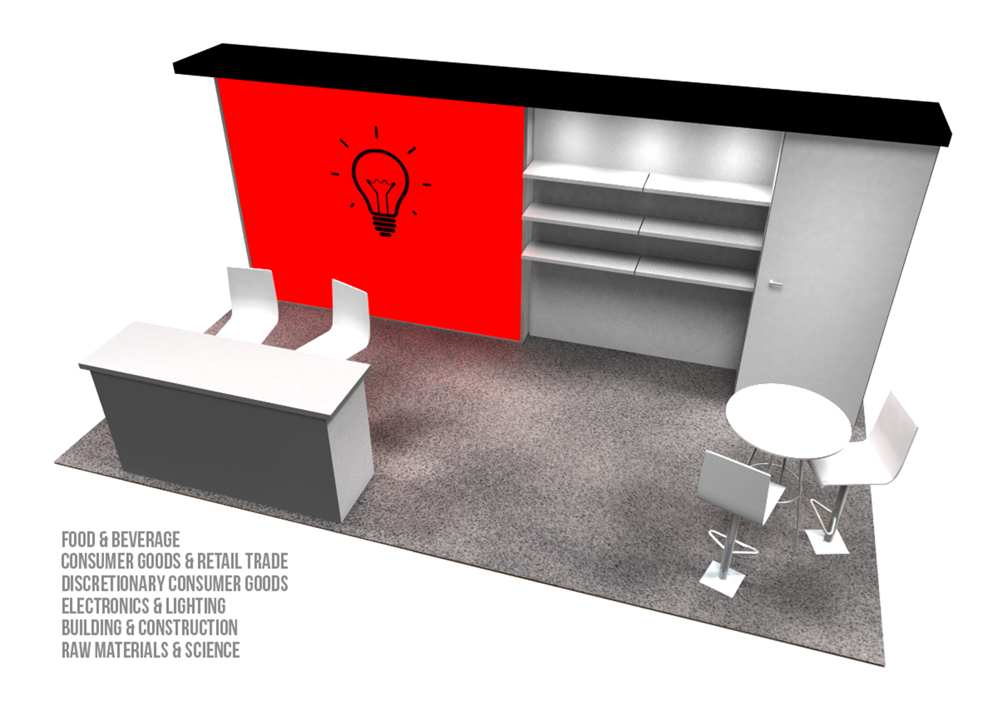 Optional rental items include (6) 39" x 12" white laminated shelves and 81" x 24" key-less locking double-wide counter with graphic & white or black accent finish & top.