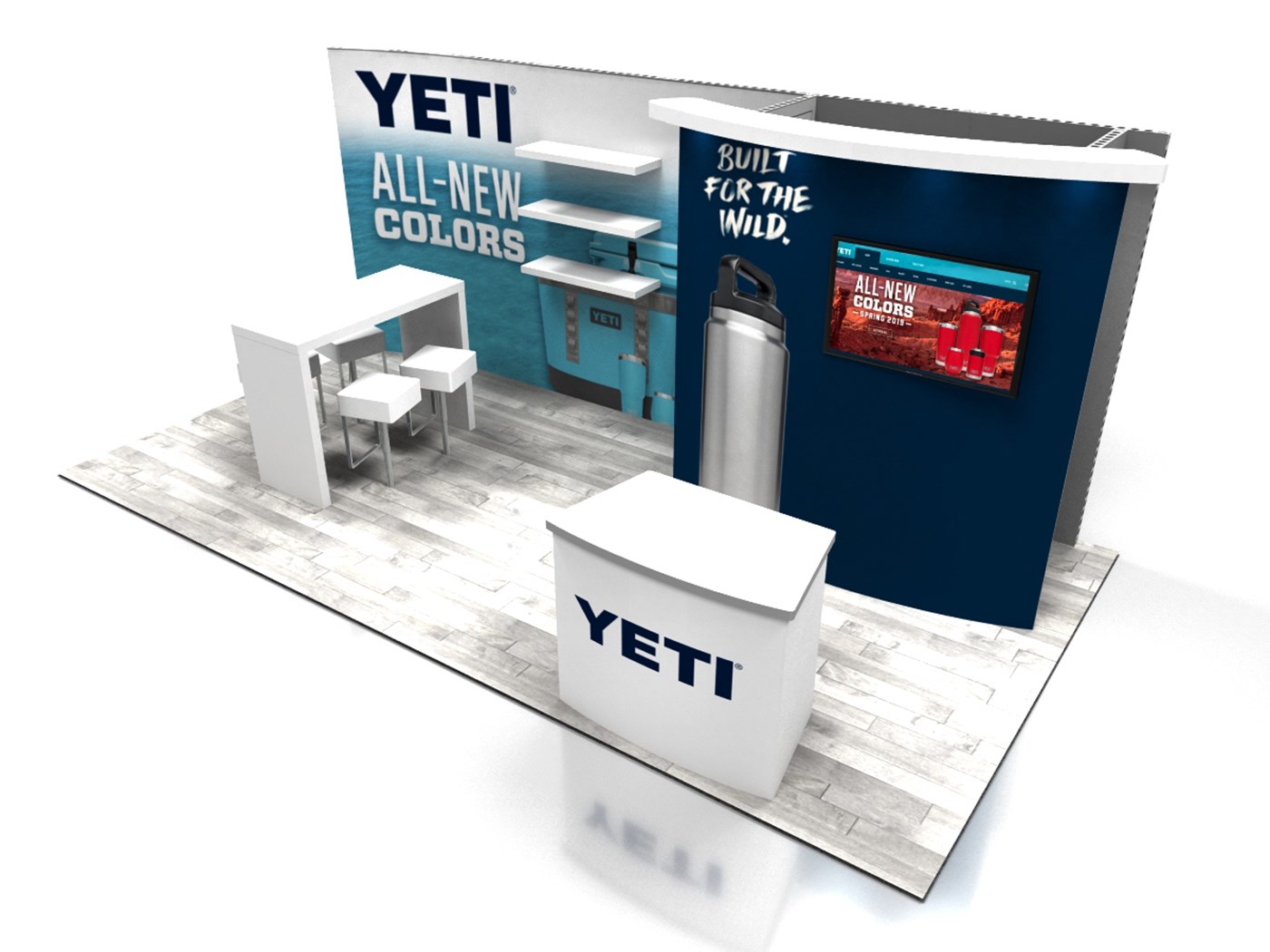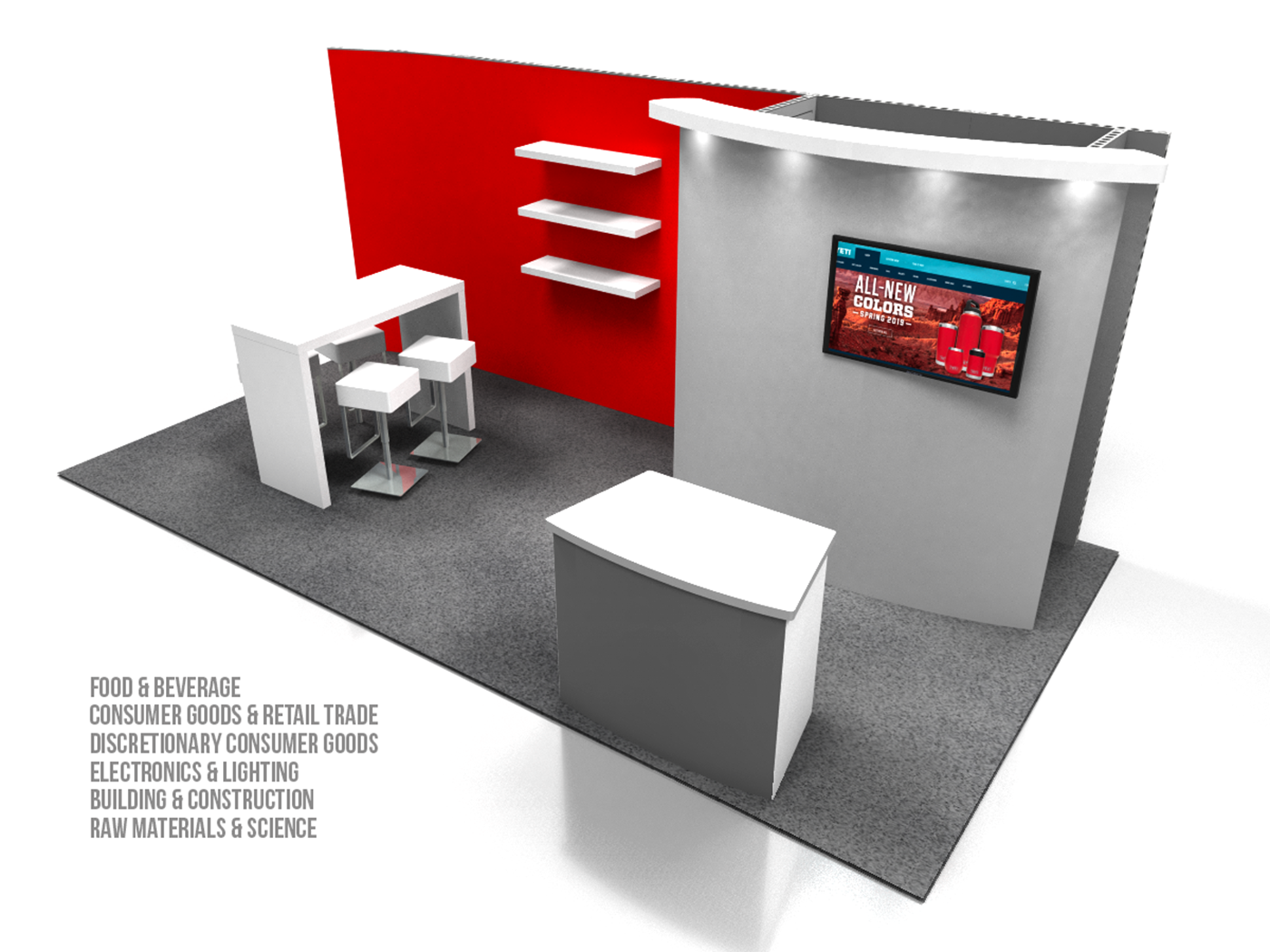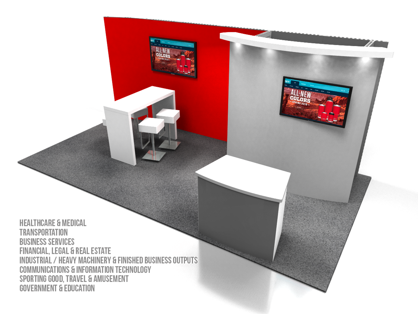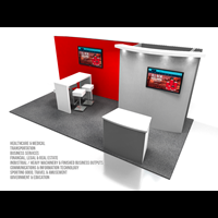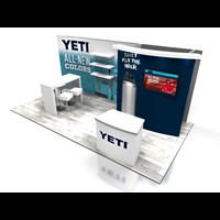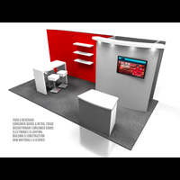 10' x 20' Inline trade show exhibit rental with pre-assembled aluminum FOUNDATION framing for tool-less installation and custom appearance. Dye-sublimation SEG tension fabric graphics printed in-house for superior edge-to-edge look and taut appearance.