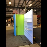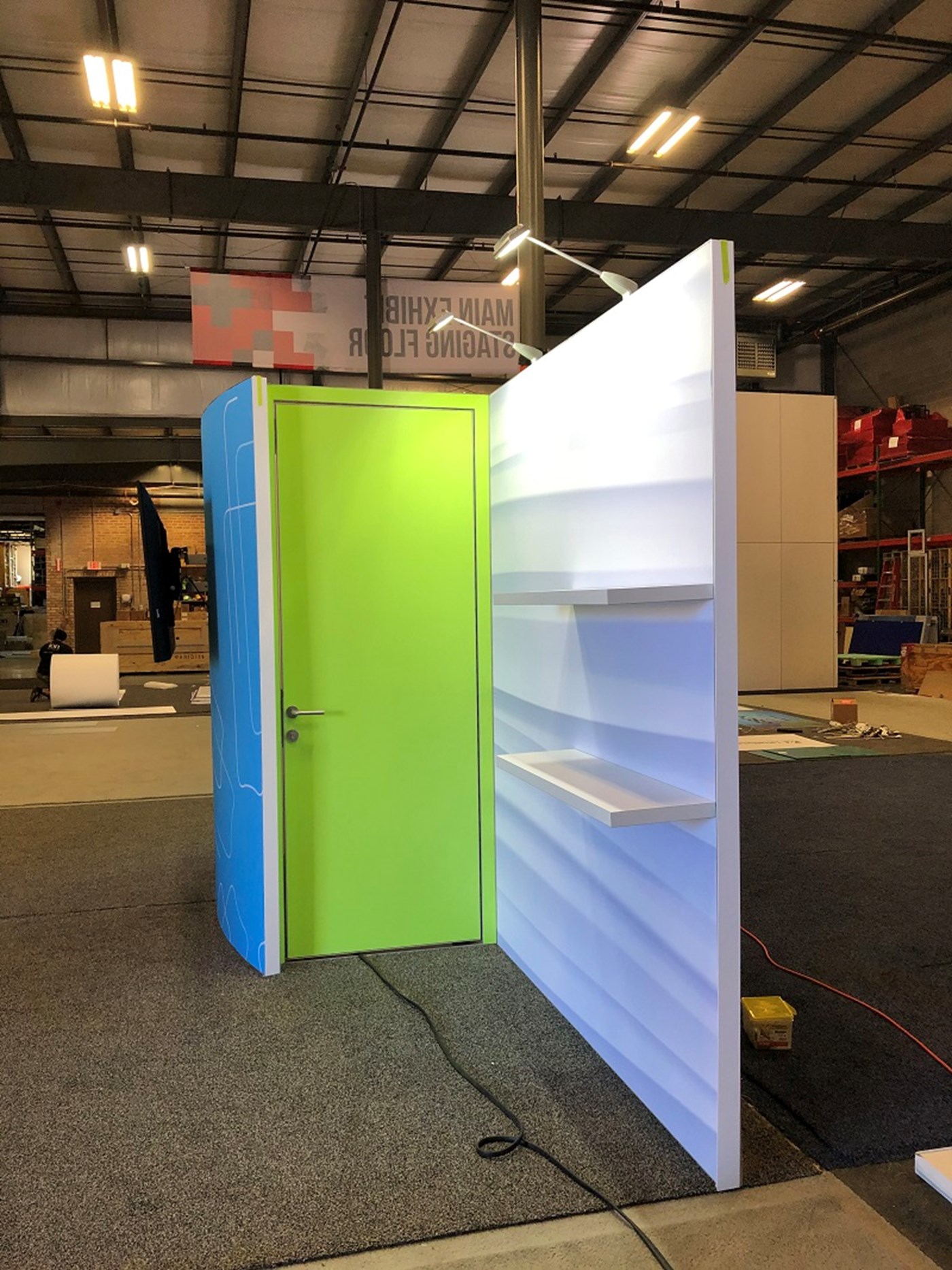 8' Tall backwall with dye-sublimation SEG tension fabric graphics, curved 6.5' x 4' walk-in storage room and free standing 4-tier shelving unit and LED stem lights.