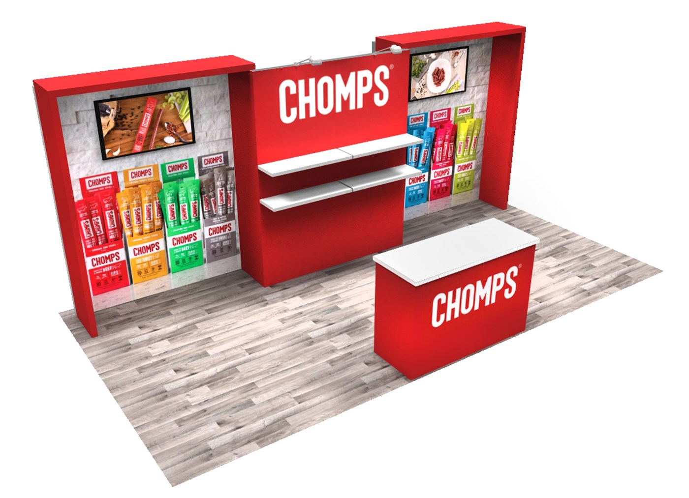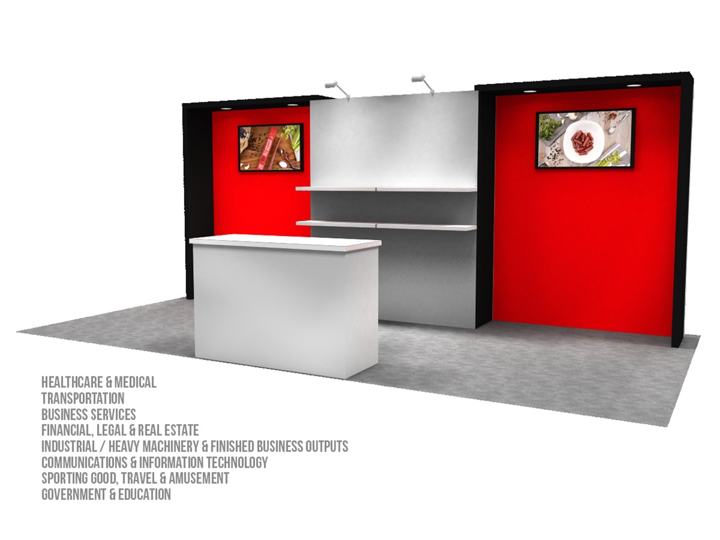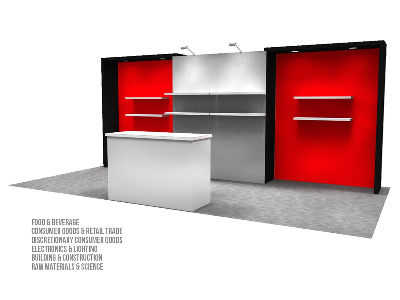 Optional rental items include (4) 39" x 12" white laminated shelves and 60" x 24" key-less locking double-wide counter with graphic & white or black accent finish & top and perimeter trim and return graphic accents.