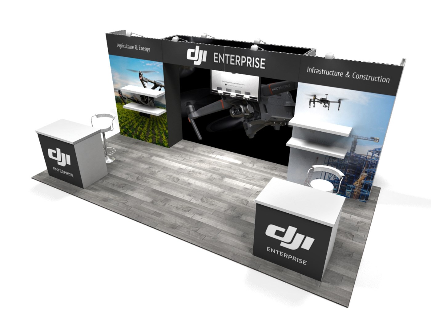 8' Tall recessed backwall with (3) tension fabric graphic sections and bridge header graphic.