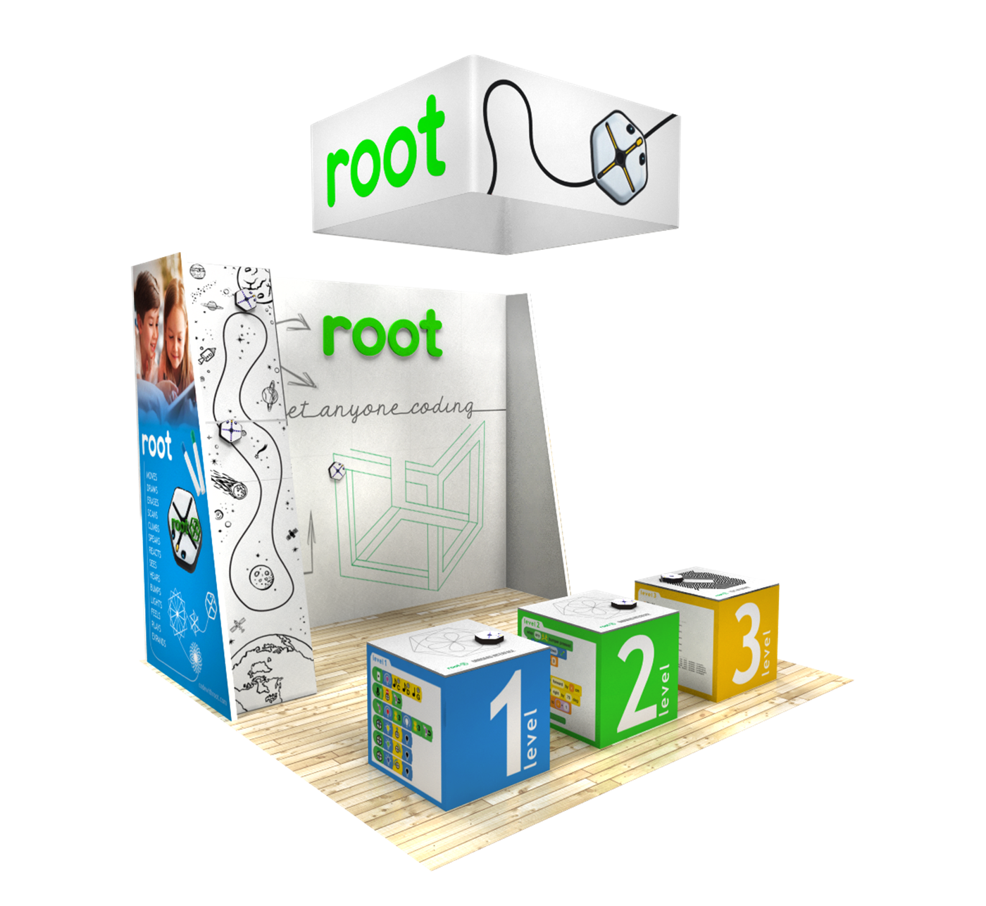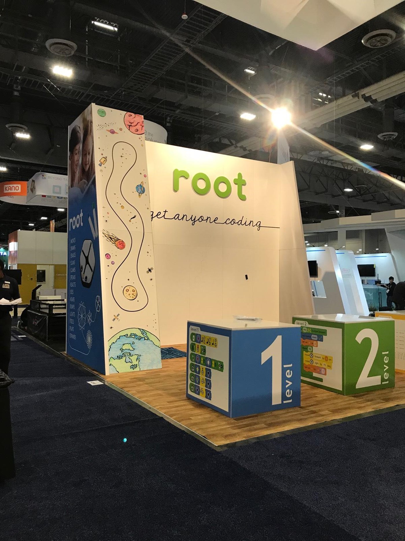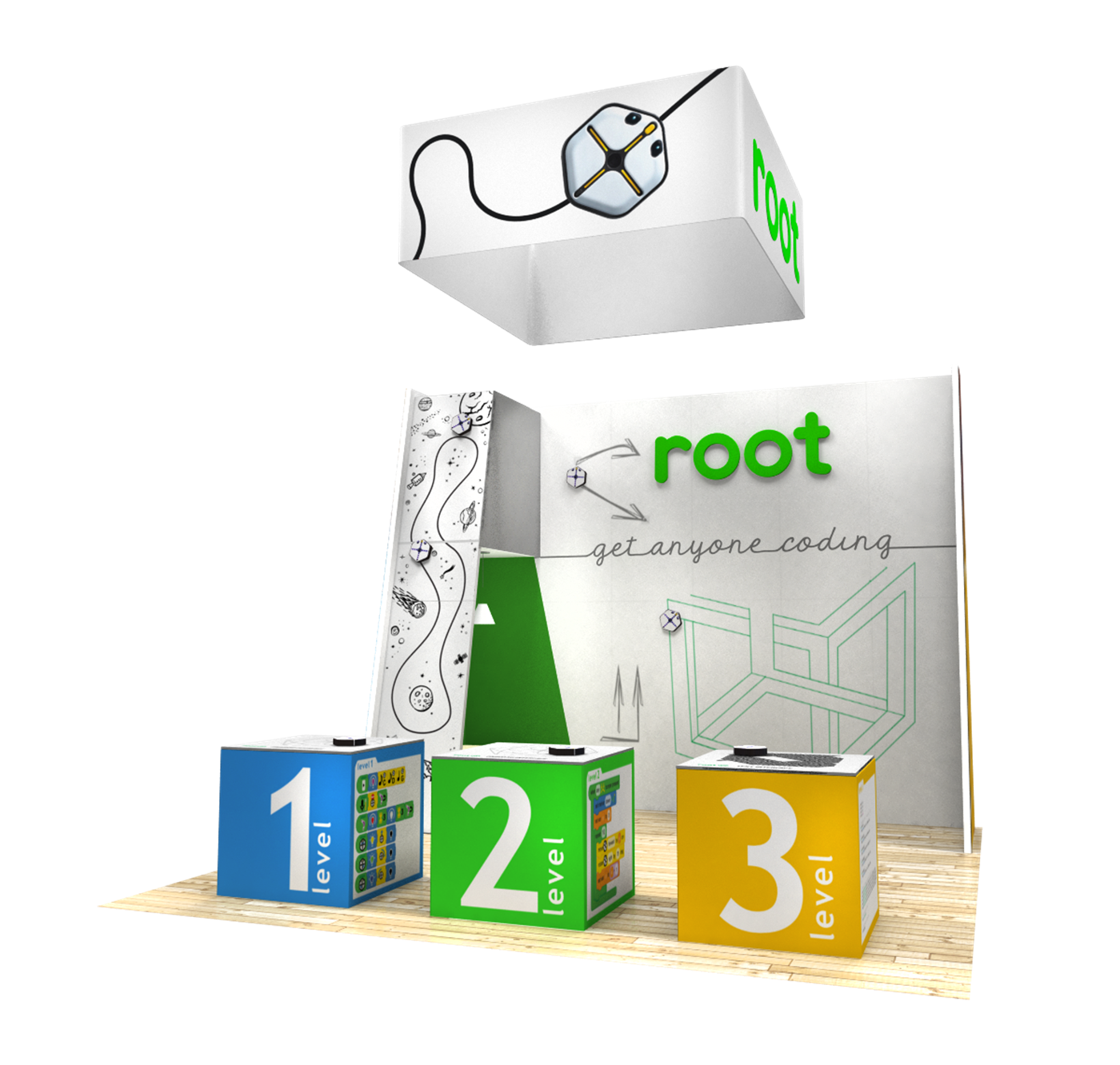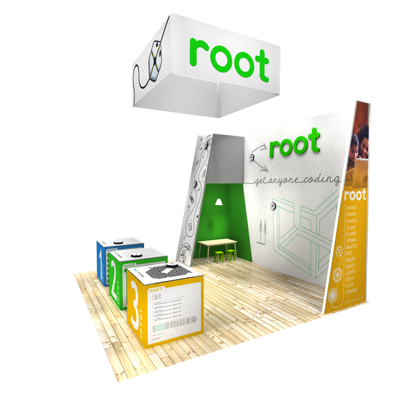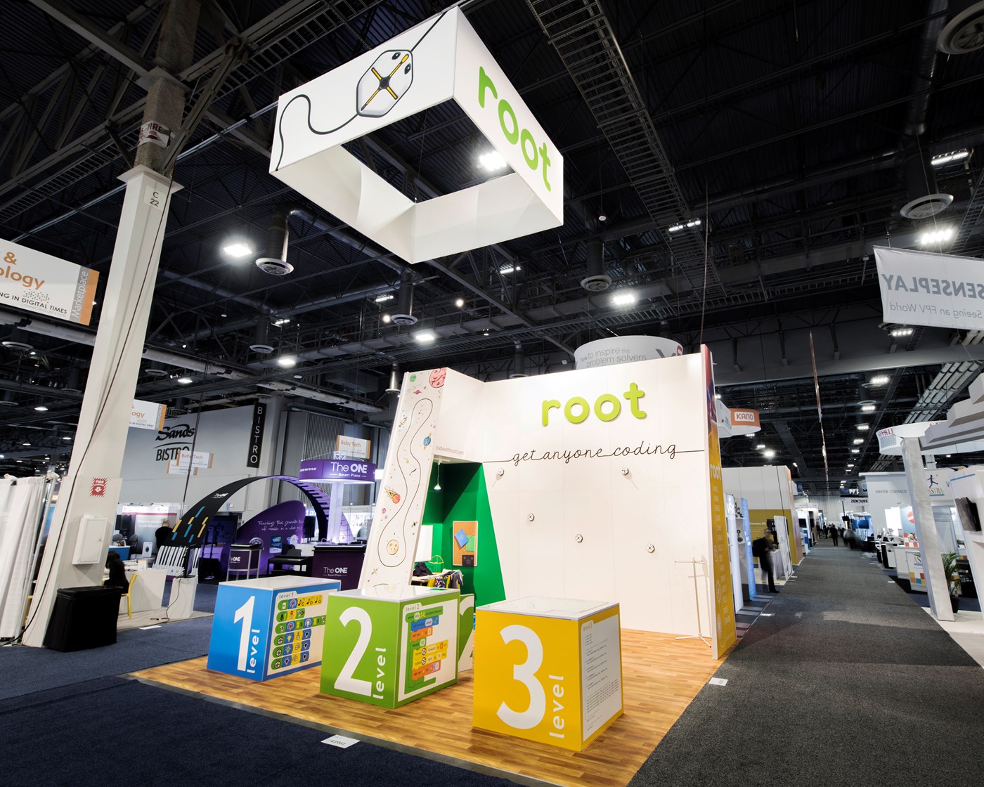 Exhibit shown with custom magnetic white board back-wall and dimensional logo not included.