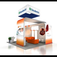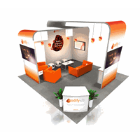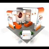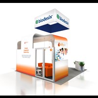 20' x 20' Rental island trade show exhibit fabricated with pre-assembled aluminum FOUNDATION framing for tool-less installation and custom appeal. Large format graphics printed in-house for excellent color saturation and taut finish.