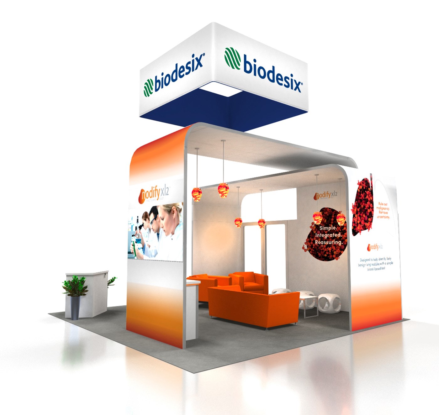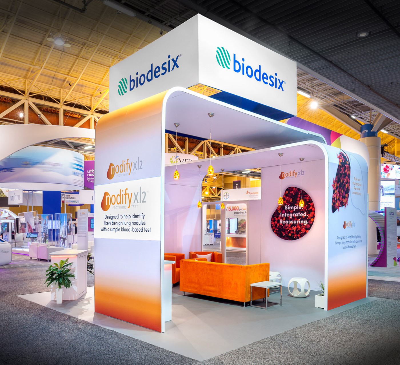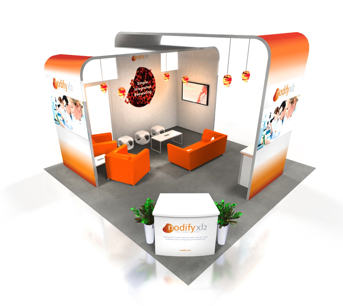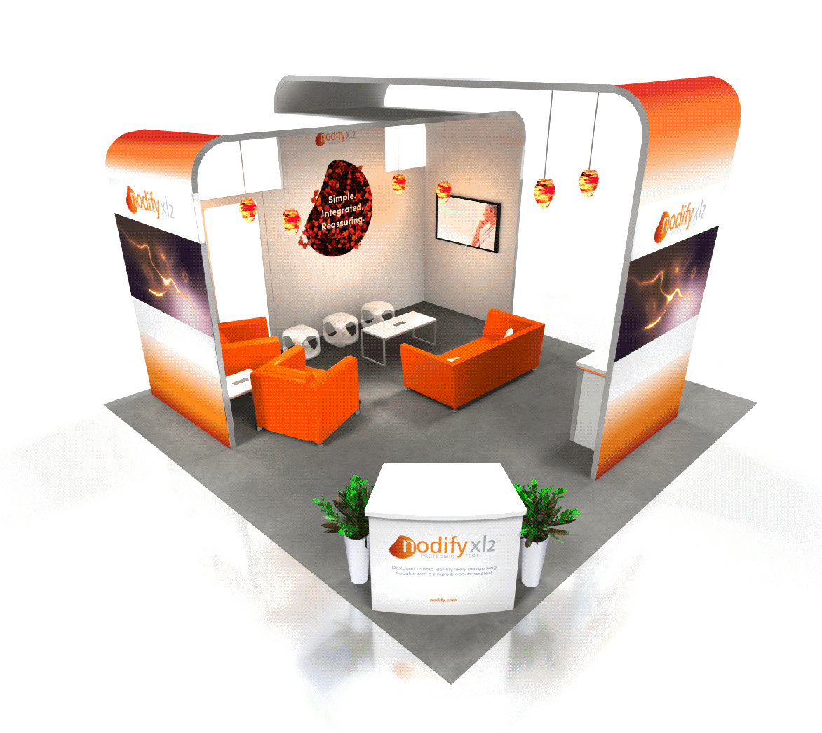 12' and 14' Tall ceiling canopies, perimeter walls with dye-sublimation SEG tension fabric graphics. Semi-private lounge area with graphics and acrylic walls.