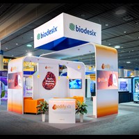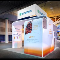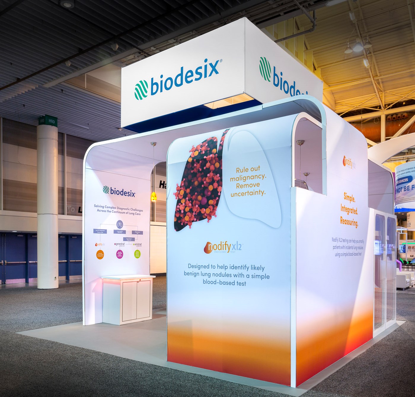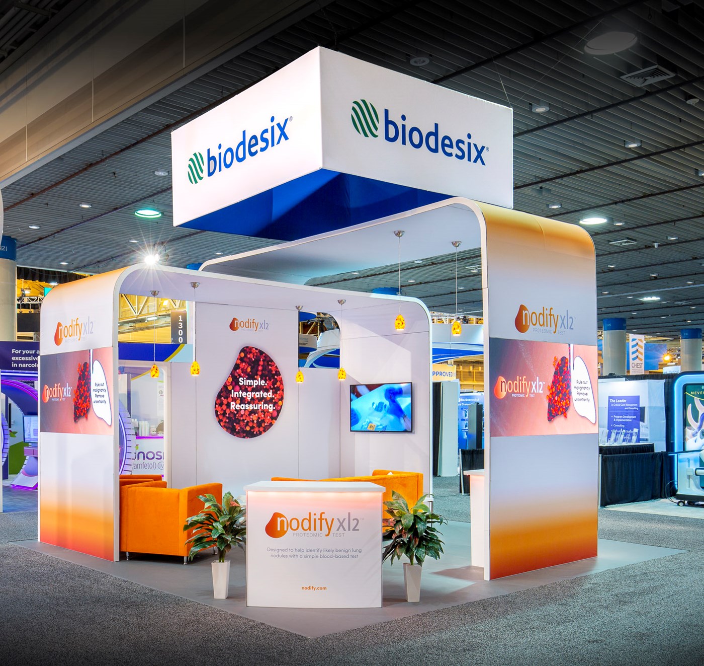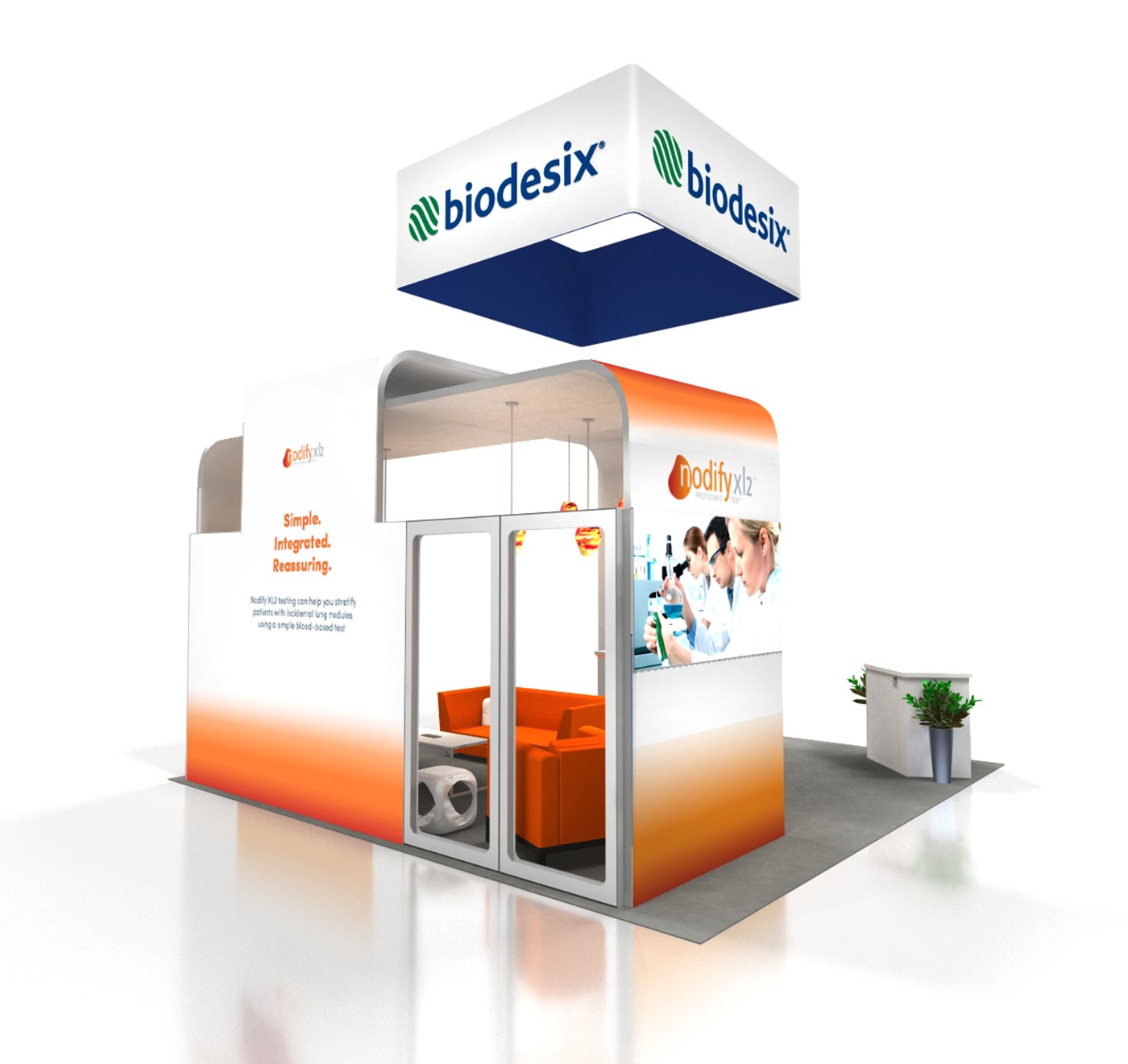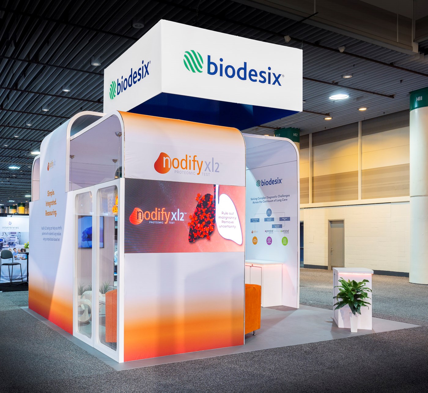 12' and 14' Tall ceiling canopies, perimeter walls with dye-sublimation SEG tension fabric graphics. Semi-private lounge area with graphics and acrylic walls.