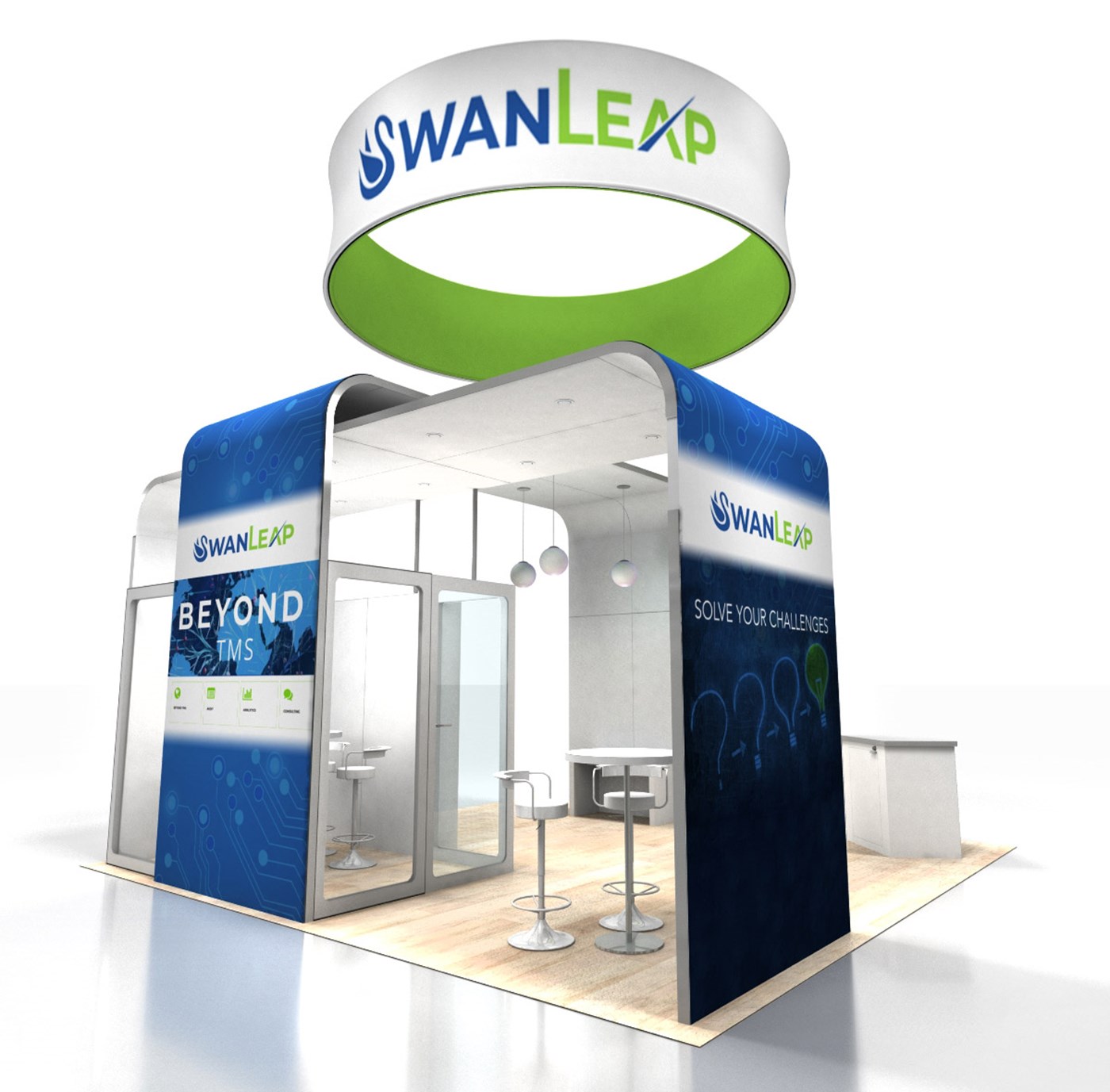 20' x 20' Rental trade show exhibit designed with pre-assembled FOUNDATION aluminum frames for custom appeal and tool-less installation. Large format graphics printed in-house for superior color saturation and taut finish.